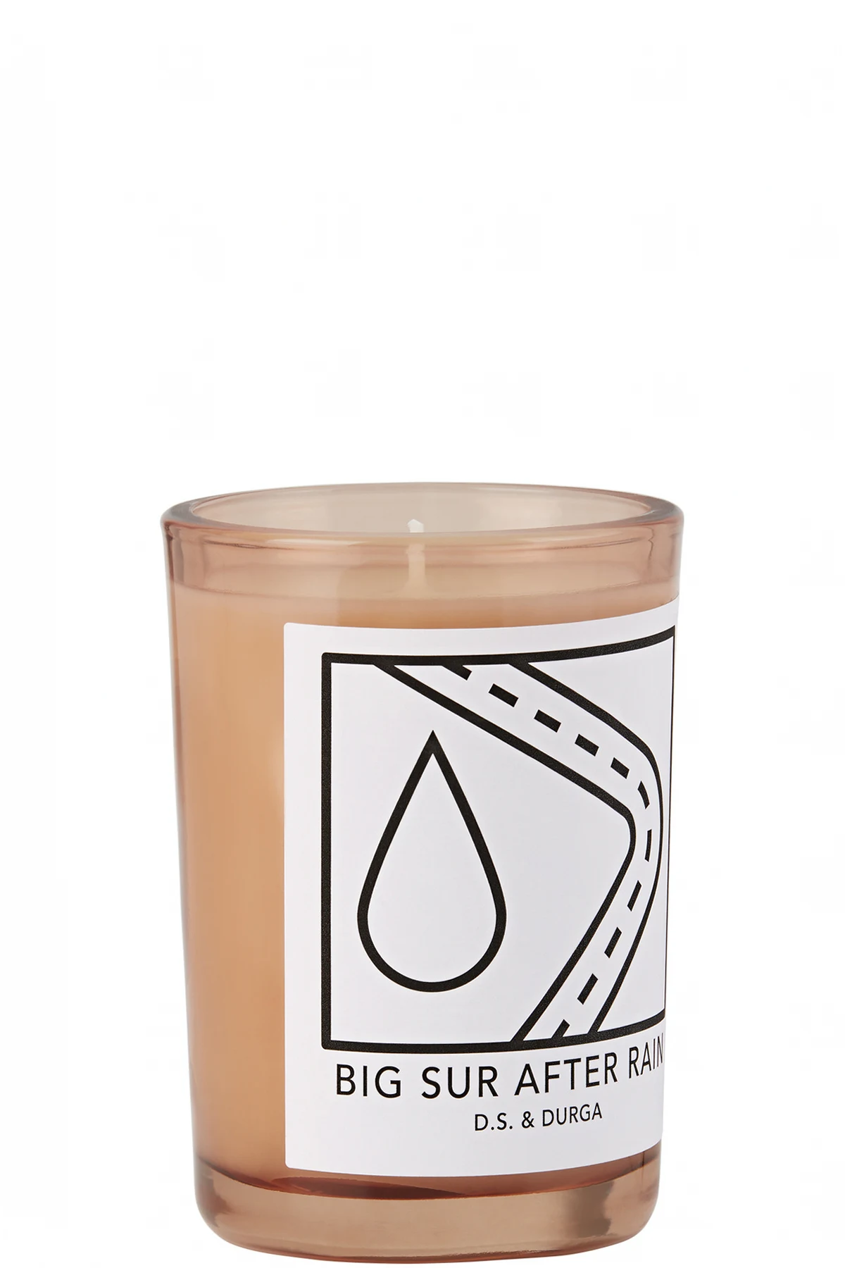 Scented wax candle in Big Sur After Rain. Features top notes of rain and eucalyptus shoot. Heart notes of magnolia. Base notes of eucalyptus leaf and wet wood. Glass vessel in orange.