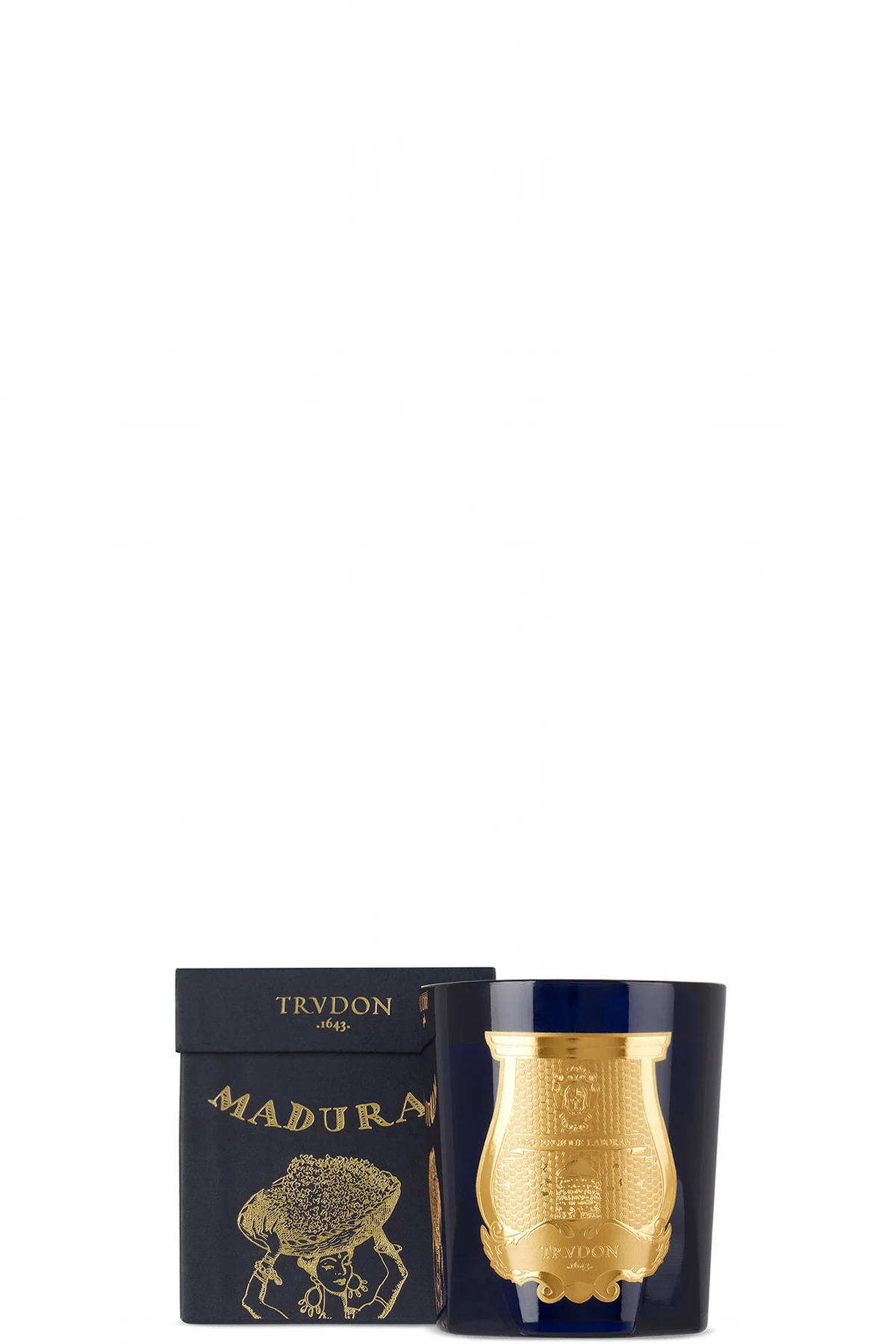 Hand-poured wax candle in Maduraï scent. Handcrafted glass vessel in blue.