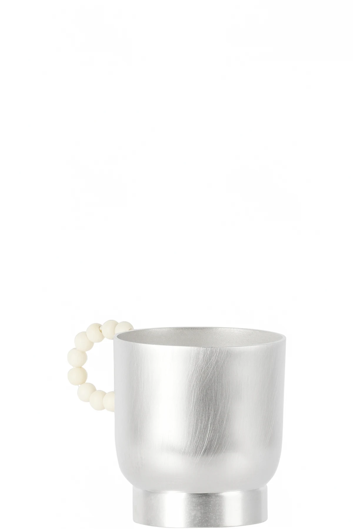 Handcrafted tea cup in sterling silver-plated metal. Beaded quartz handle in white.