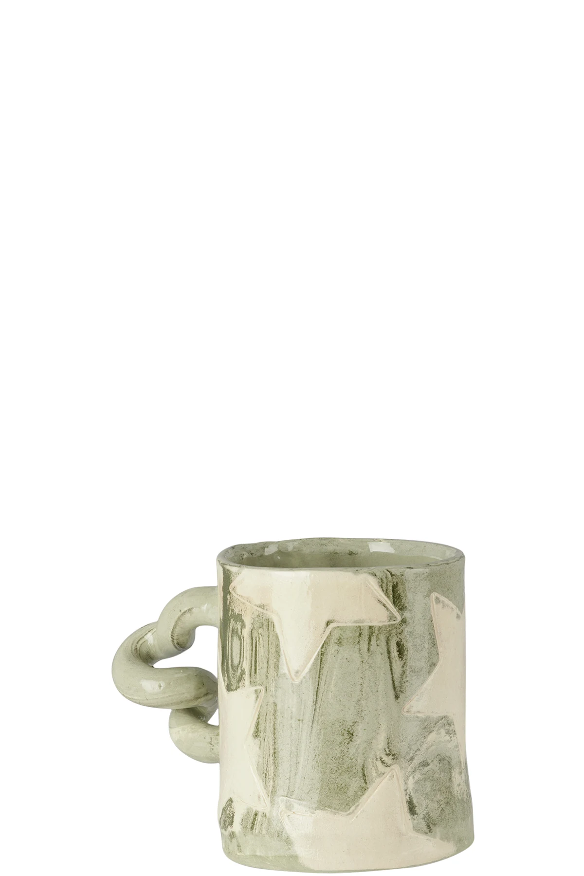 Handcrafted glazed earthenware mug marbled in green and white. Hand-painted inlaid graphics in white throughout.
