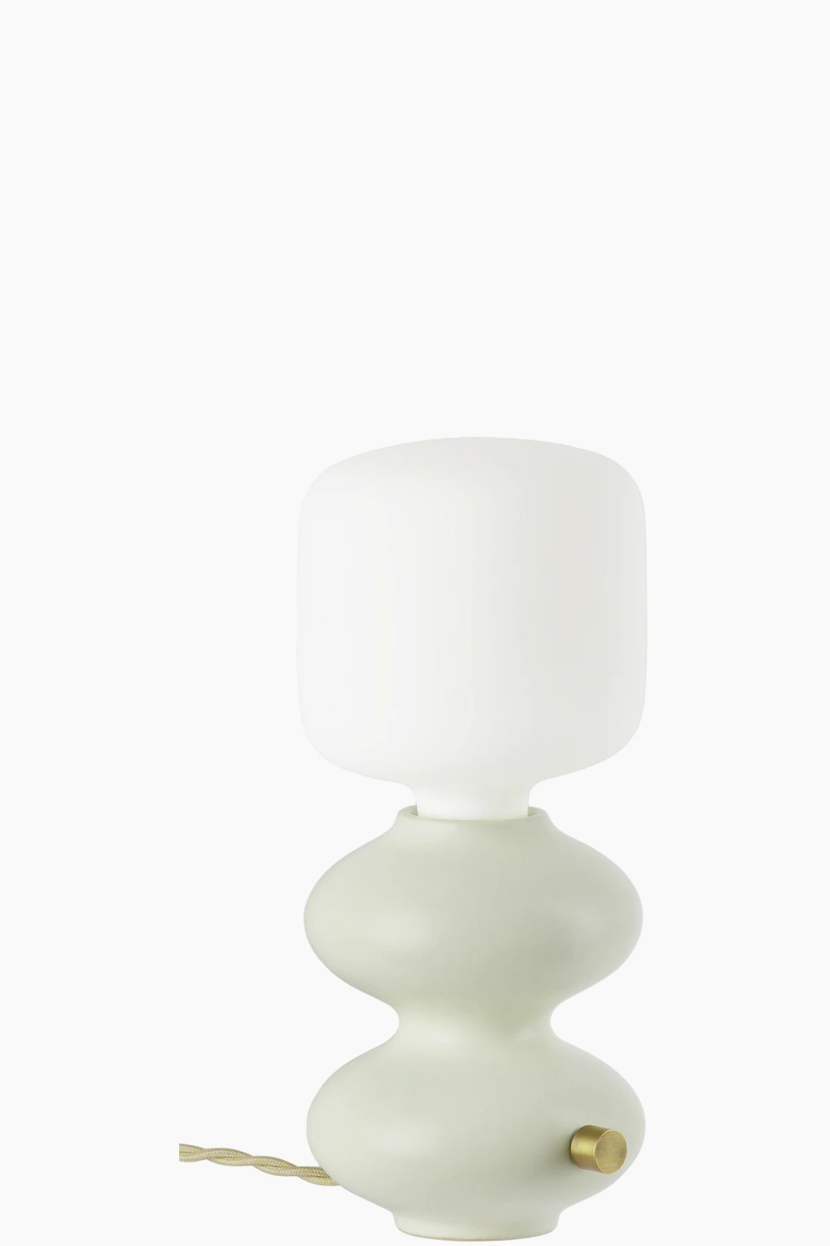 Handcrafted undulating ceramic table lamp in white. Logo-engraved brass plate at base.