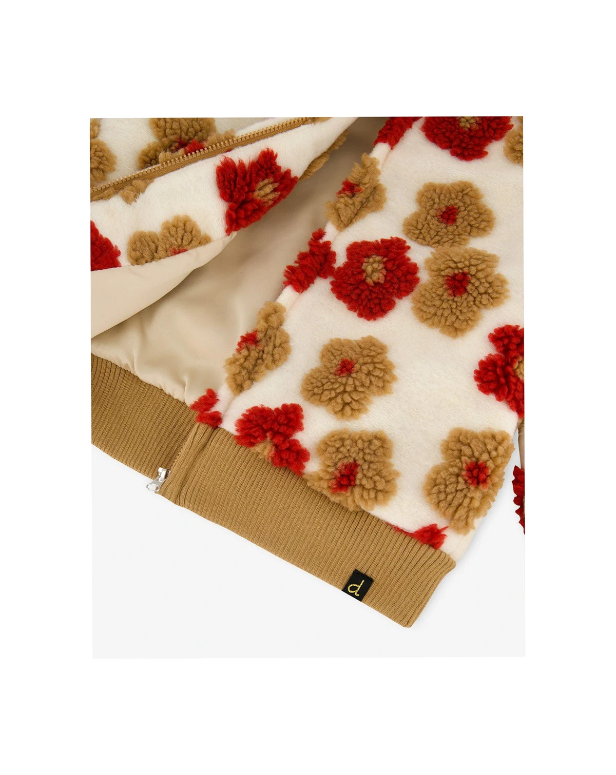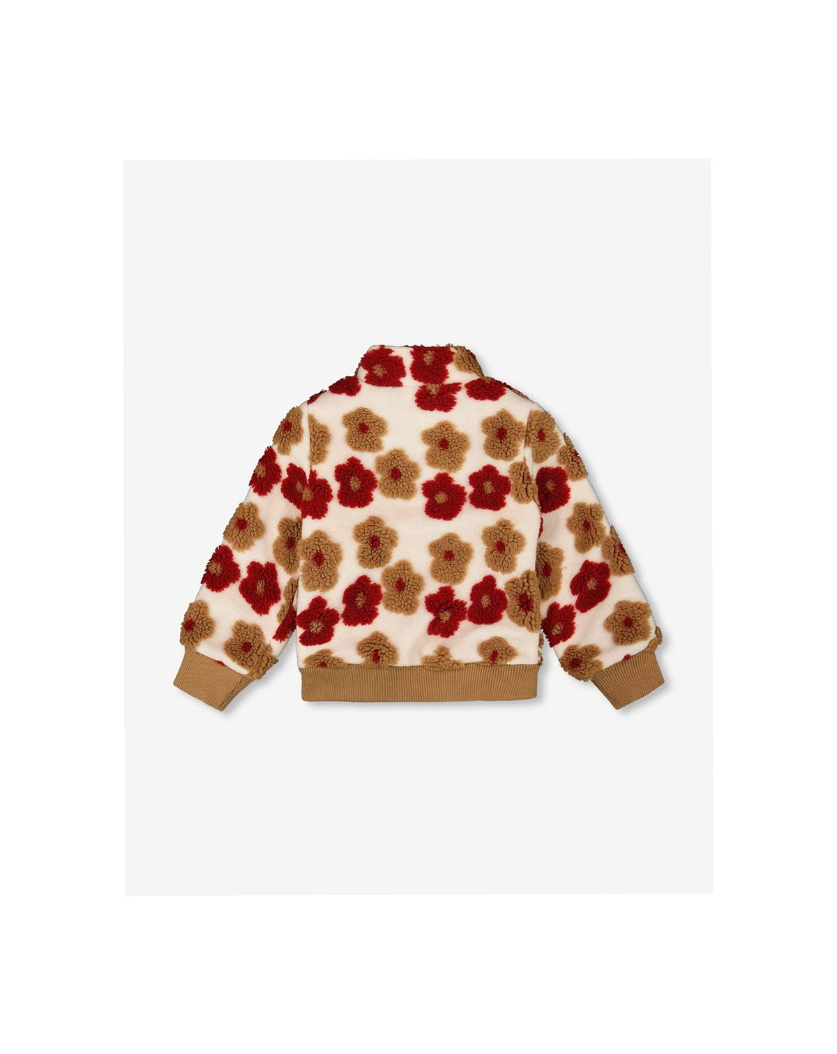 Our Full Zip Sherpa Jacket With Floral Pattern in Beige and Red is a bold blend of retro charm and cozy comfort. This girly zip-up jacket features a plush sherpa texture, a stand collar, and a vibrant allover floral design for standout fall style. Contrast ribbed cuffs and bottom trim and a full-length zipper add a sporty finish to this nostalgic favorite.