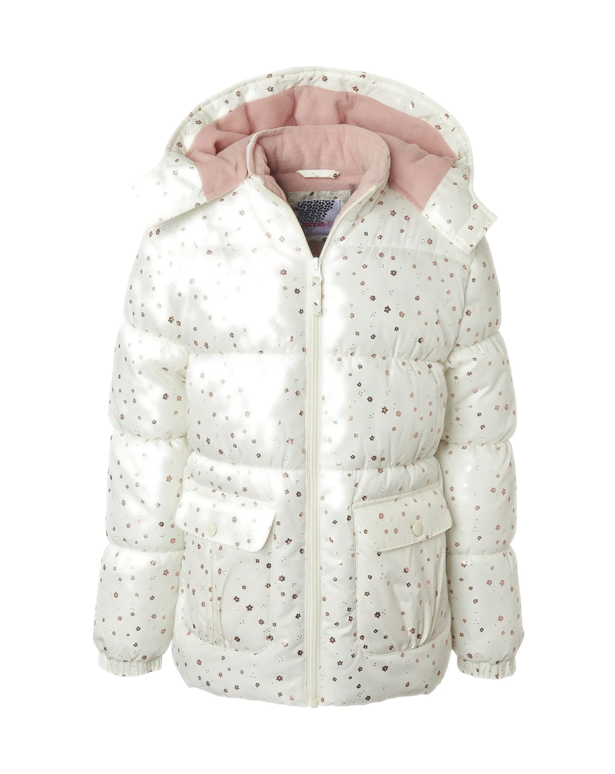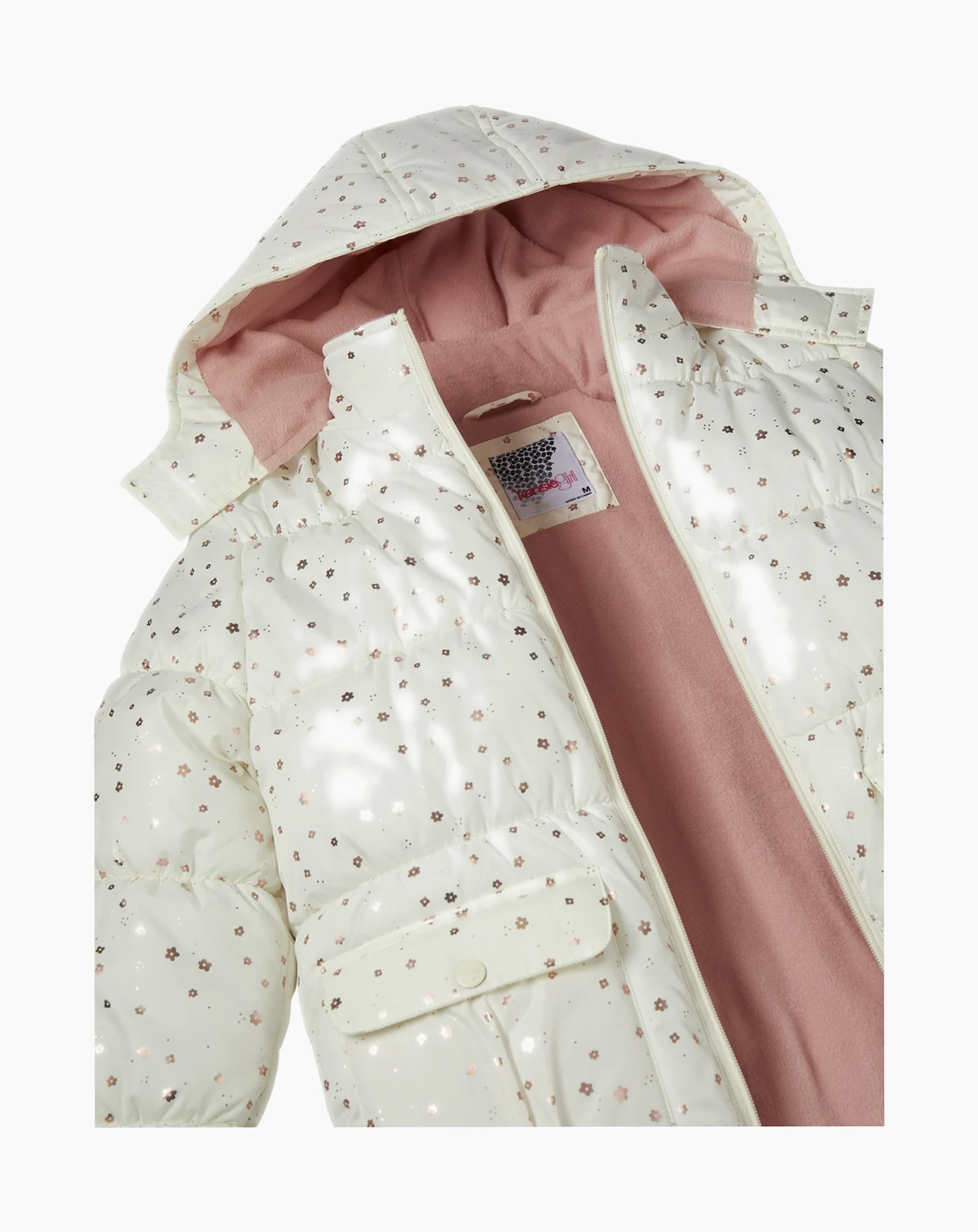 Brighten up chilly days with this puffer jacket by Kensie Girl. Boasting a playful allover foil dot print, it adds shimmer and fun to the winter wardrobe. Designed for warmth and comfort, one offers a flattering fit that keeps her at ease without restricting movement. As a bonus, a cozy sweater-knit hat comes as a gift with purchase.