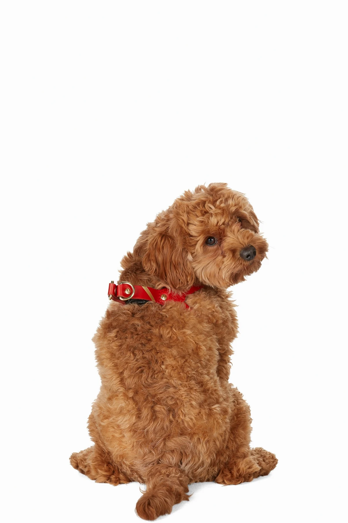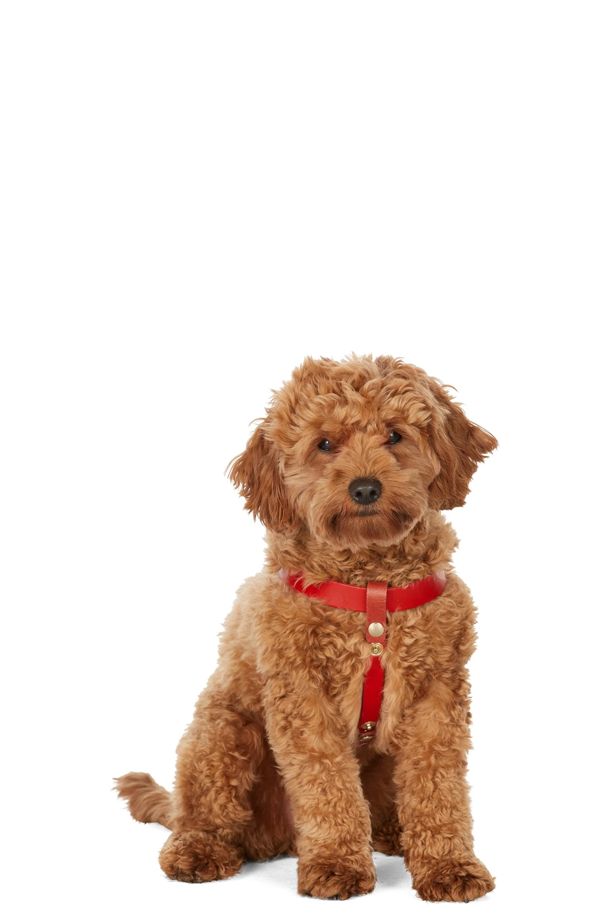 Buffed leather harness in red. Stripe printed in gold-tone and embossed logo at side.