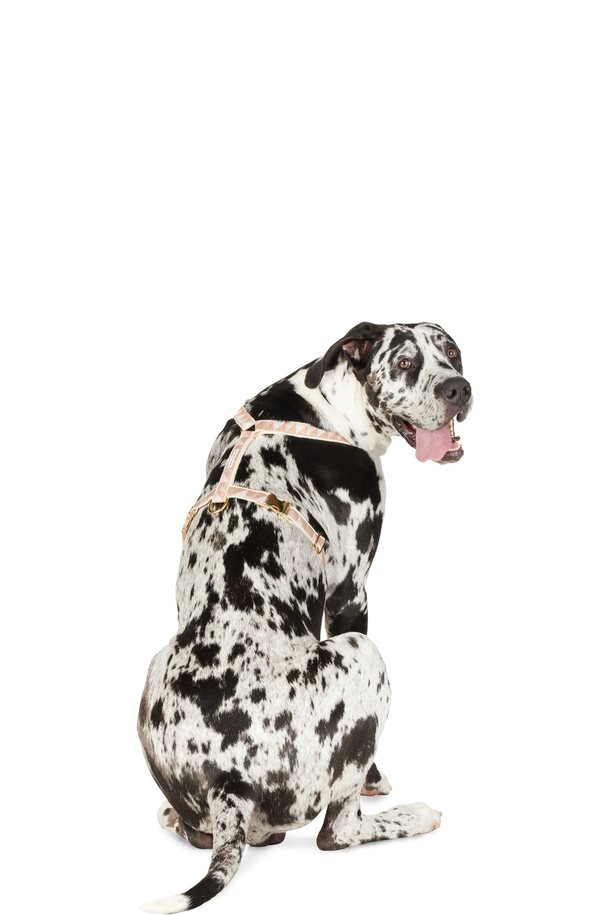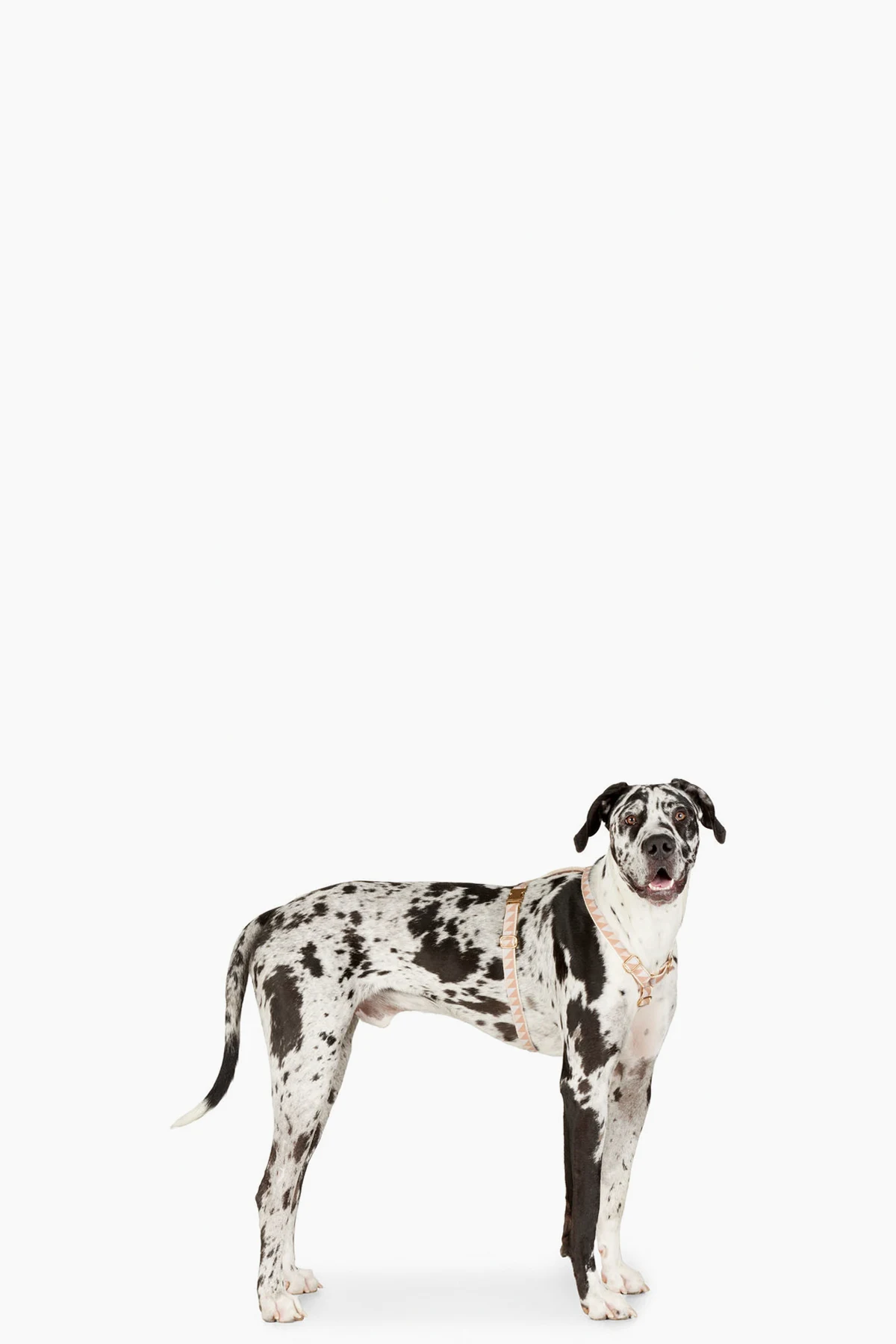 Handcrafted woven hemp harness in off-white. Waxed webbing trim featuring graphic pattern in beige and black at face and back face.