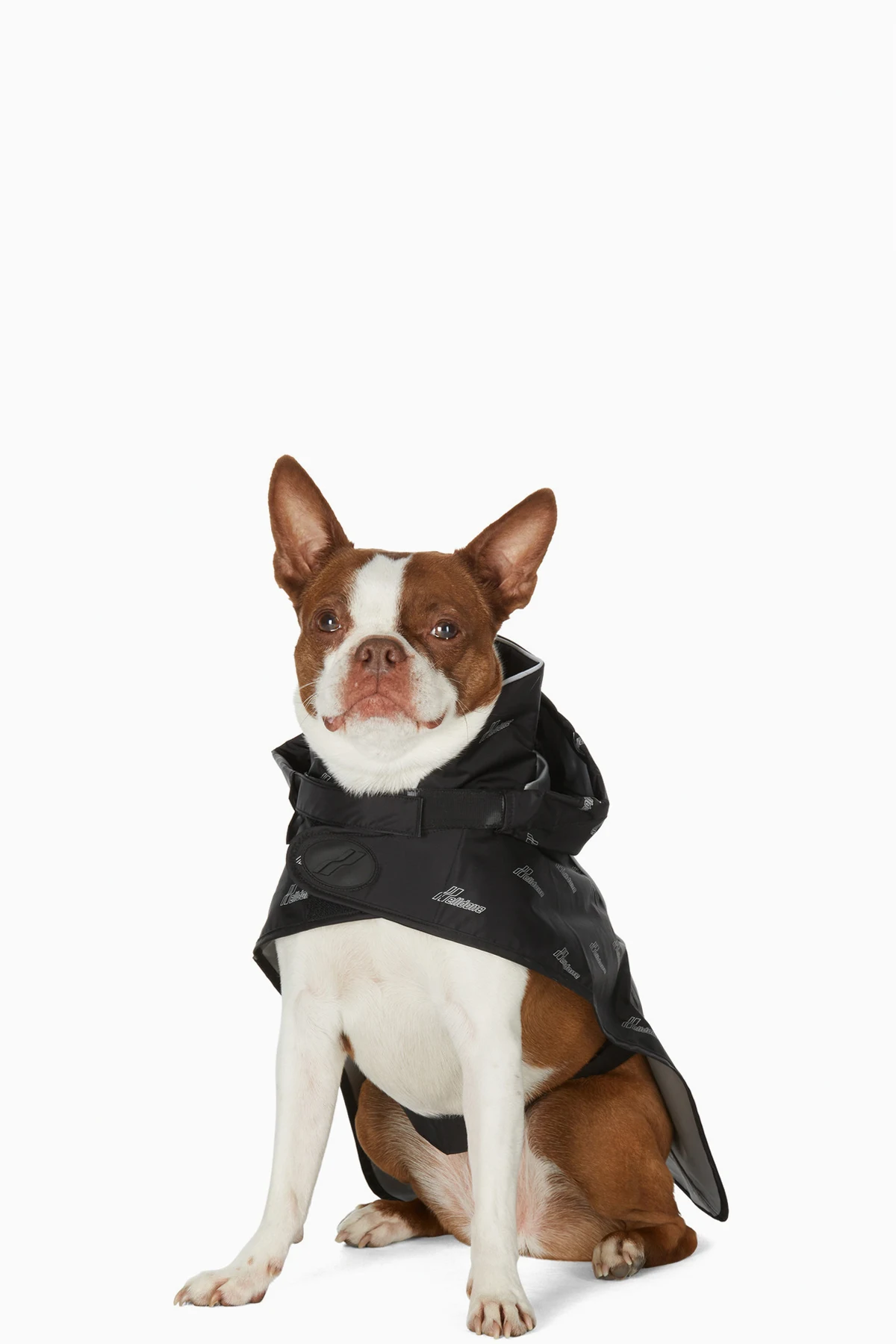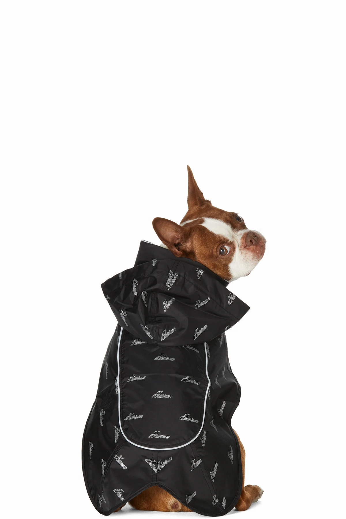 Sleeveless nylon satin jacket colorblocked in black and reflective silver-tone. Logo printed in white throughout. Press-stud fastening at hood for alternate styling. Throat guard featuring rubberized logo patch with Velcro fastening. Adjustable belt-style strap with Velcro fastening at waist. Leash opening at back collar. Unlined. Tonal hardware.