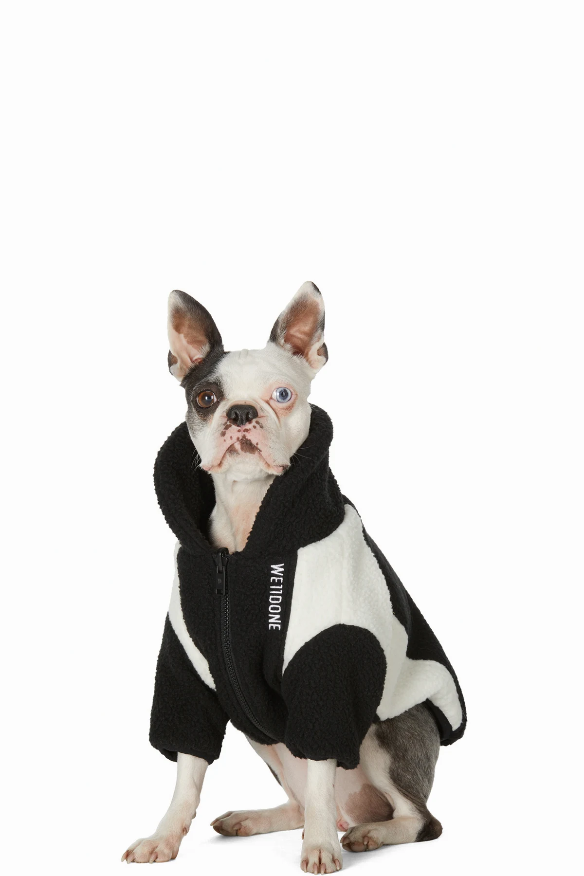 Long sleeve sherpa jacket in black. Panels in off-white throughout. Stand collar. Zip closure and logo embroidered in white at front. Elasticized cuffs and hem. Rubberized logo patch at back. Press-stud pocket at interior. Technical taffeta lining. Fully lined. Tonal hardware.