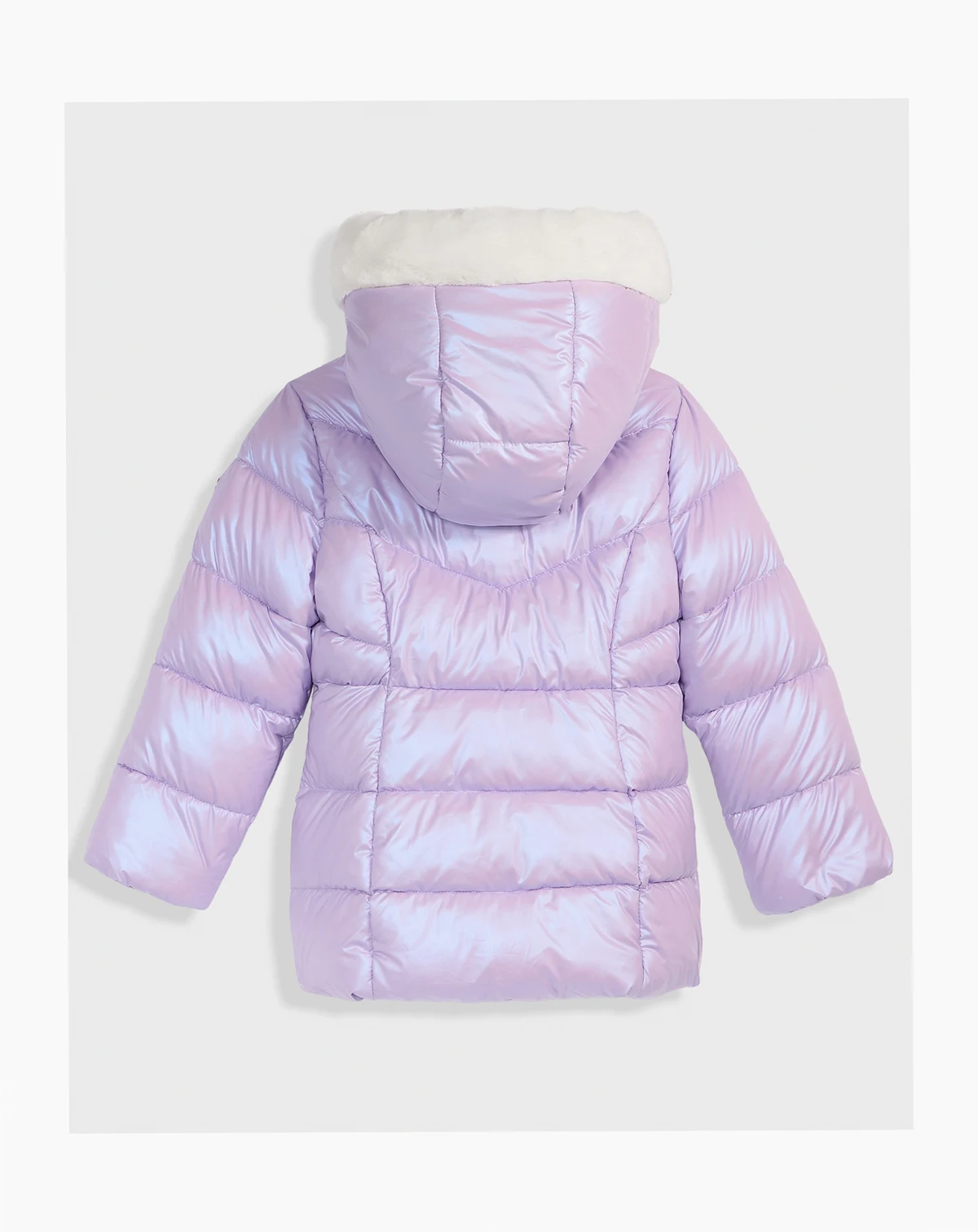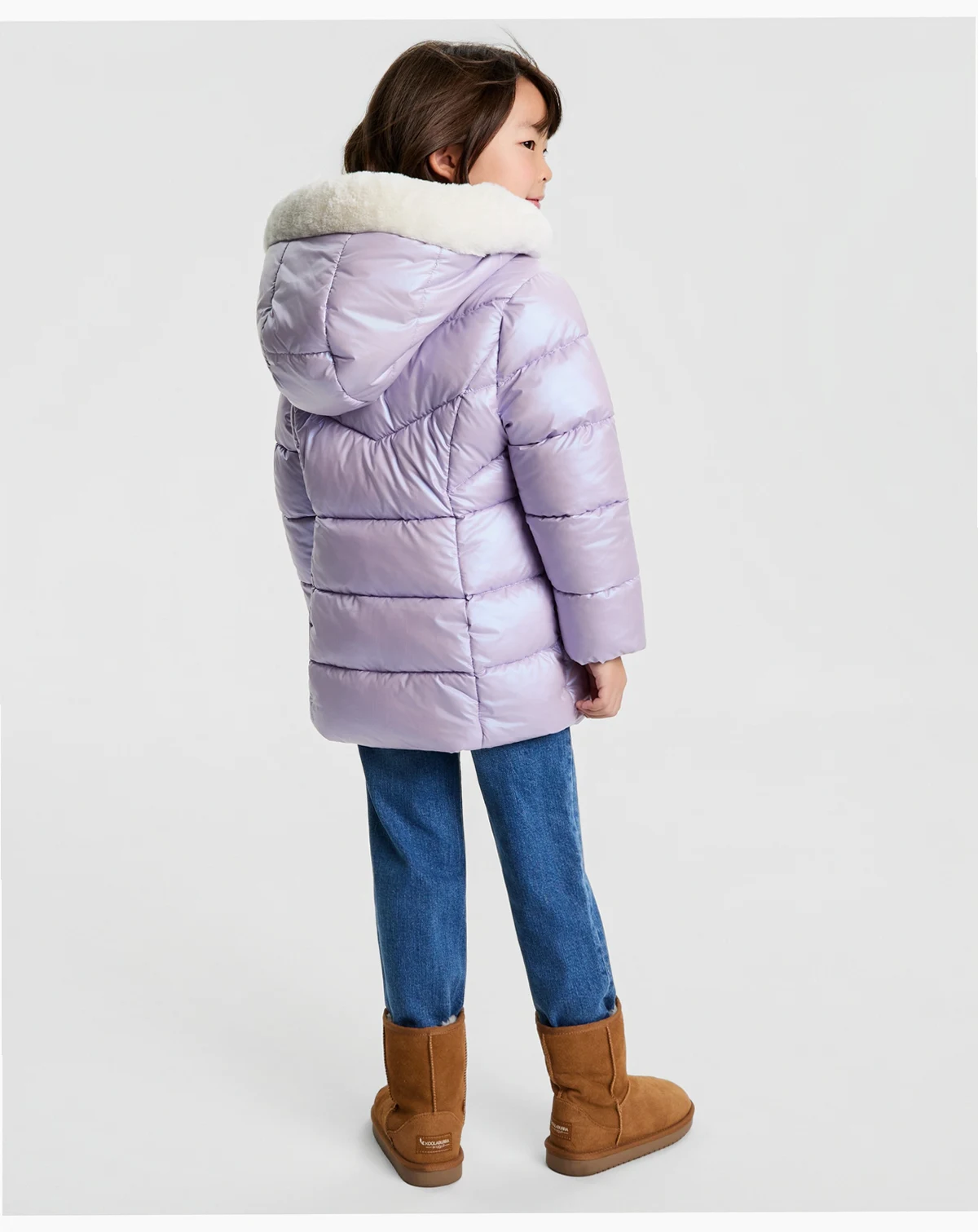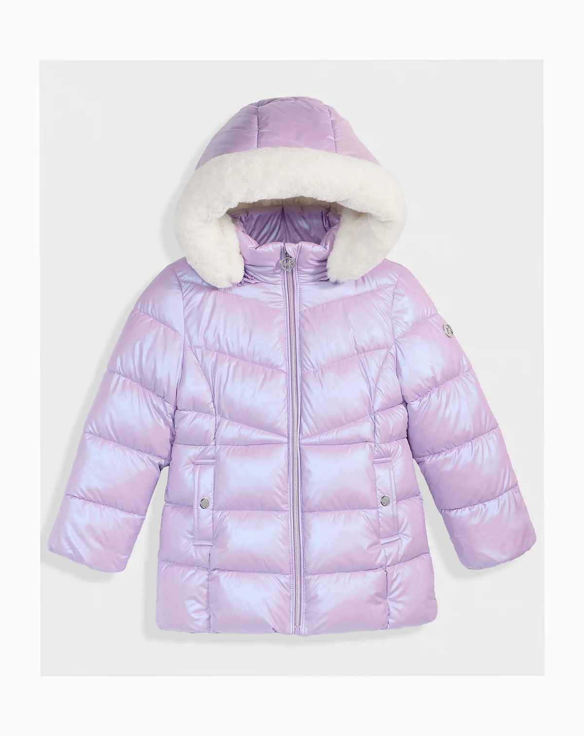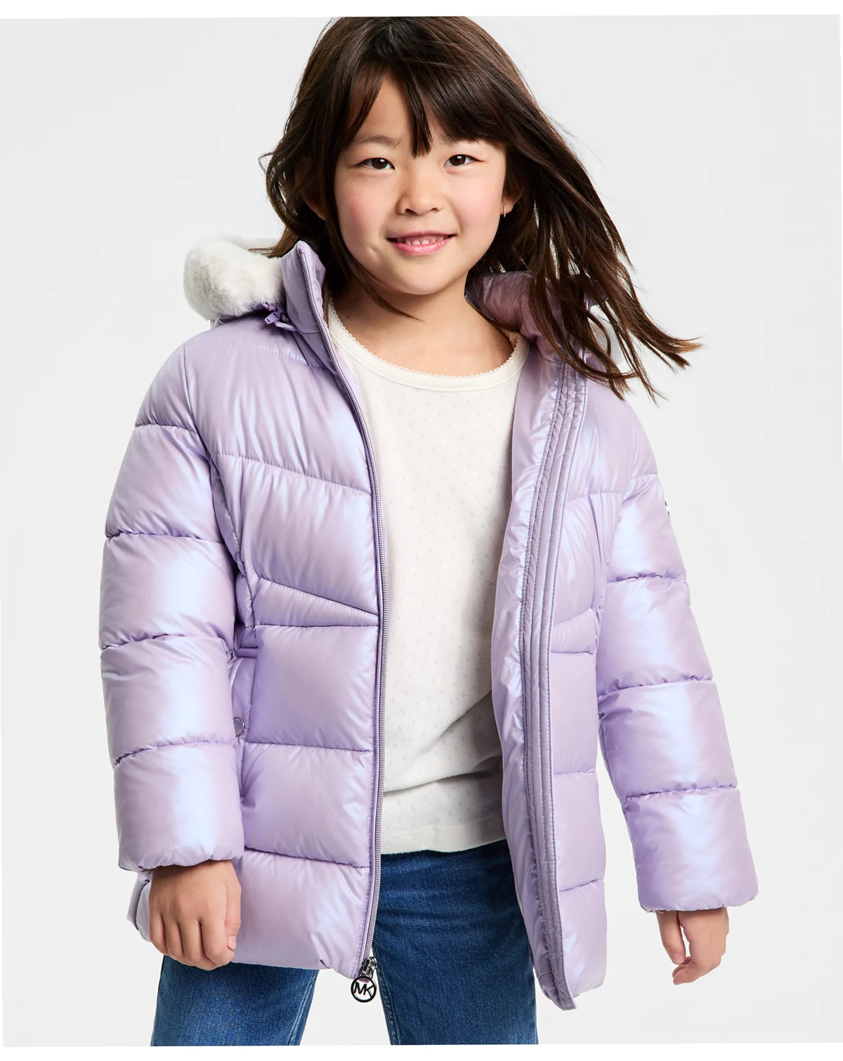 Help your little one stay cozy and stylish this winter season with this statement-making puffer jacket from Michael Kors, designed in a heavyweight, stadium-length silhouette made for cold-weather wear. A faux rabbit fur-lined hood and fleece-lined body offer exceptional warmth and comfort. Signature touches like the branded logo zipper pull, pocket snaps, and arm charm finish the piece with standout flair.