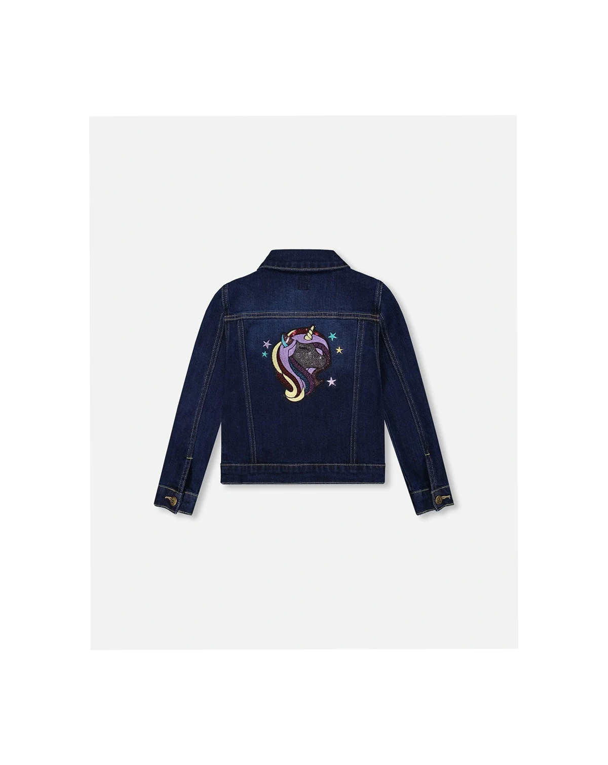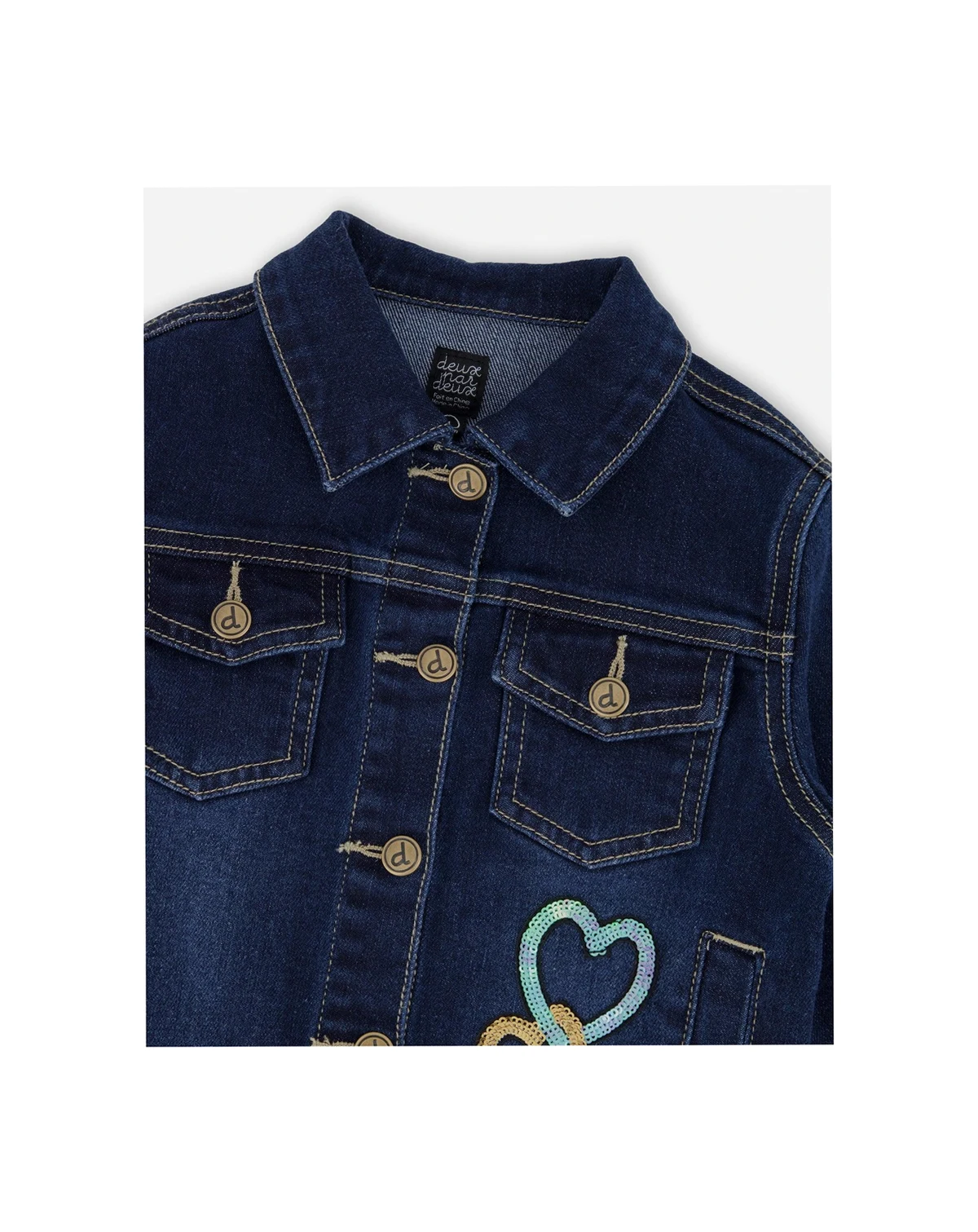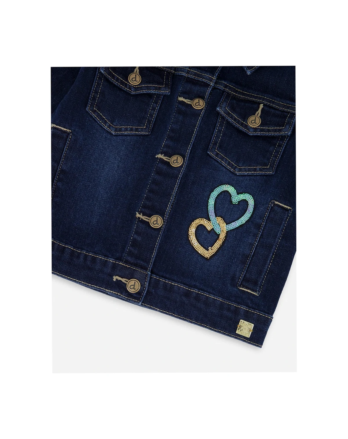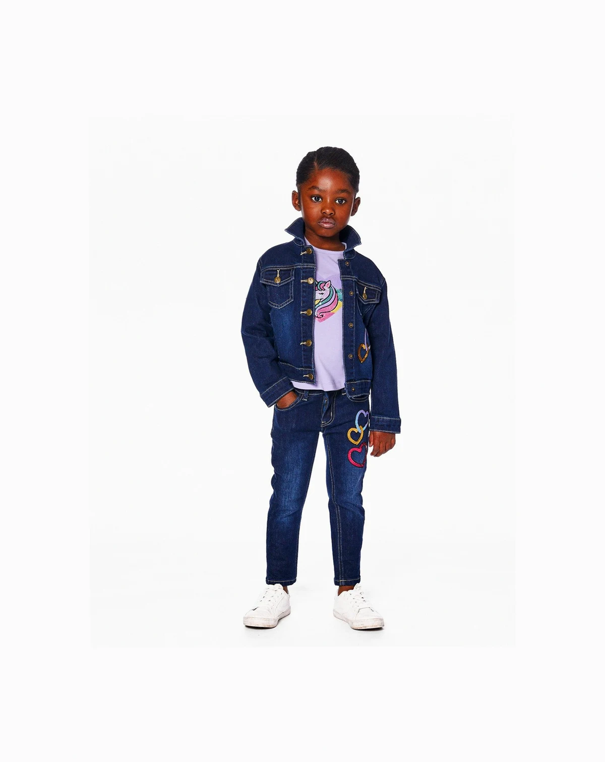 Our Stretch Denim Jacket Blue Denim With Glittery Hearts brings bold energy and fun flair to any fall outfit. This classic jean jacket is made from stretch denim and features glittery heart appliques on the front, a sparkly unicorn applique on the back, a classic shirt collar, front flap pockets, metal buttons down the front, and visible contrast topstitching that highlights its structure. Pair it with a top or bottom from our “Let s Dance!” collection for a dazzling everyday look.