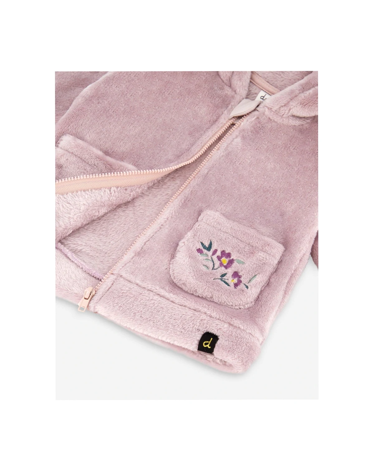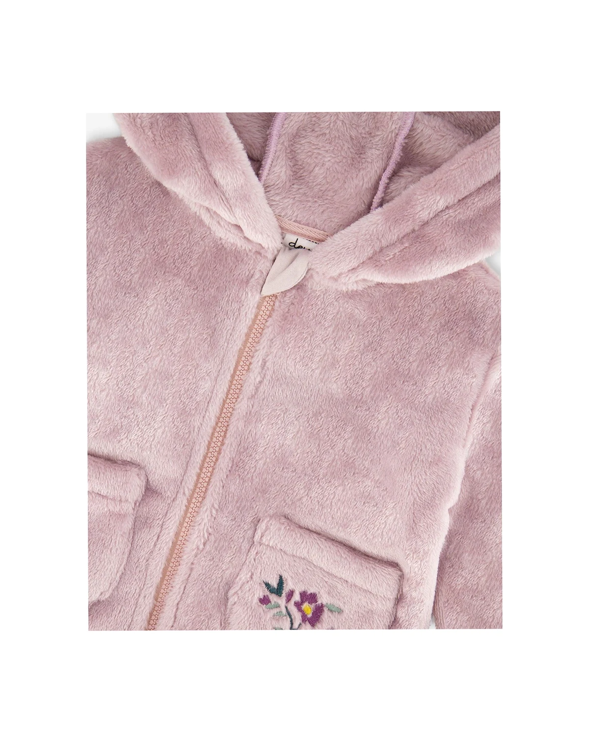 Wrap them in warmth with our Hooded Zip Plush Jacket Neutral Purple, a must-have for chilly days. This ultra-soft sherpa coat features a cozy hood, a full-length zipper for easy layering, front pockets and a plush texture that keeps little ones snug. A delicate floral detail on the left pocket adds a sweet touch to this everyday essential for cooler weather.