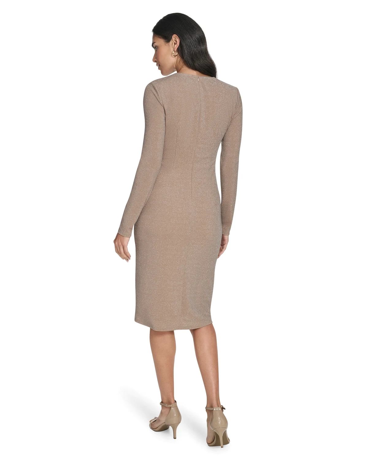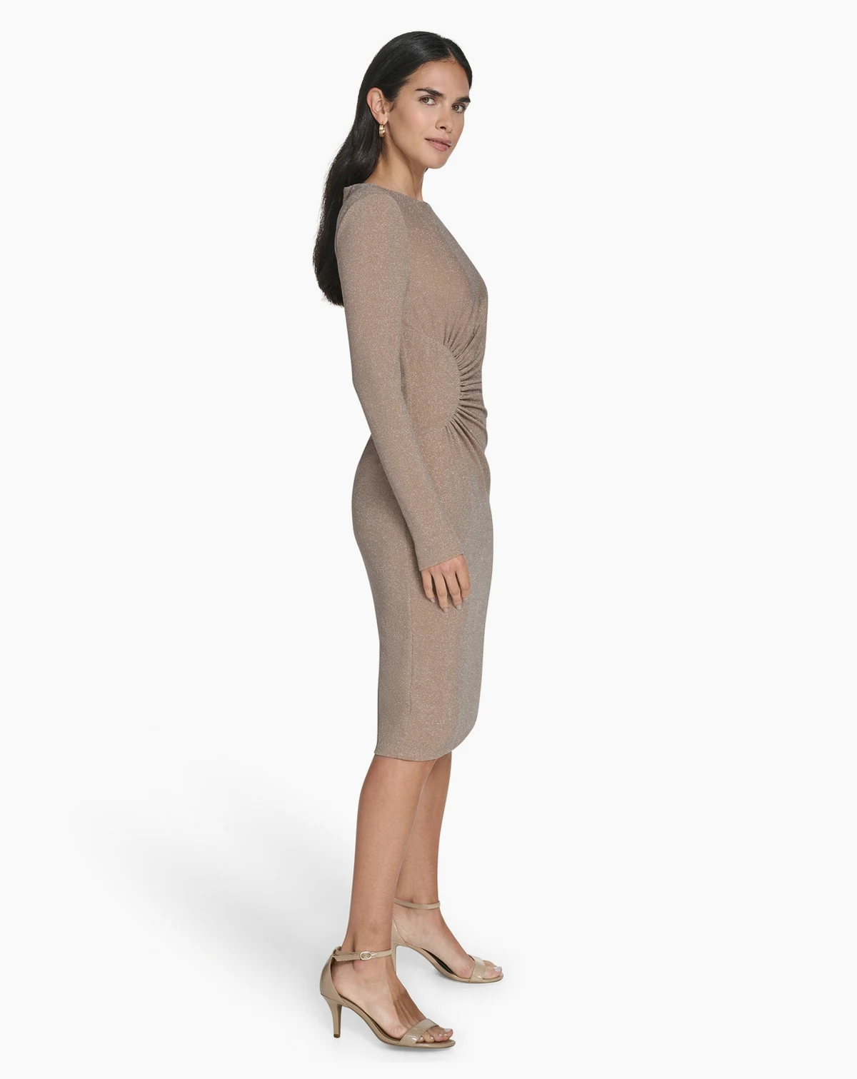 Sleek shaping defines this Jessica Howard sheath dress, featuring a crewneck that keeps it polished. Shirred detailing enhances the waist, while long sleeves balance the fitted silhouette for party or cocktail occasions.