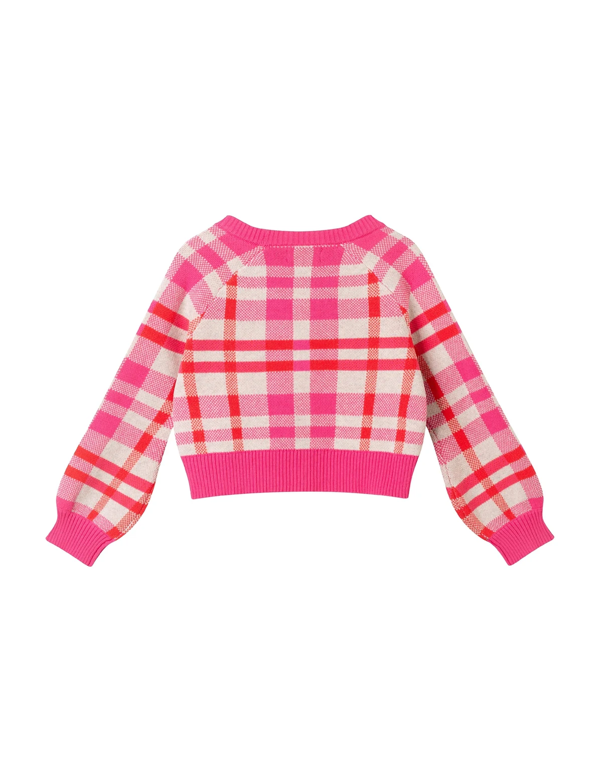 This cropped cardigan brings serious retro charm with a poppy pink plaid that s anything but shy. The bold button front and contrast ribbed trim give it structure and flair, while the soft knit makes it an easy pick for all-day comfort. Balloon sleeves add volume and a vintage vibe that pairs perfectly with high-waisted jeans, skirts, or layered dresses. Whether worn buttoned up or open over a tee, it s a standout layer that s equal parts cozy and cool.