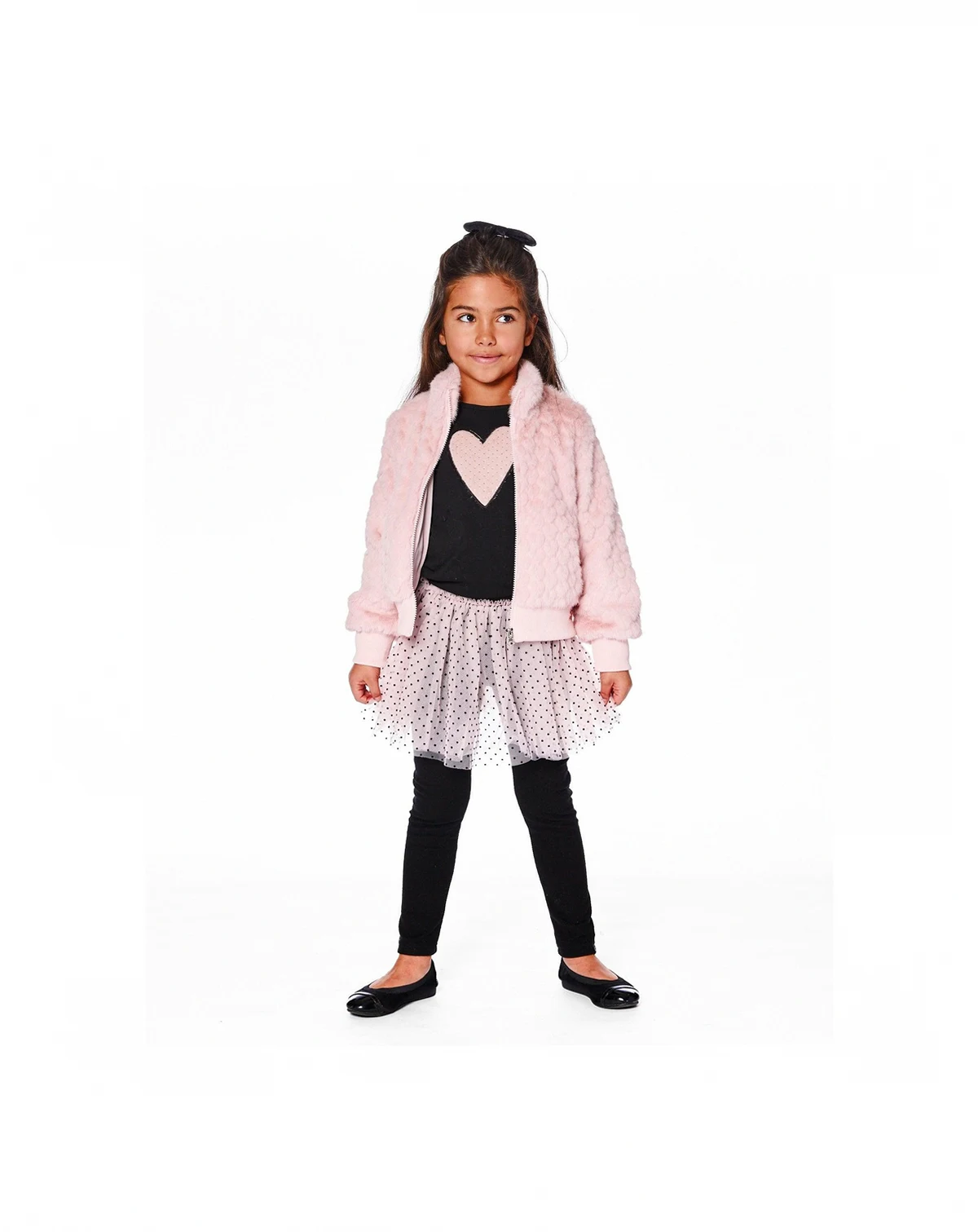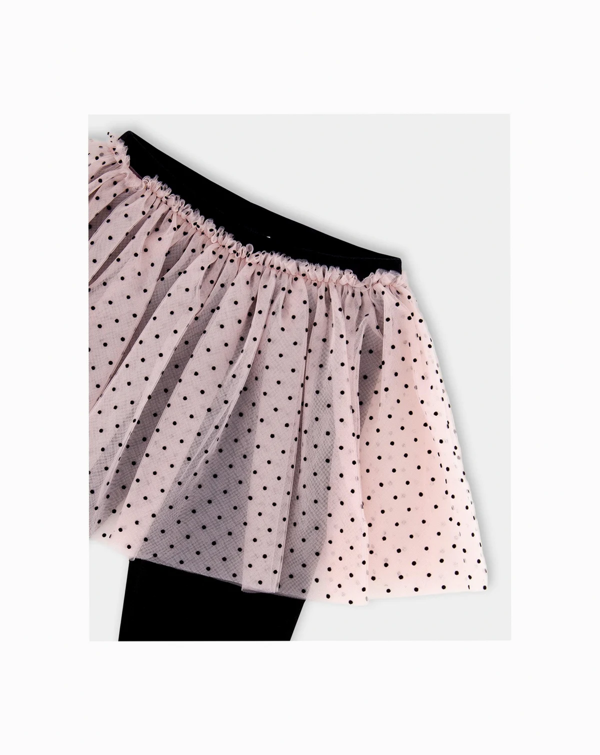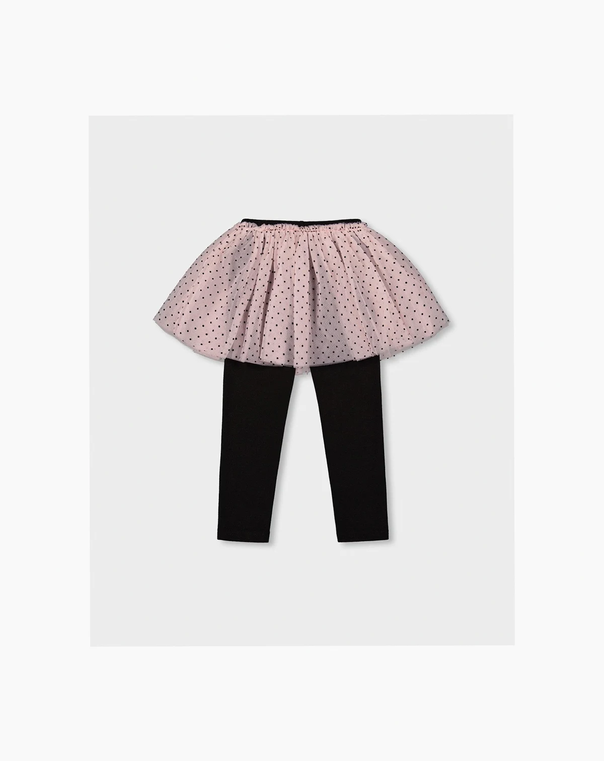 A tulle skirt overlay adds texture and whimsy to these oh-so-essential bottoms. A must-have for the girly girl who loves the comfortable feel of leggings, this adorable one-piece design features a stretch elastic waistband, a vertical ribbed texture, and a flared tulle skirt with an allover dot pattern.