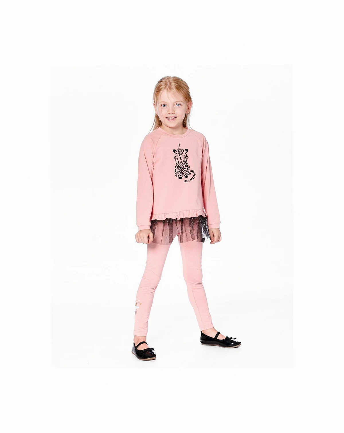 The Cotton Leggings in Dusty Pink With Unicorn Print add a playful touch to everyday outfits. These stretchy jersey bottoms are crafted from a soft blend of cotton and elastane, featuring a comfy elastic waistband and whimsical glittery unicorn graphics near the ankles. Perfect for pairing with tunics or tees from the “Unicorns And Hearts” collection for magical playtime style.