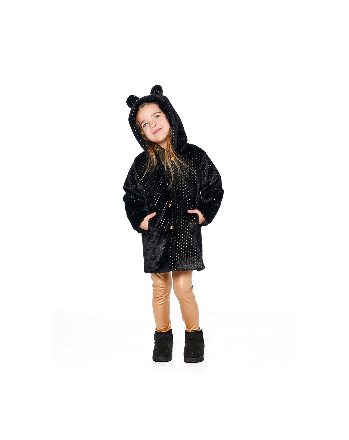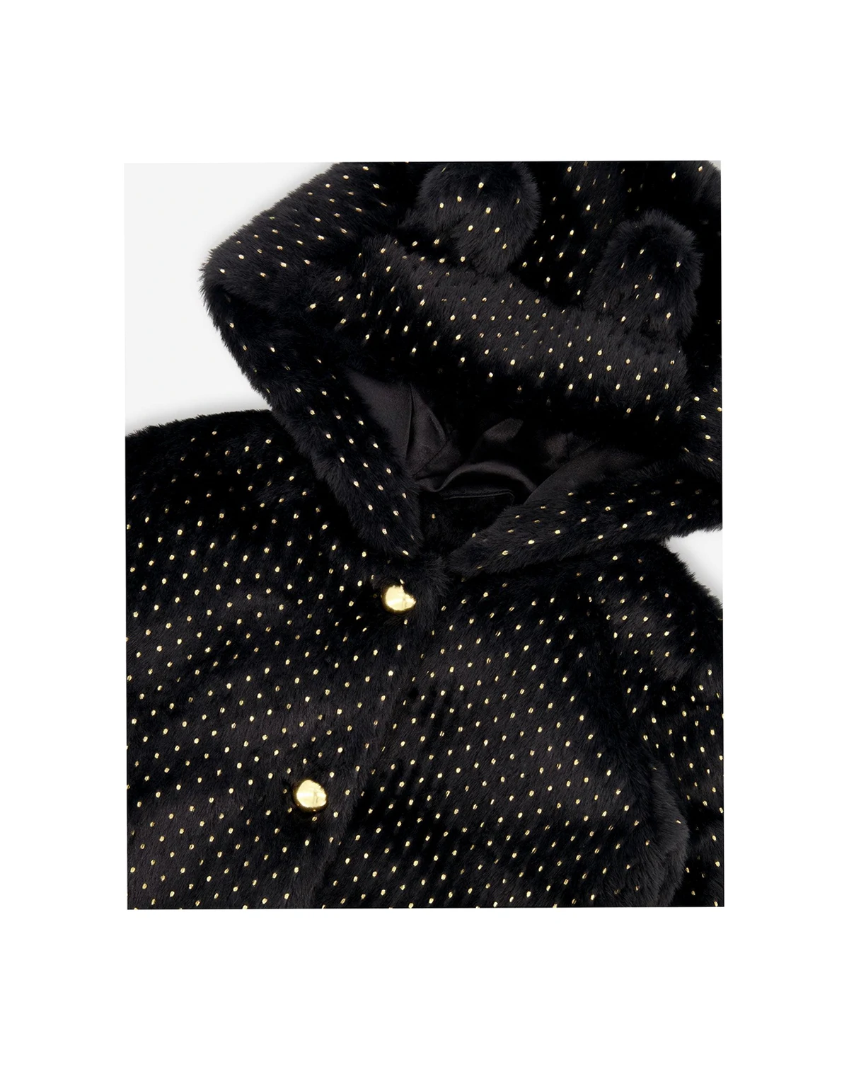 Our Bear Faux Fur Coat Black With Gold Polka Dots adds a playful and cozy touch to her winter wardrobe. This adorable coat is made from ultra-soft faux fur with a dotted gold foil pattern, a button-up front, and a hood with 3D bear ears for added charm. Fully lined for warmth, it s the perfect outerwear for chilly days and festive strolls.
