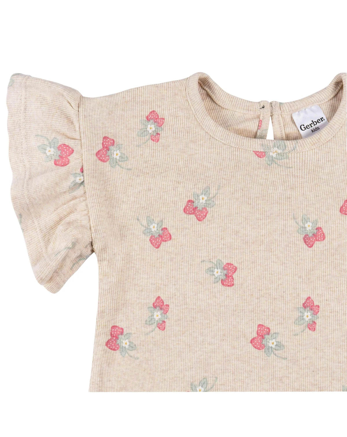 Brighten up your little girl s wardrobe with this sweet oatmeal heather and pink strawberry print shirt and shorts set! Made from breathable material, this outfit is perfect for sunny day adventures, keeping her cool and comfy. The shirt features charming loose, ruffled sleeves and a rear button for easy pull-on dressing, while the shorts offer a stretchy waistband for a secure, comfy fit. It s the ideal go-to for everyday wear, from playtime to running errands in style! Our essentials have been independently certified with STANDARD 100 by OEKO-TEX so that you don t have to worry about harmful substances in your baby s wardrobe. Includes matching top and shorts.