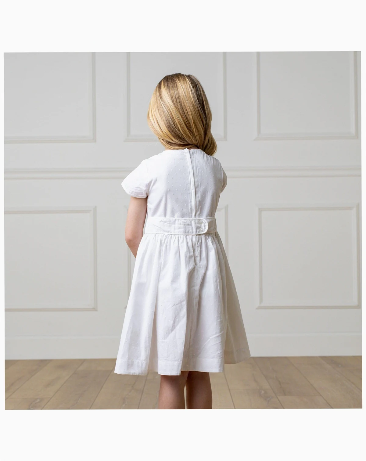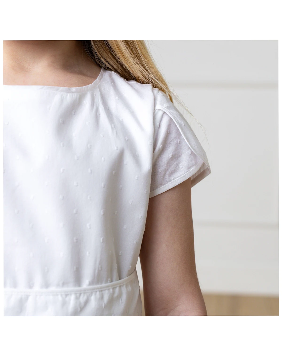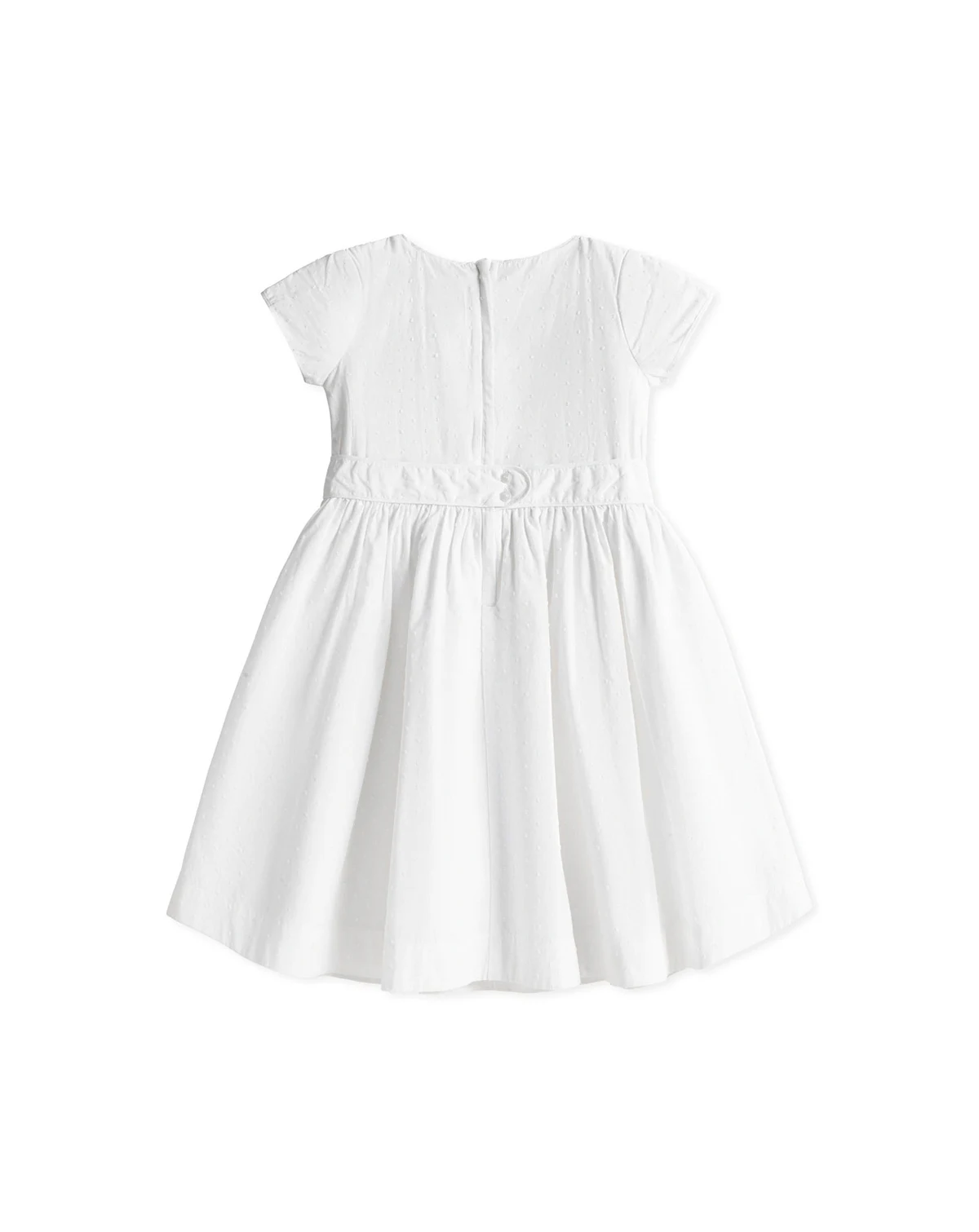 Pretty tulip sleeves are the special detail on our beautiful dress crafted from soft organic cotton swiss dot. Features a flattering fit and flare silhouette, piping at the trim, and a waist sash with button back closure. .