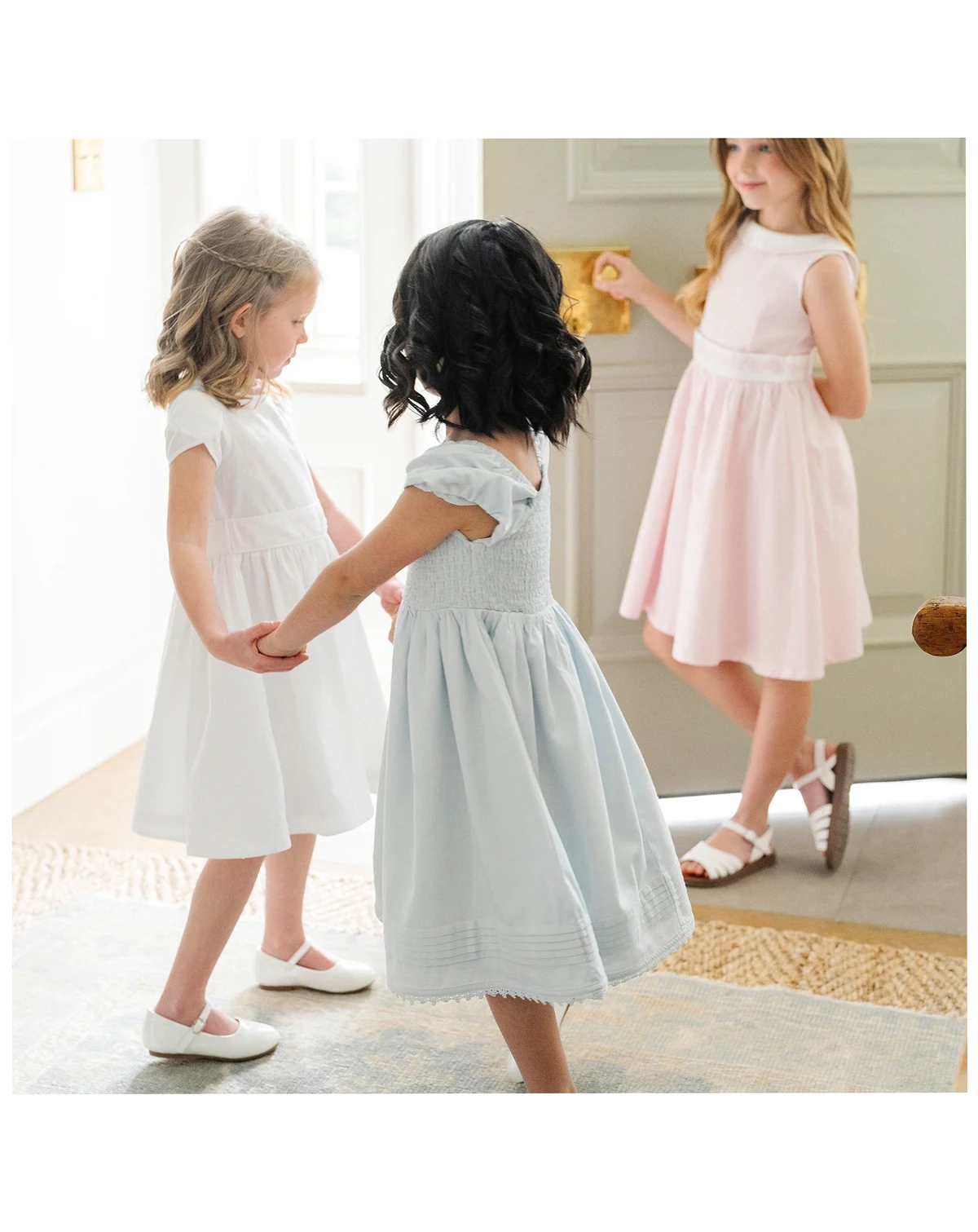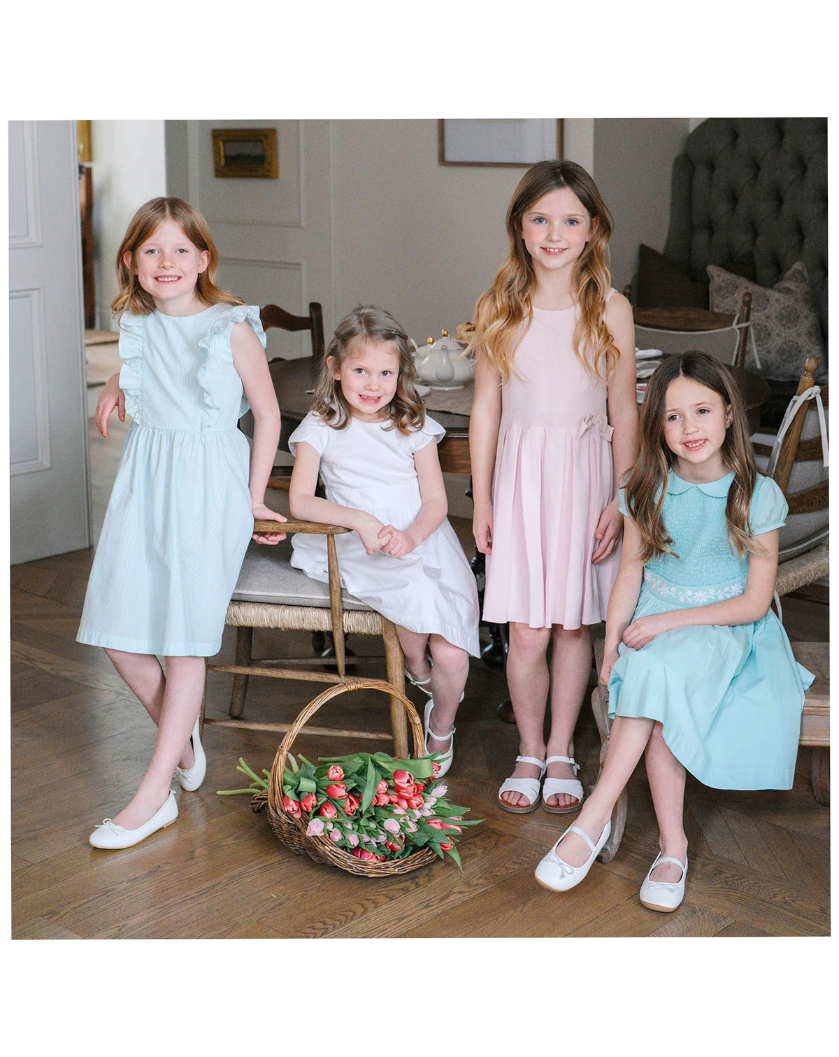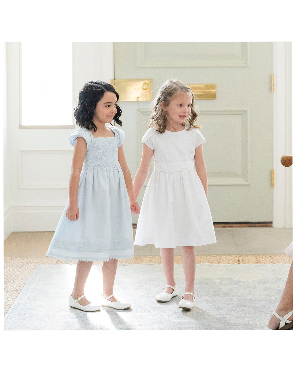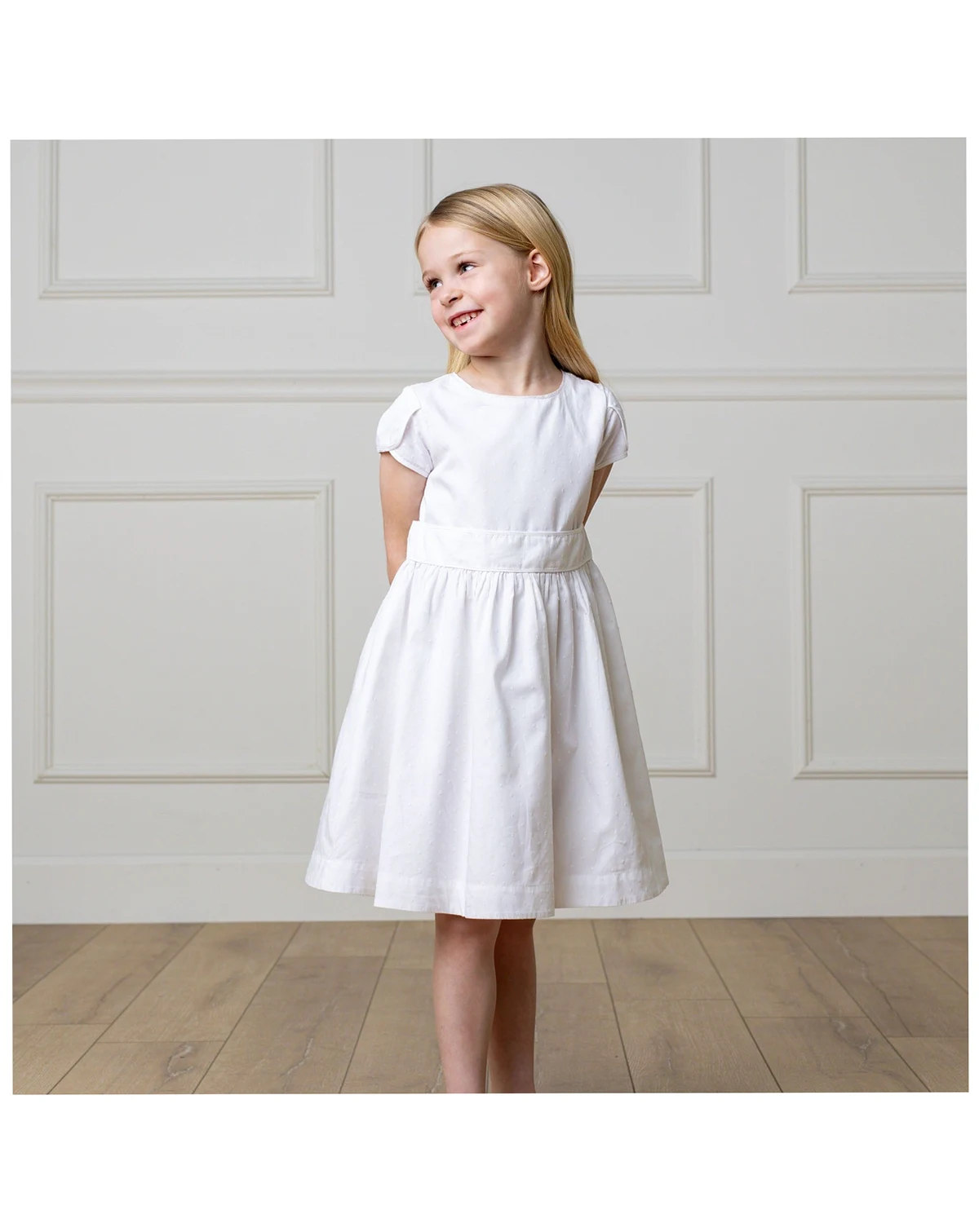Pretty tulip sleeves are the special detail on our beautiful dress crafted from soft organic cotton swiss dot. Features a flattering fit and flare silhouette, piping at the trim, and a waist sash with button back closure. .