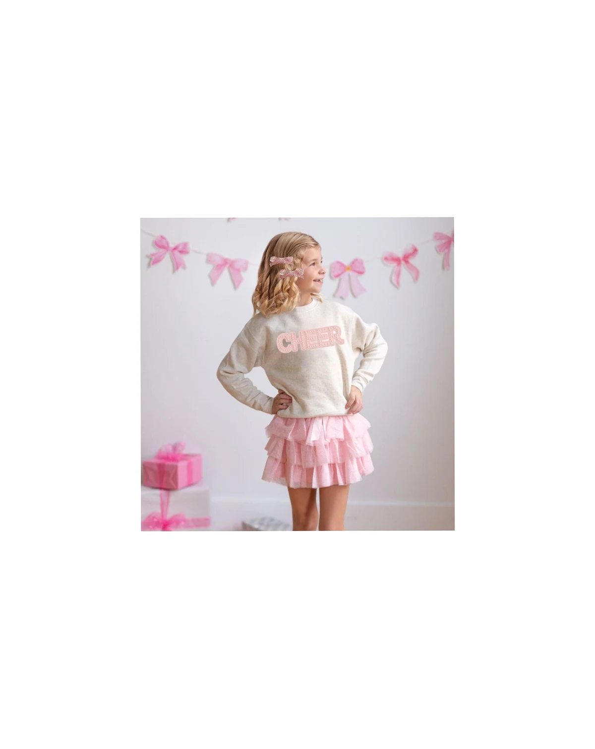 The Cheer Pearl Patch Sweatshirt is a fun and cute sweatshirt that is perfect for cheering on the game!
