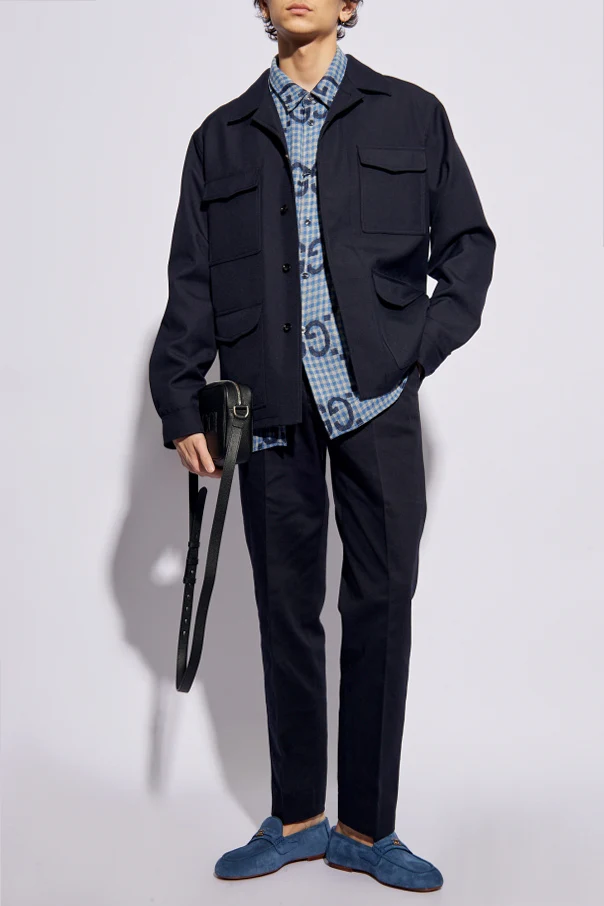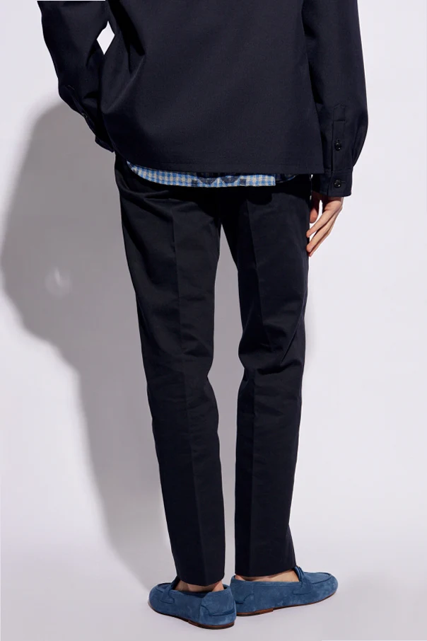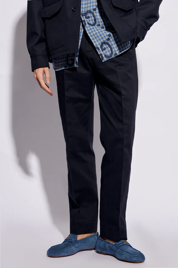 Navy blue chino trousers from Gucci. Made from cotton, this pair falls with slightly tapered legs and features a zip fly with a hook & eye closure, two slip pockets, two button pockets as well as green-red-green Web belt loops.