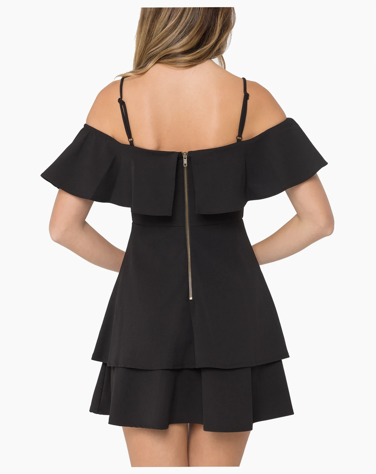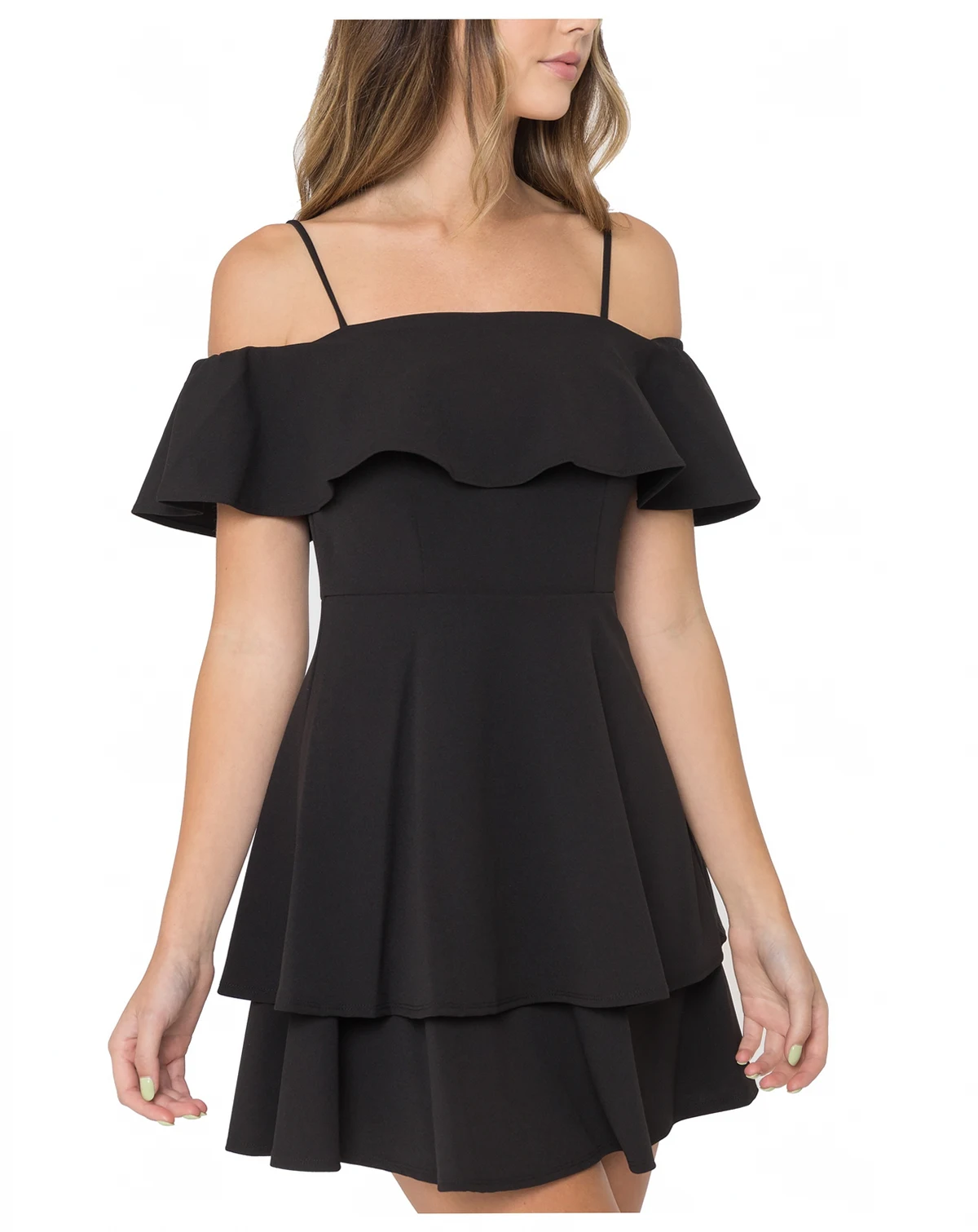 Approx. 36" long from center back neck to hem. Length is based on size 7/8 and varies 1/4" between sizes; Straight off-the-shoulder neckline with ruffled trim; Fit & flare silhouette