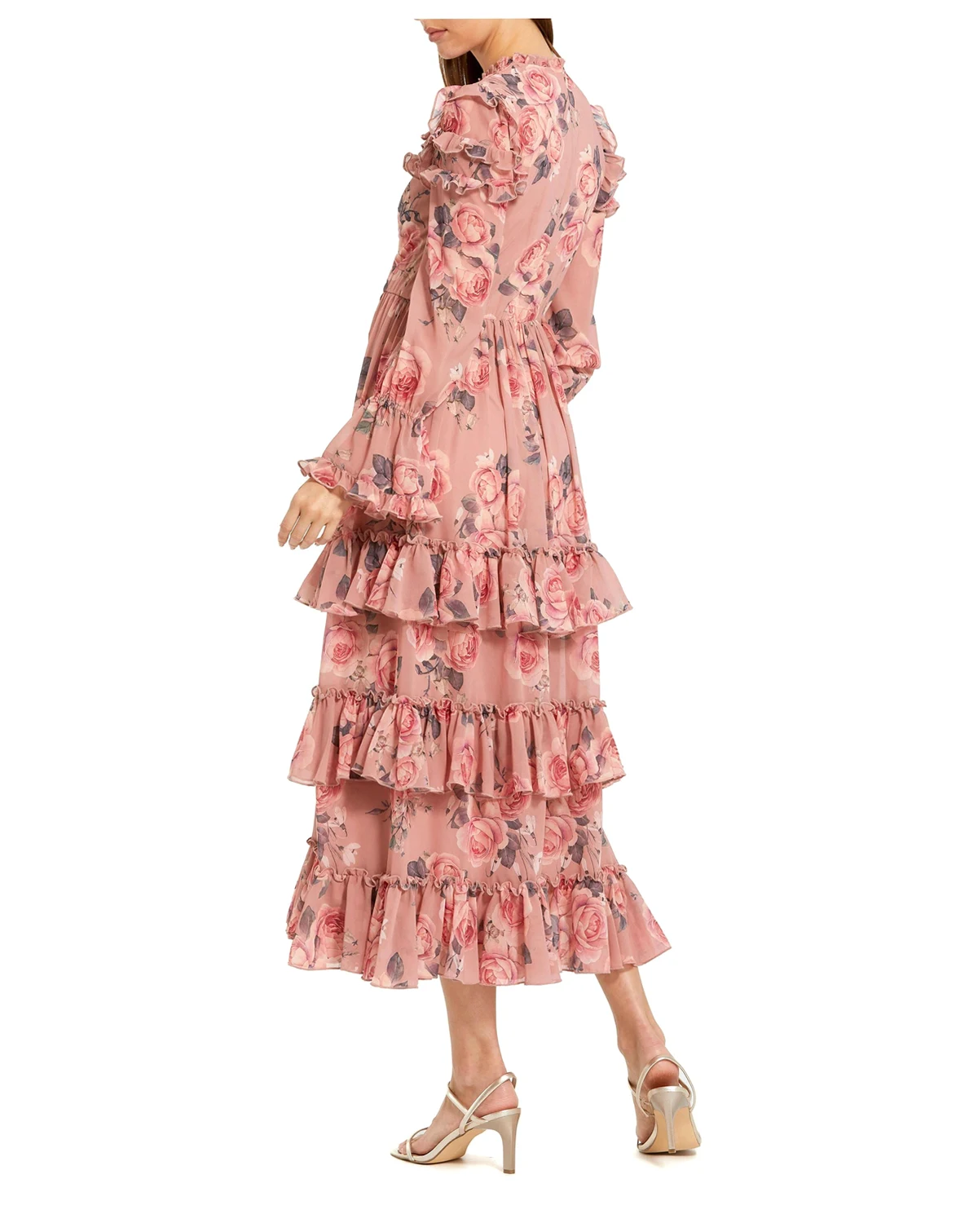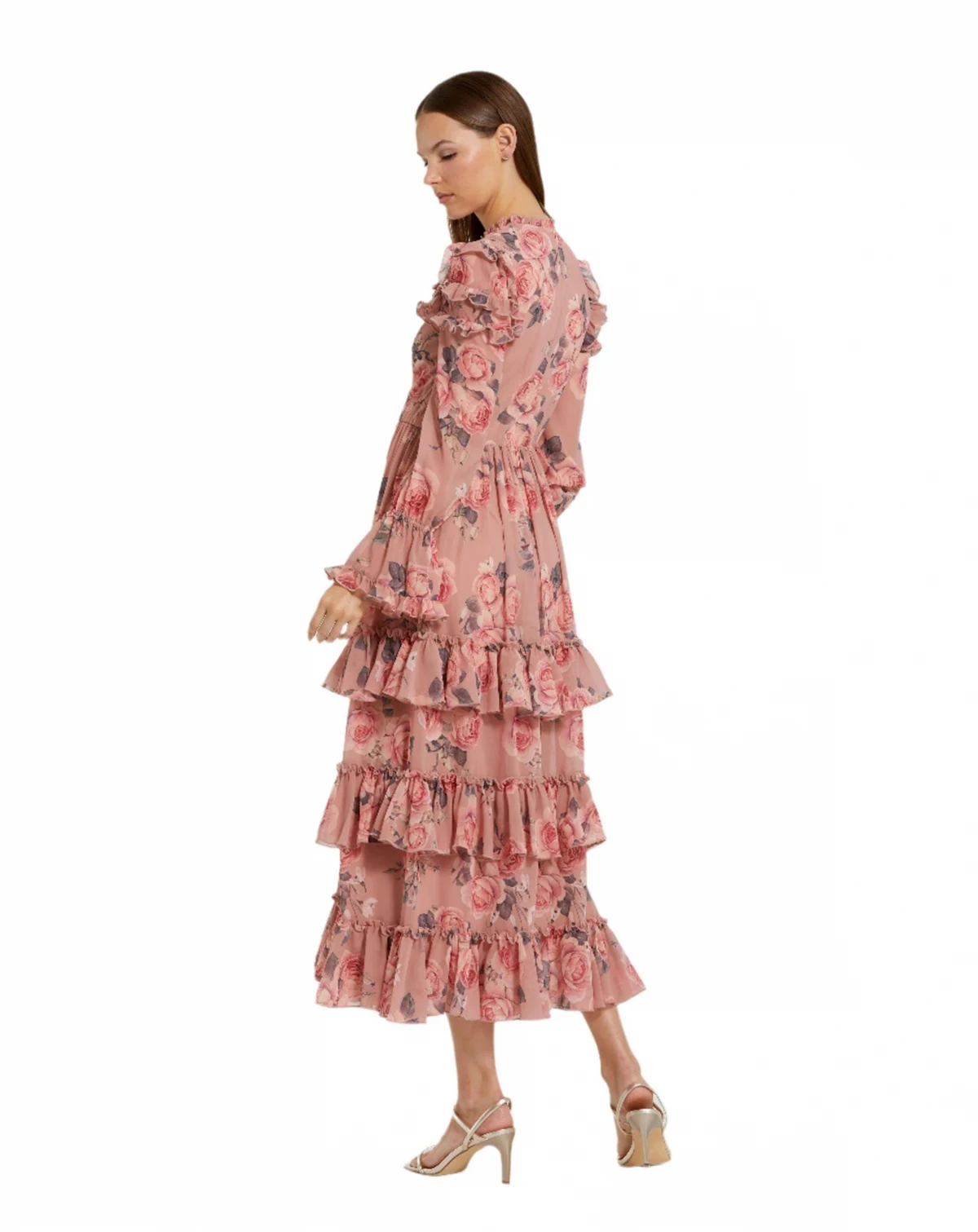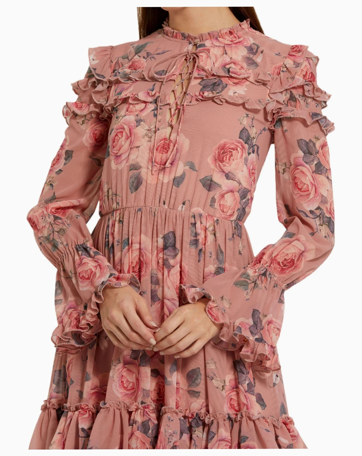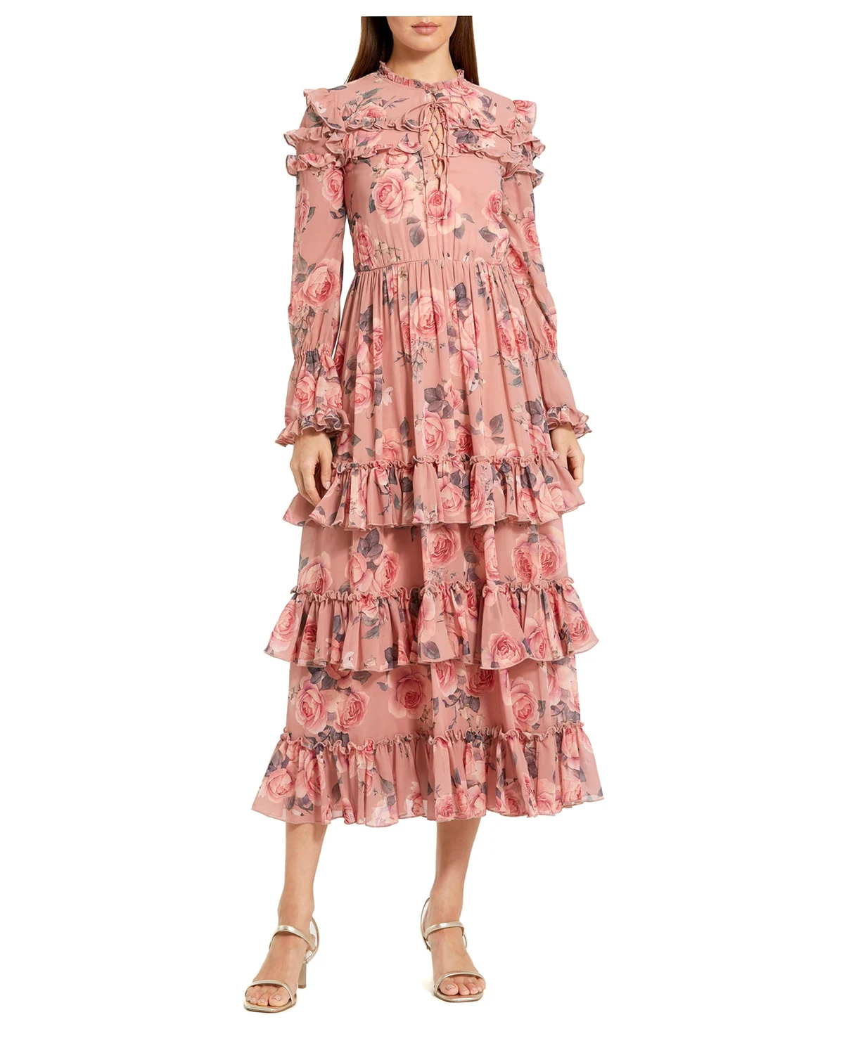 Elevate your look with the Long Sleeve Lace-Up Front Tiered Ruffle Dress. Designed with a chic lace-up neckline, long sleeves, and layered ruffles, it flatters every figure and blends timeless elegance with playful, modern charm for any occasion.