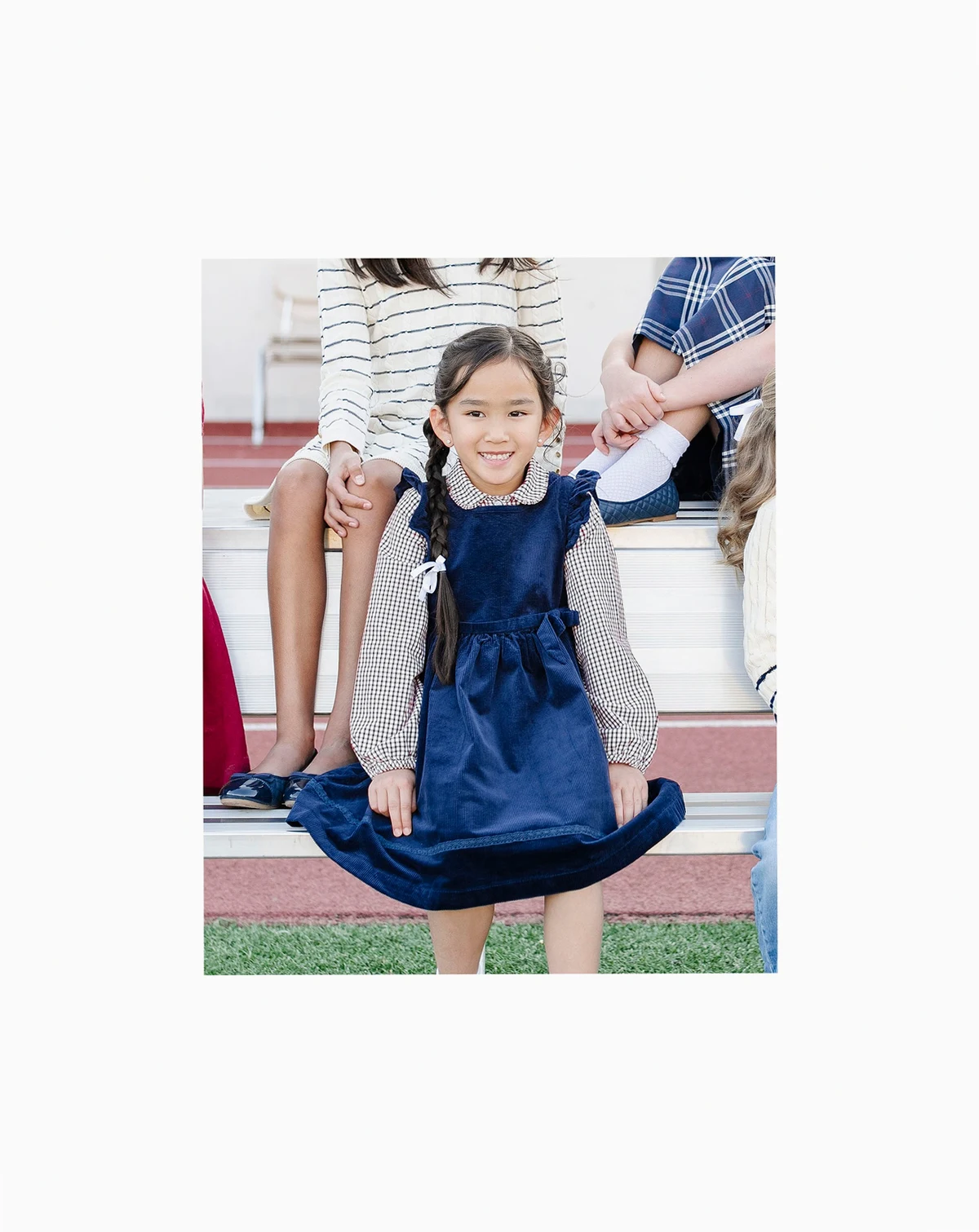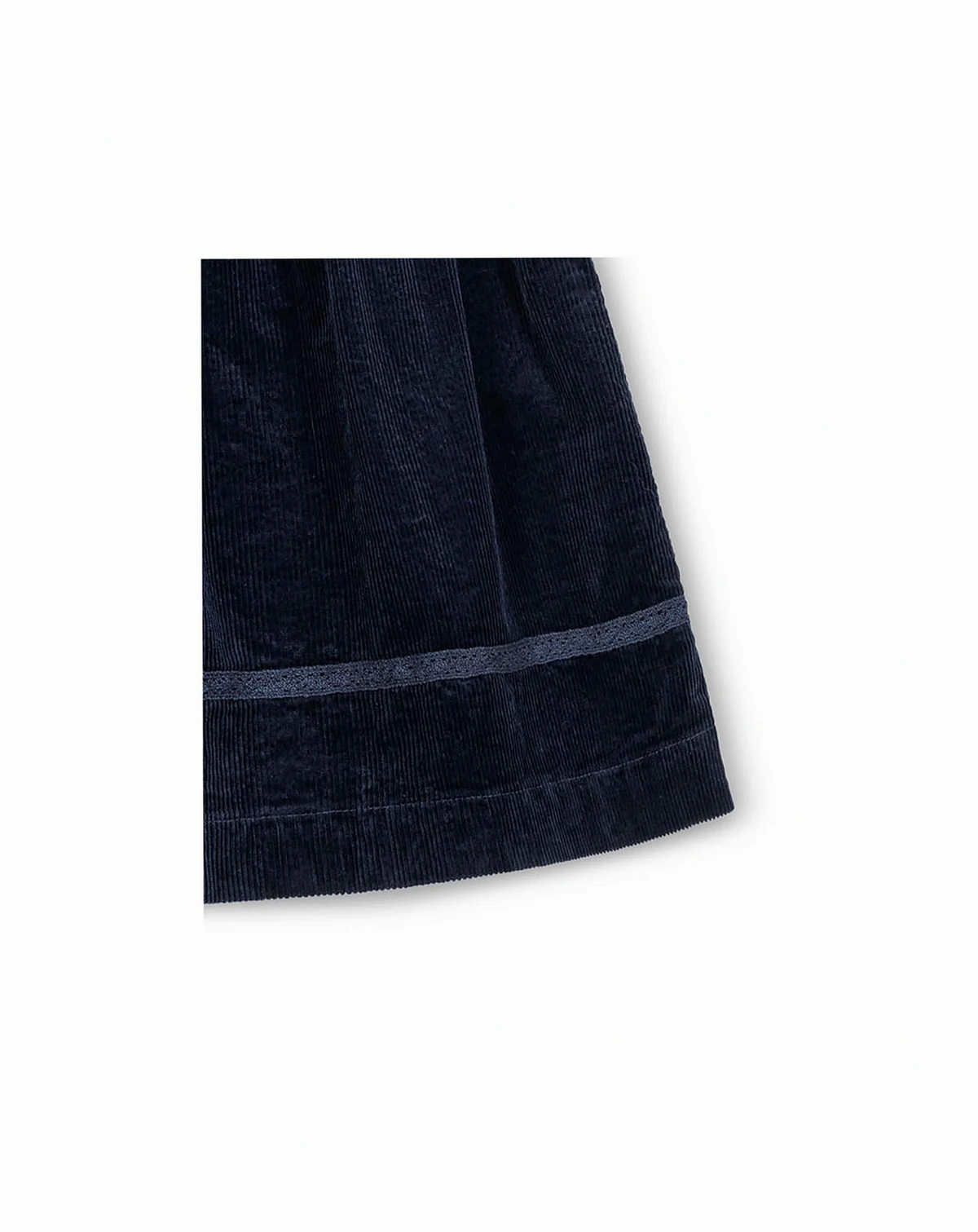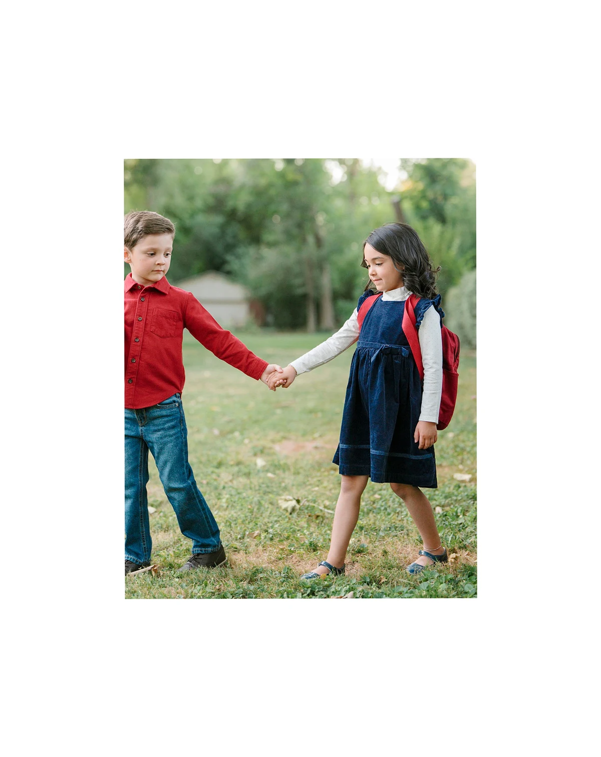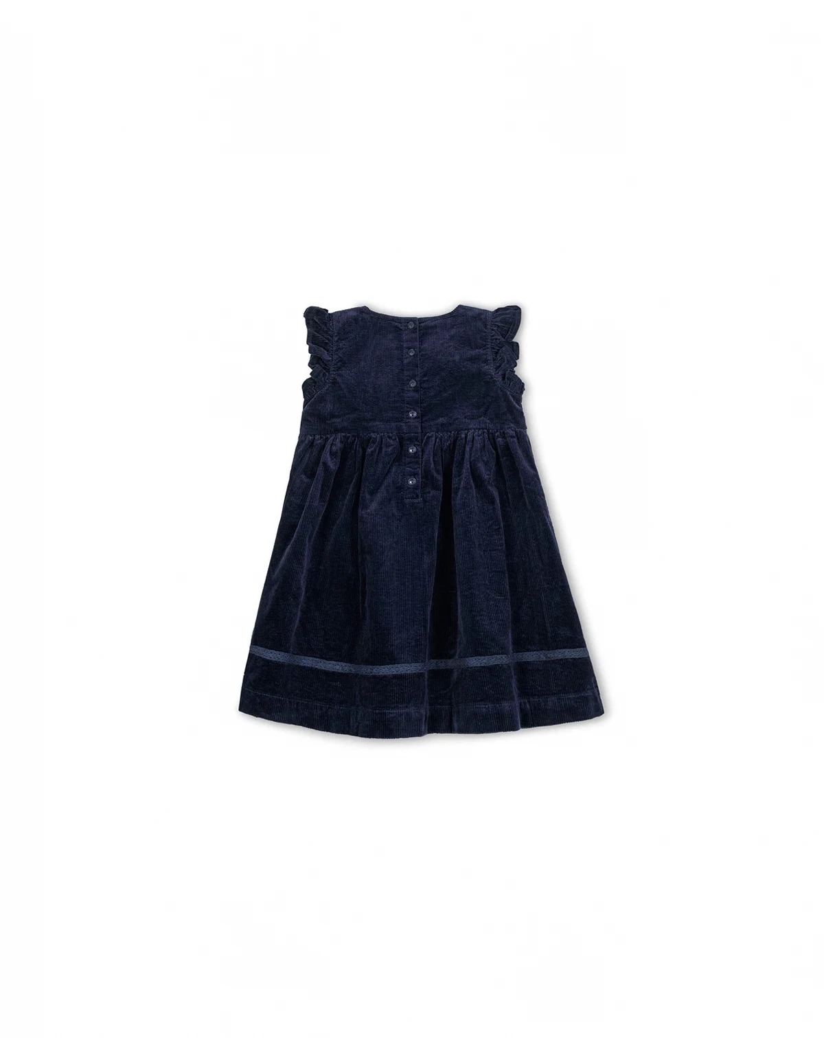 Our beautiful jumper dress is perfect for layering with tops and tights when school is back in session and temperatures begin to cool. Features sweet flutter sleeves, a bow detail at the waist, crochet trim, and a button back closure. Crafted from soft organic cotton fine wale corduroy that is a warm and rich look for the season.
