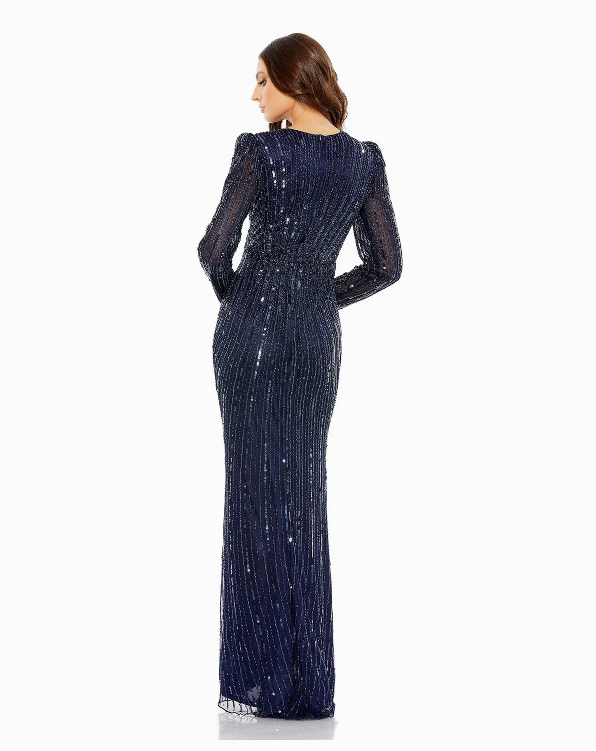 In ultra-fine tulle, this floor-grazing dress sparkles with sequin rays. A sleek column shape, high neckline, fitted long sleeves, and beaded waist detail for a chic, contemporary look.