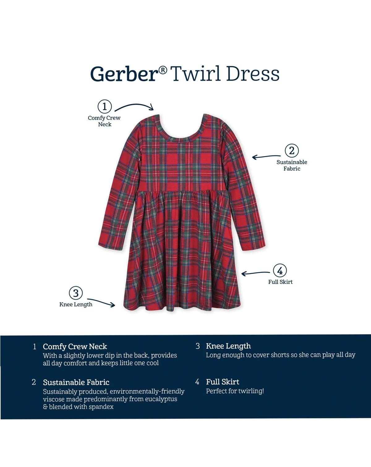Perfectly designed for the Christmas season, our buttery soft affordable dress will be your little one's favorite! We've partnered with Livaeco by Birla Cellulose to bring you and your little one a more sustainably produced, environmentally-friendly viscose fiber collection made predominately from eucalyptus blended with spandex. This extremely soft red and green plaid dress is the perfect look for any occasion. High-quality, lightweight, breathable, durable fabric with the perfect amount of stretch. This long sleeve twirl dress is comfy fitting for all day wear. Gerber quality, comfort, safety and value never goes out of style!