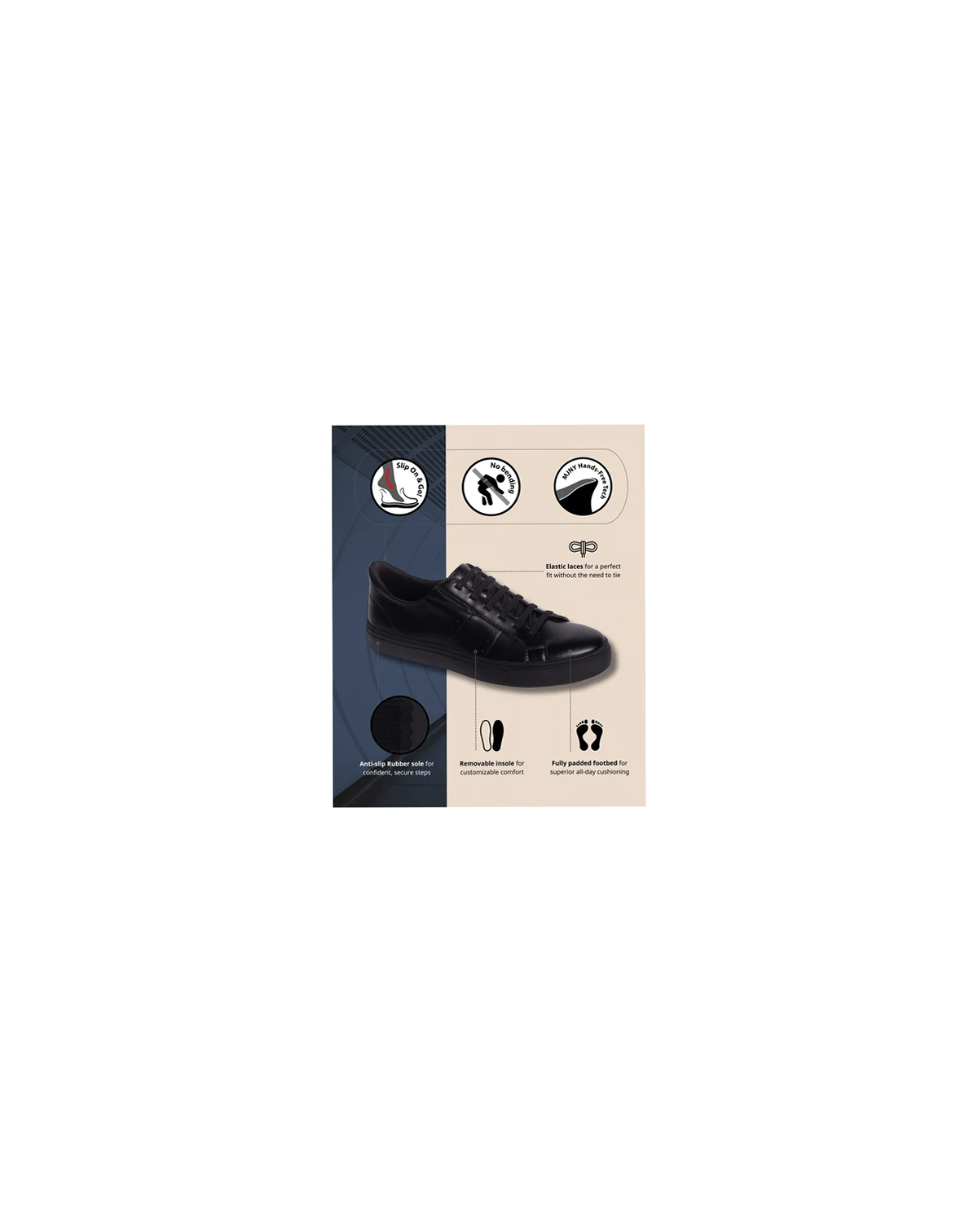 Effortlessly stylish and designed for modern living, the Robinson Street women s sneaker features innovative Hands-Free Technology (Pending Patent) —offering a Just Slip On experience for ultimate convenience. Elastic laces ensure a secure, custom fit without the need to tie, while its thoughtfully engineered construction delivers all-day comfort and flexibility. Whether you're heading to the office or out on the town, these sneakers seamlessly blend contemporary design with unmatched ease. Step into a new level of sophistication and enjoy the perfect balance of casual elegance and practicality.