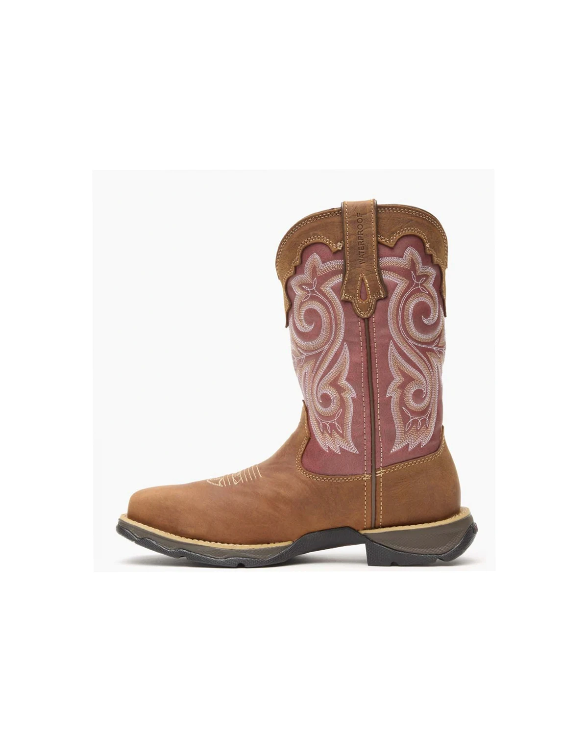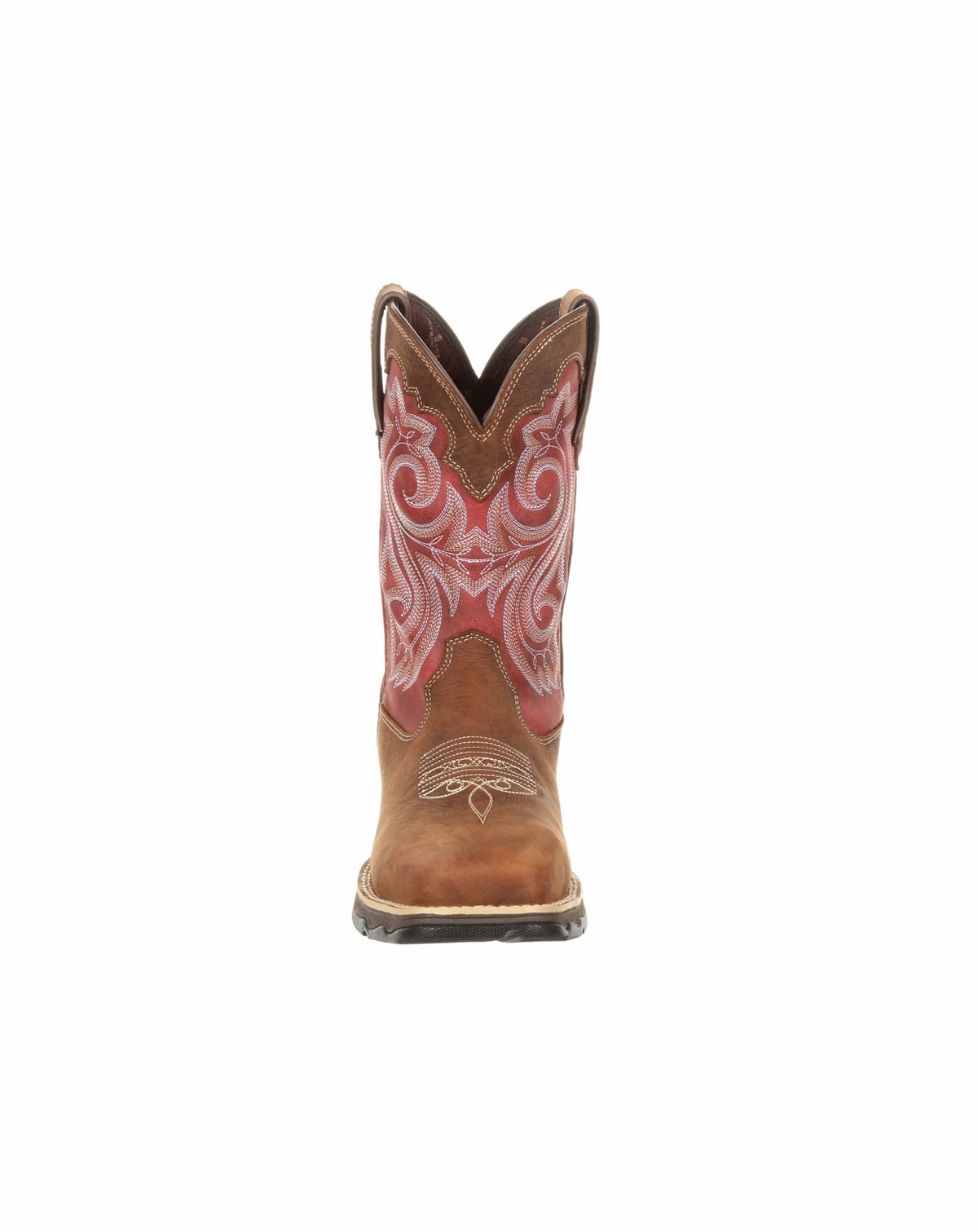Stay dry, protected, and stylish in the 10” Lady Rebel Work Western Boot. This waterproof composite toe boot features a full-grain leather vamp, fox, collar, and pull straps with a Briar Brown/Rusty Red shaft. The dipped topline and pull straps allow for easy on/off. Inside you will find a soft mesh lining, fiberglass shank, lightweight EVA midsole, and a removable, contoured and ventilated footbed – all delivering everyday comfort and breathability. This square toe boot includes a dual-density rubber outsole that resists slips and abrasions, and the rolled shank area helps with stirrup placement. Built for durability with a double-row welt stitch and finished with a 1 1/4 rocker heel. These boots are also compliant with the ASTM F2413 Protective Toe and Electrical Hazard Classification Standard which means your feet are protected from falling debris and keep the bottom of your feet safe when working around electrical equipment.