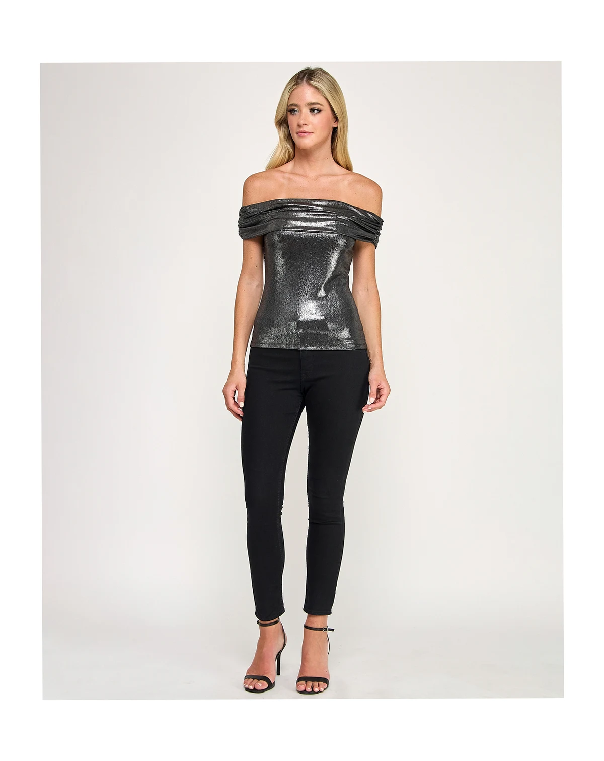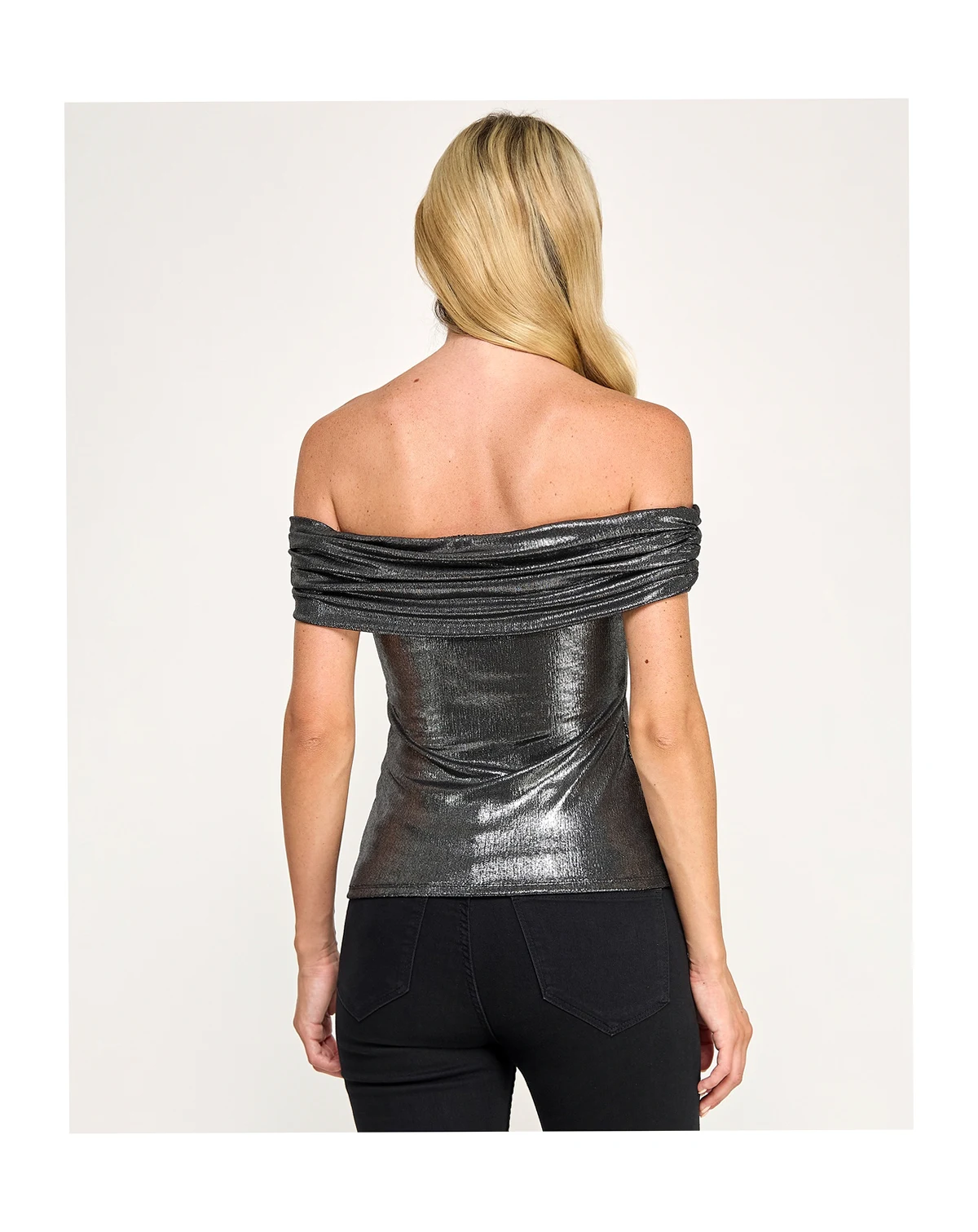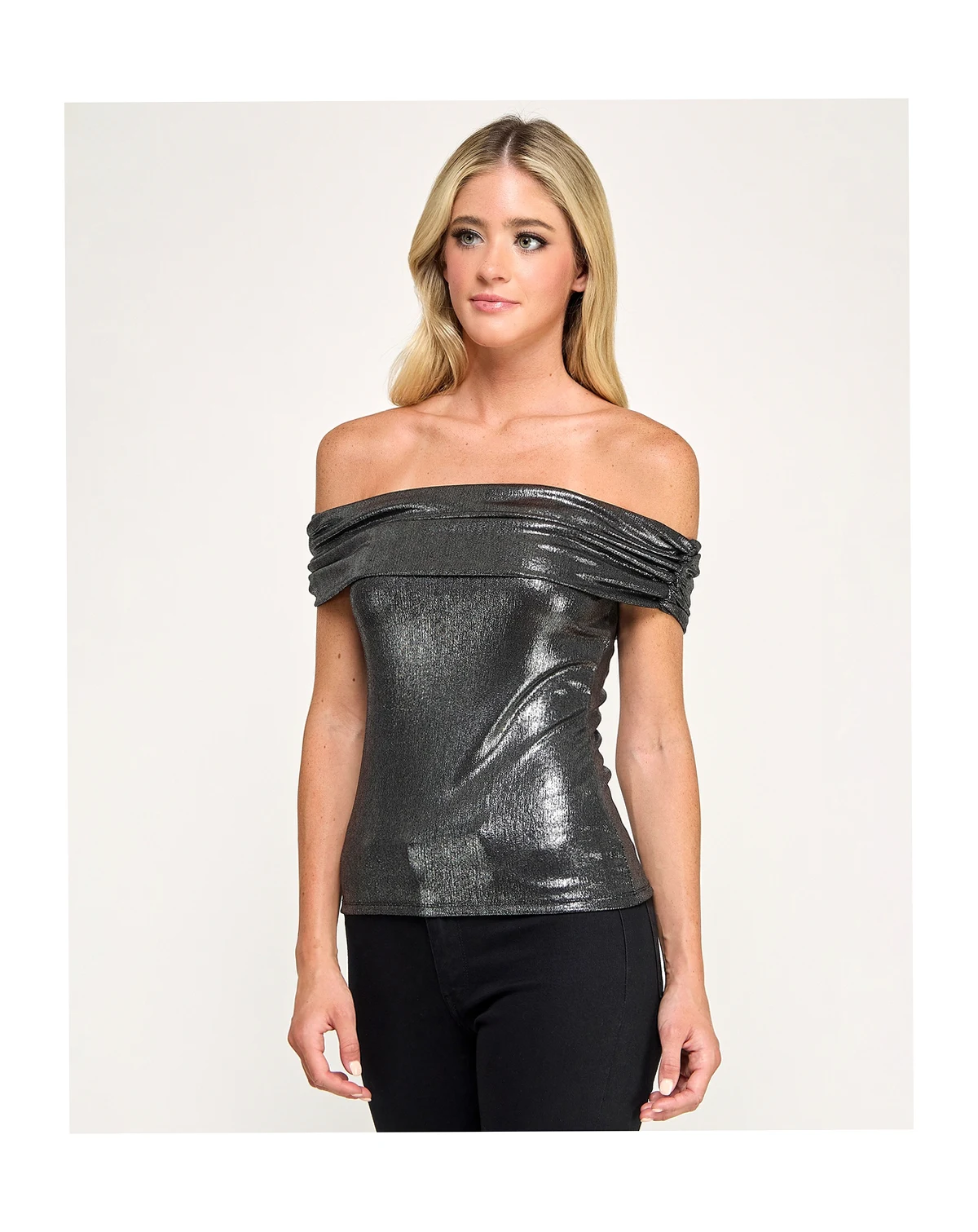 Shine in this modern SENI & CADE top, designed with an off-the-shoulder silhouette and easy pull-on style. Crafted from lurex slinky knit with a subtle fog foil finish, it offers a sleek, unlined fit for effortless elegance.