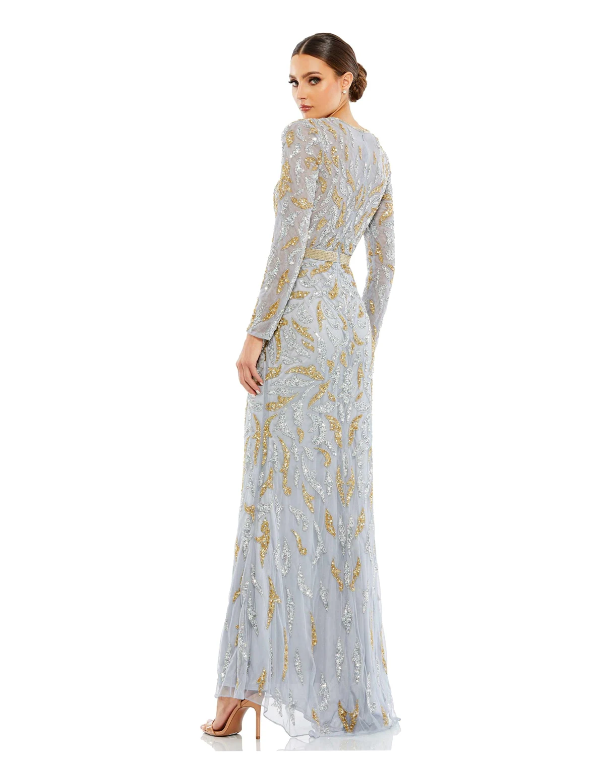 Long sleeve evening gown with a high bead-accented neckline, fitted bodice, illusion yoke and sleeves, and a floor-length mermaid skirt with a sweeping hem. The mesh overlay is adorned with beads and sequins placed in an abstract pattern. A hand-beaded belt accents the natural waist.