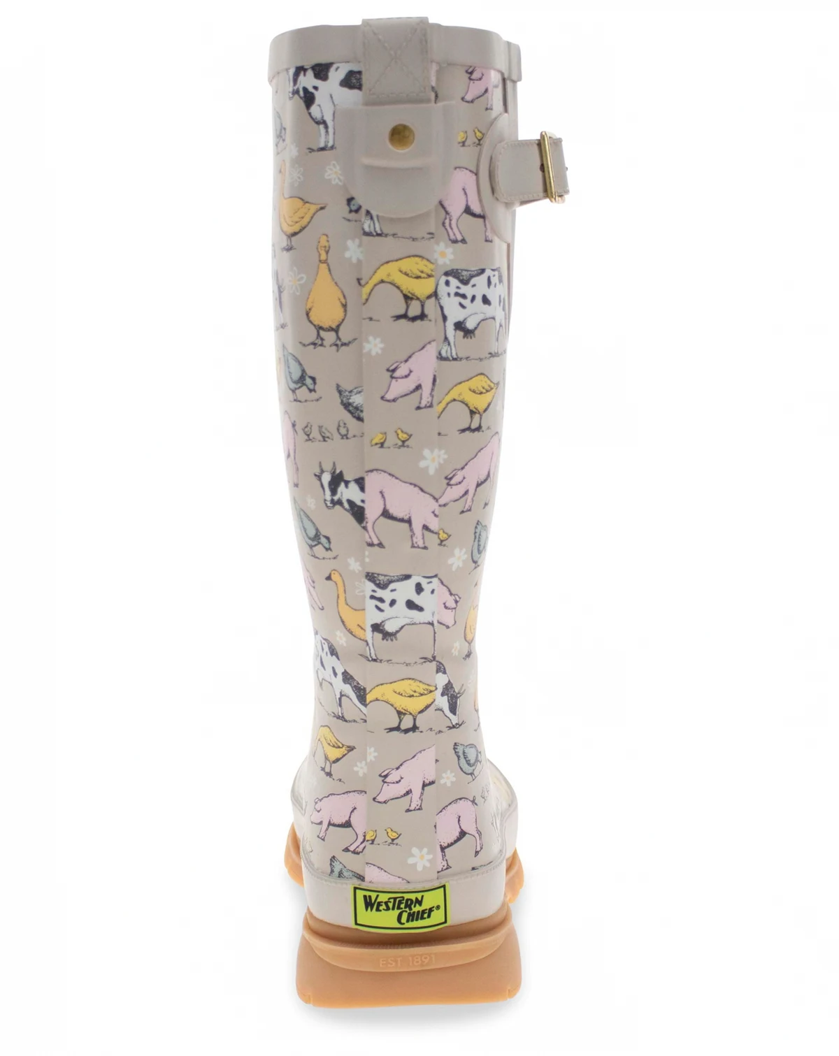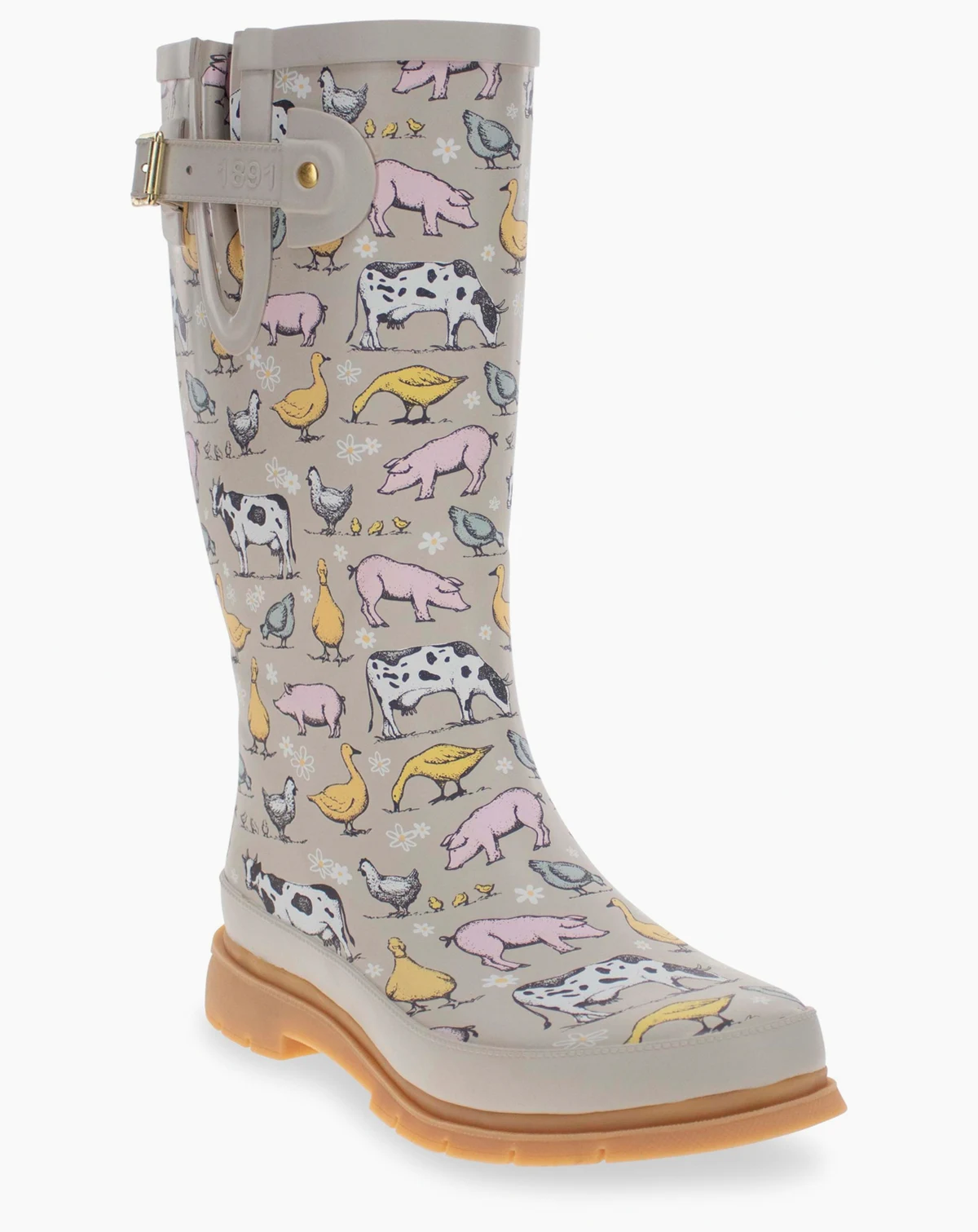 Cows pigs and chickens oh my! Have some fun on the farm with these tall taupe rain boots for women.