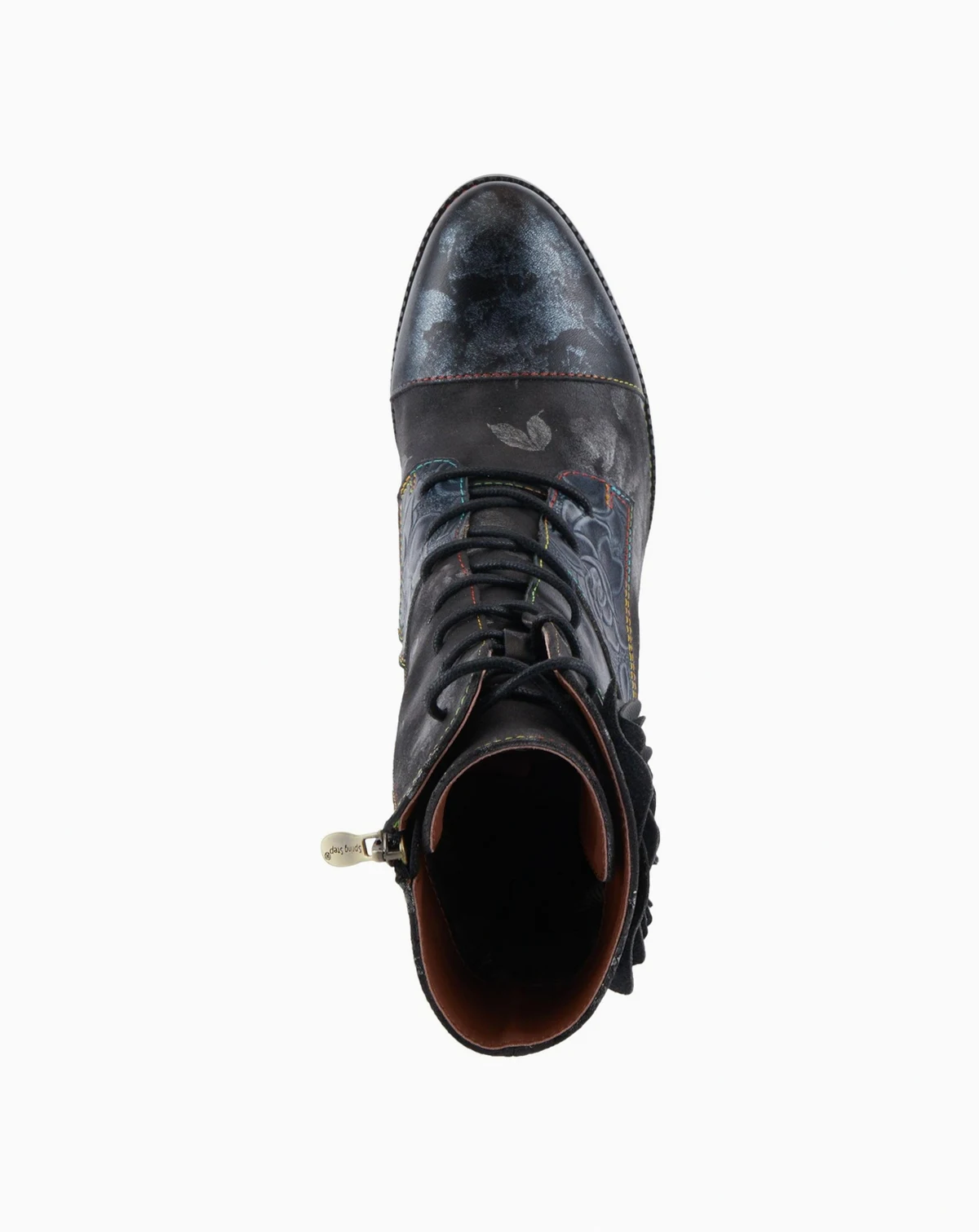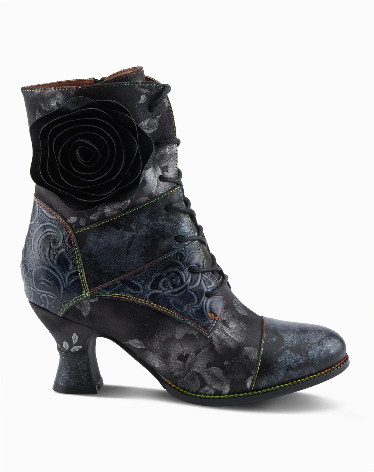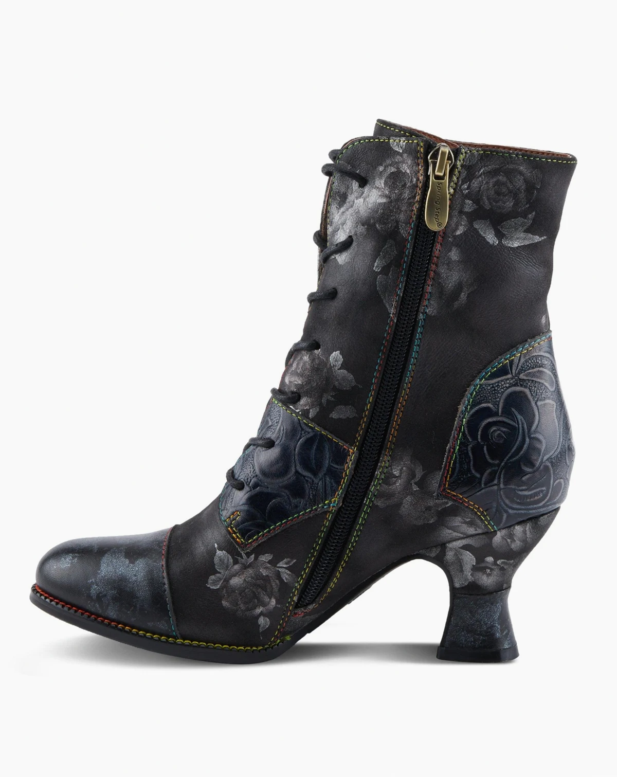 Make a bold statement in the ROSELIA-STUNIN bootie by L'Artiste. This fashion-forward style features a leather combo upper with a blooming mix of floral prints, handpainted flowers, and metallic shine. A wrapped salsa heel adds graceful height, while rainbow stitching along the welt adds playful contrast. Designed for comfort and wearability, it includes a soft velvet lining, cushioned insole, and a side zipper for easy on-and-off. Perfect for elevating any outfit with vintage flair and modern edge, this lace-up bootie is your new go-to for making an entrance. Fits true to size.