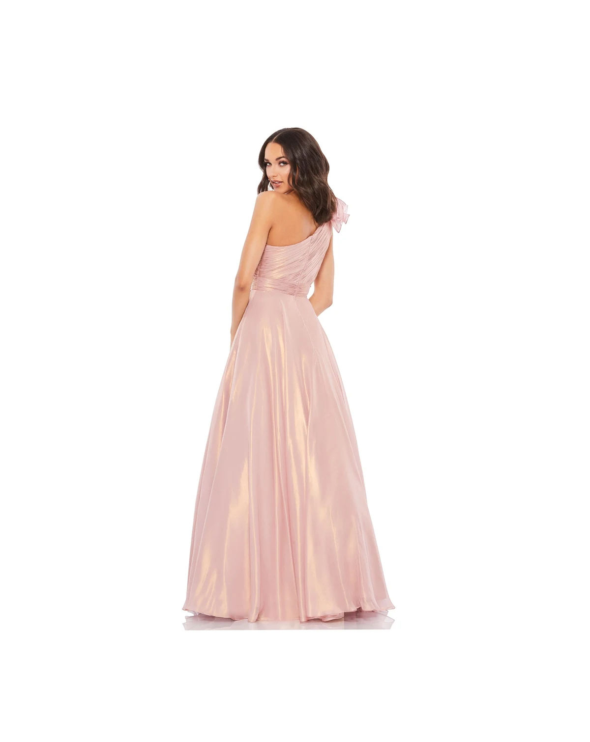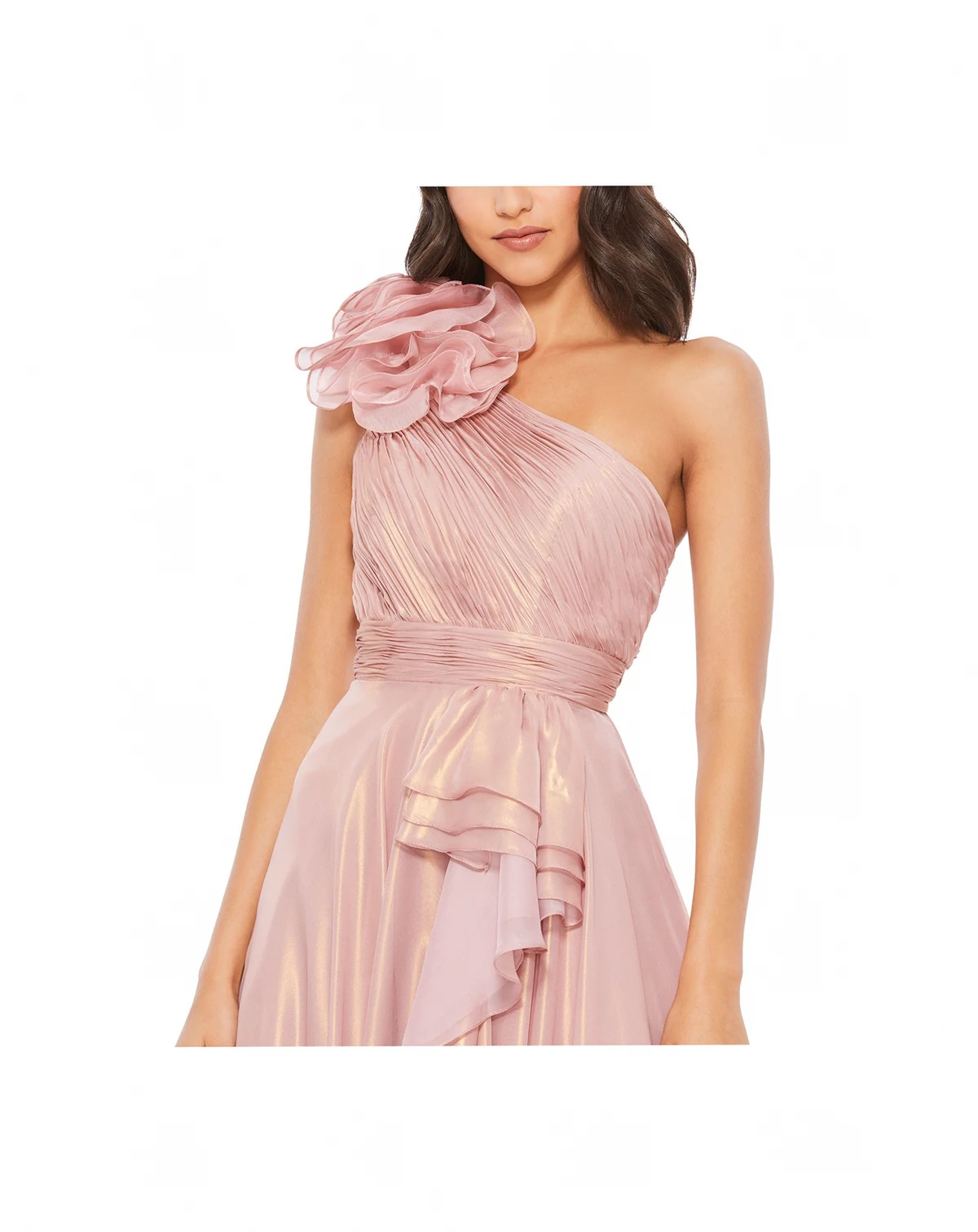 One-shoulder organza ballgown with a pleated bodice, pleated waistband, and a dramatic rosette accent at the shoulder. The full a-line skirt is layered with tulle for added structure and features cascading ruffles down the front.