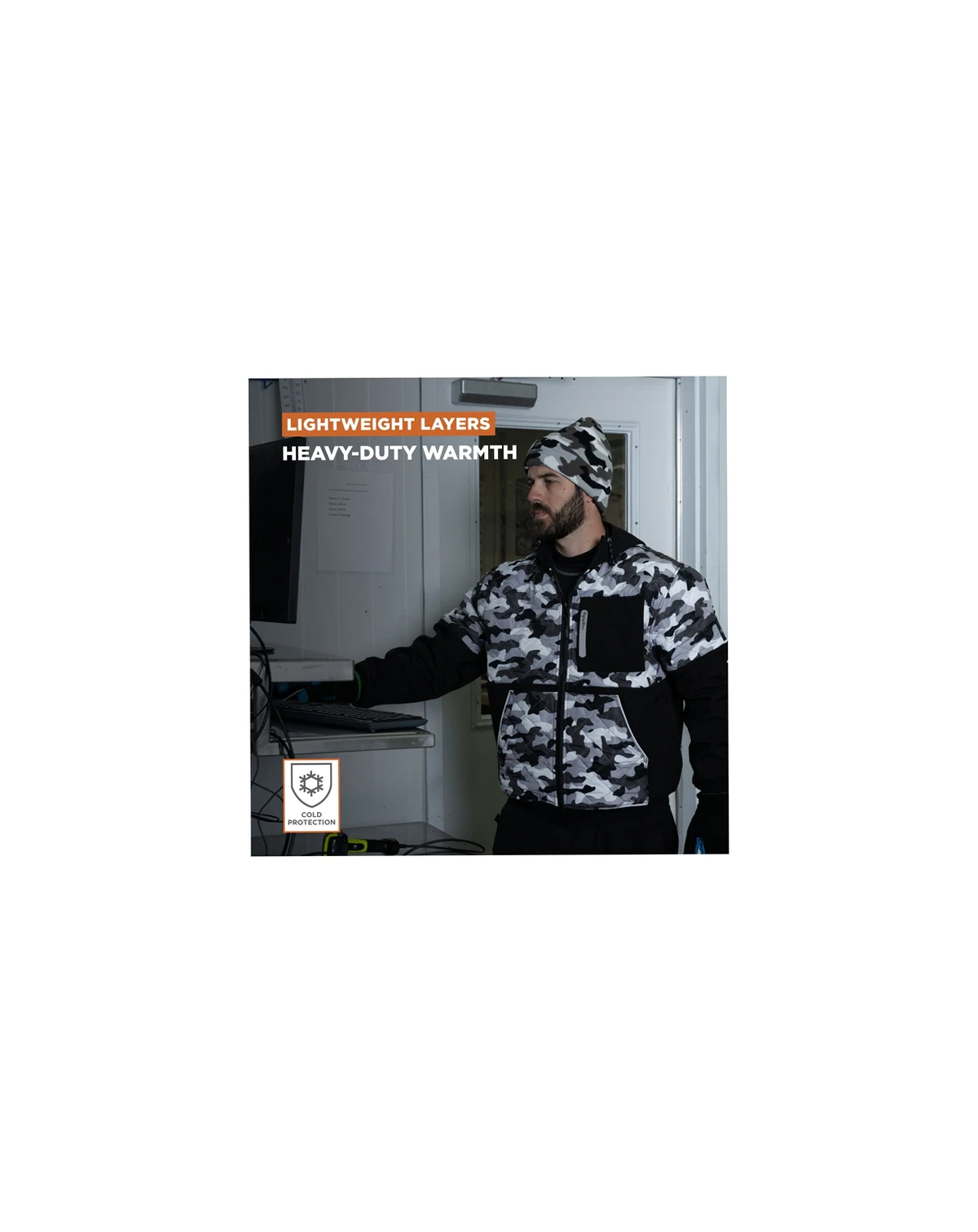 Stay warm and stylish with the RefrigiWear Camo Diamond-Quilted Insulated Softshell Hooded Jacket—a perfect blend of performance and design. Built for durability and warmth down to 20°F, it features diamond-quilted stitching, a softshell exterior, and a full-zip front for easy movement. The camo pattern adds a modern edge, while the hood with drawstring, ribbed cuffs, and ample pockets provide comfort and function. Whether on the job or outdoors, this rugged jacket keeps you protected and ready for anything. Sizing Instructions: For the most accurate fit, take your measurements over the base layer of clothing you intend to wear with this RefrigiWear gear (such as thermal underwear, jeans or a sweatshirt) and refer to the size chart for this product.