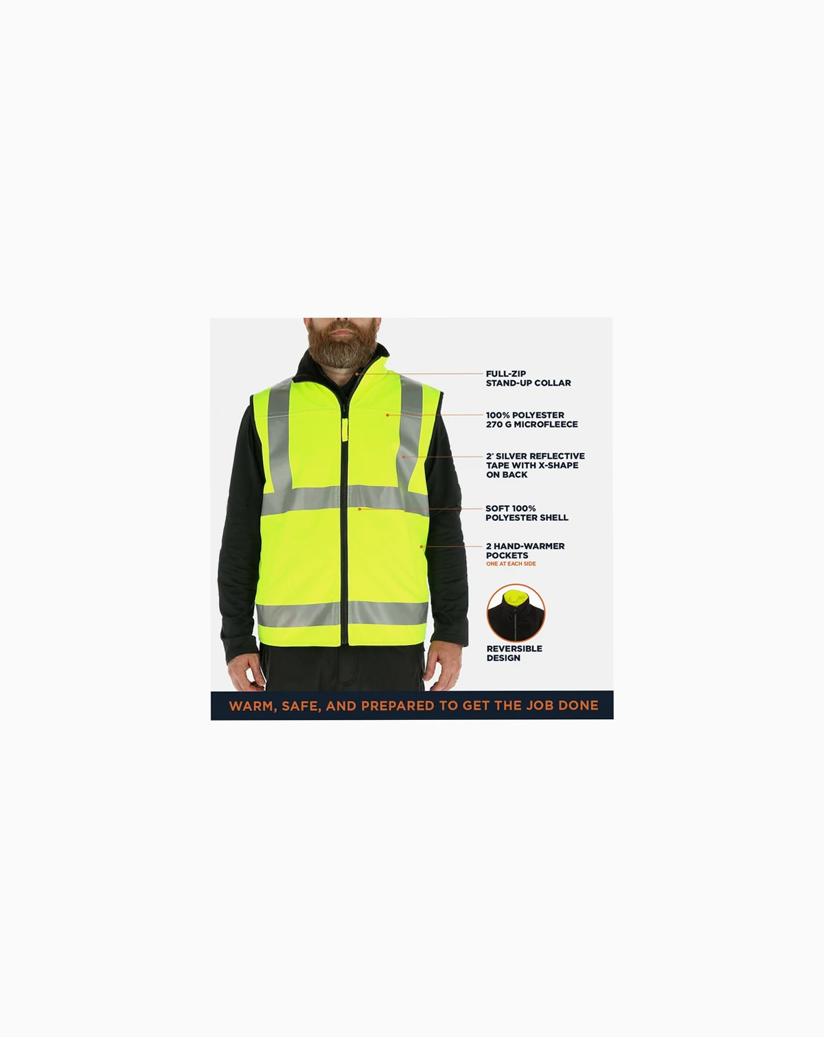 Stay mobile. Stay protected. Stay seen. Our HiVis Reversible Softshell Vest gives you full freedom of motion while protecting your core from Mother Nature's worst. It's perfect for changing conditions, reversing between HiVis for low visibility conditions and black when HiVis isn't necessary. The HiVis Reversible Softshell Vest boasts a 270g fleece interior, over 300g of insulating power, hand warmer pockets, a soil-resitant Teflon coating, and it's ANSI Class 2 compliant. No matter what you're facing, we've got your back. At RefrigiWear, Softshell works hard. Sizing Instructions: For the most accurate fit, take your measurements over the base layer of clothing you intend to wear with this RefrigiWear gear (such as thermal underwear, jeans or a sweatshirt) and refer to the size chart for this product.