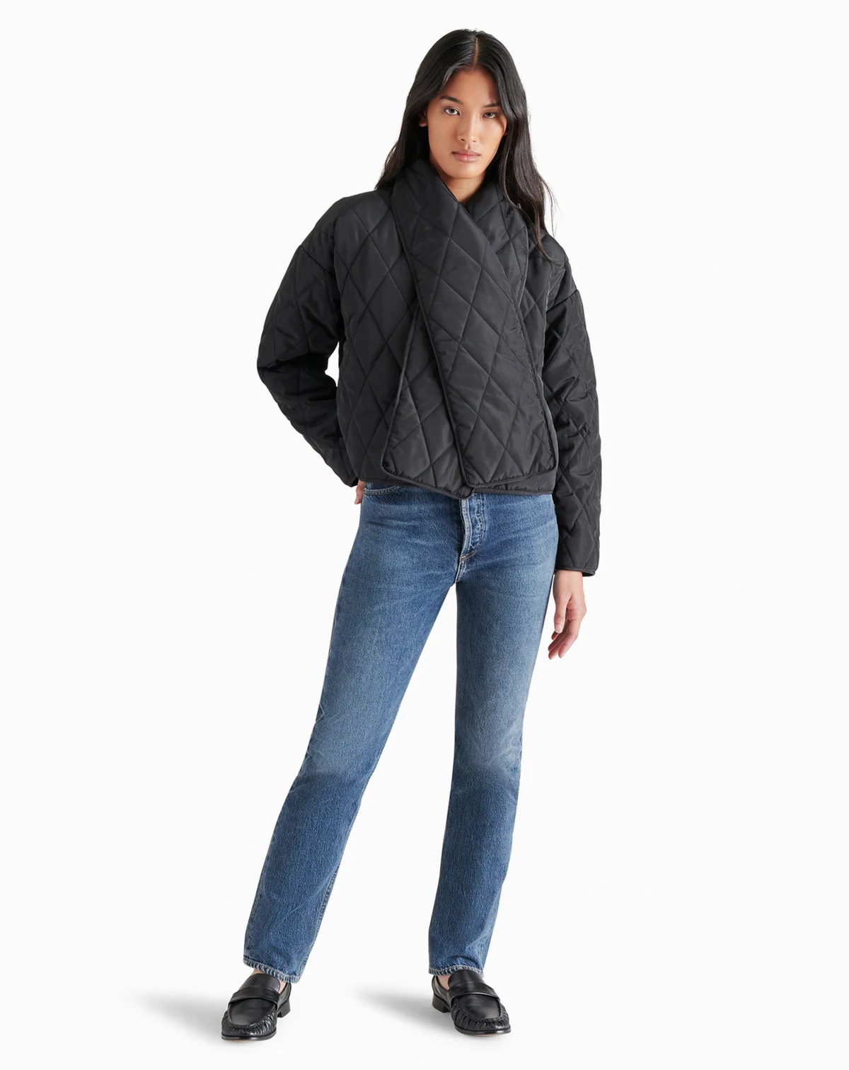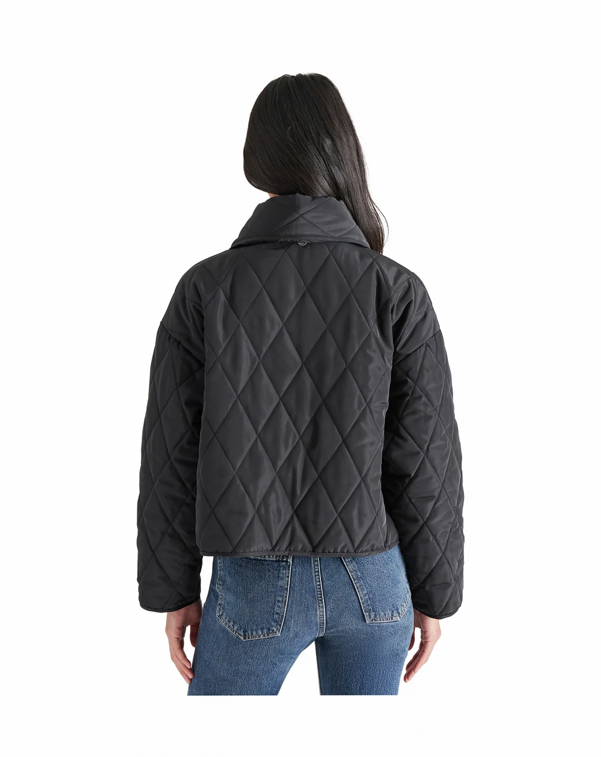 Stay cozy and stylish with this women's quilted jacket from Steve Madden, complete with a detachable scarf for added warmth and versatility.