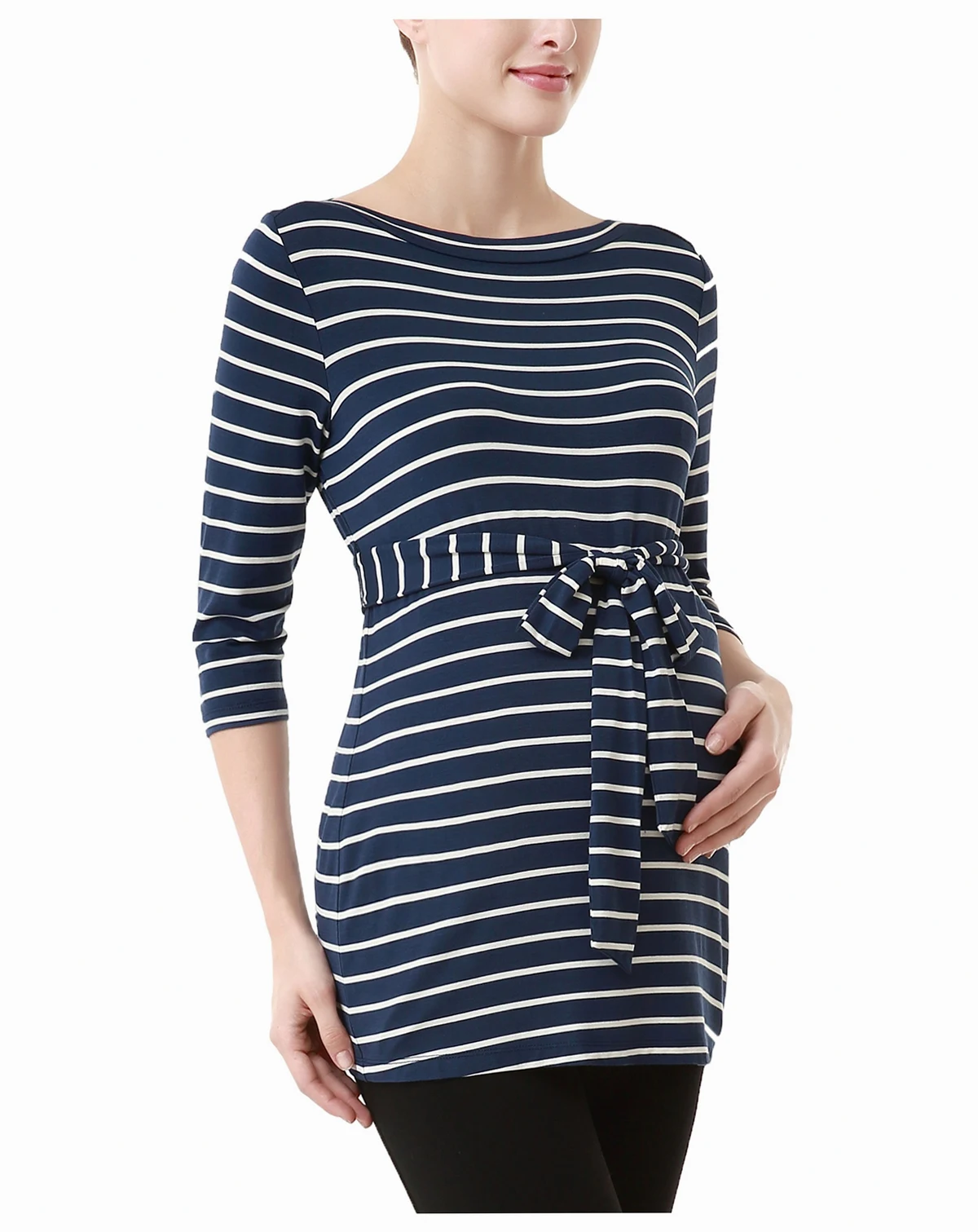 Add nautical flair to your maternity wardrobe with our updated breton striped boat neck top. The classic coloring and empire waist sash gives this style just the right amount of sea worthy appeal.