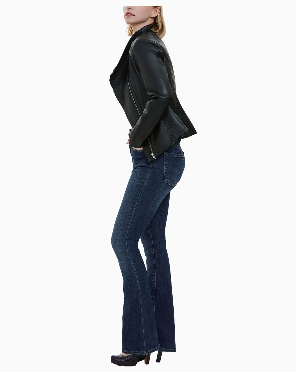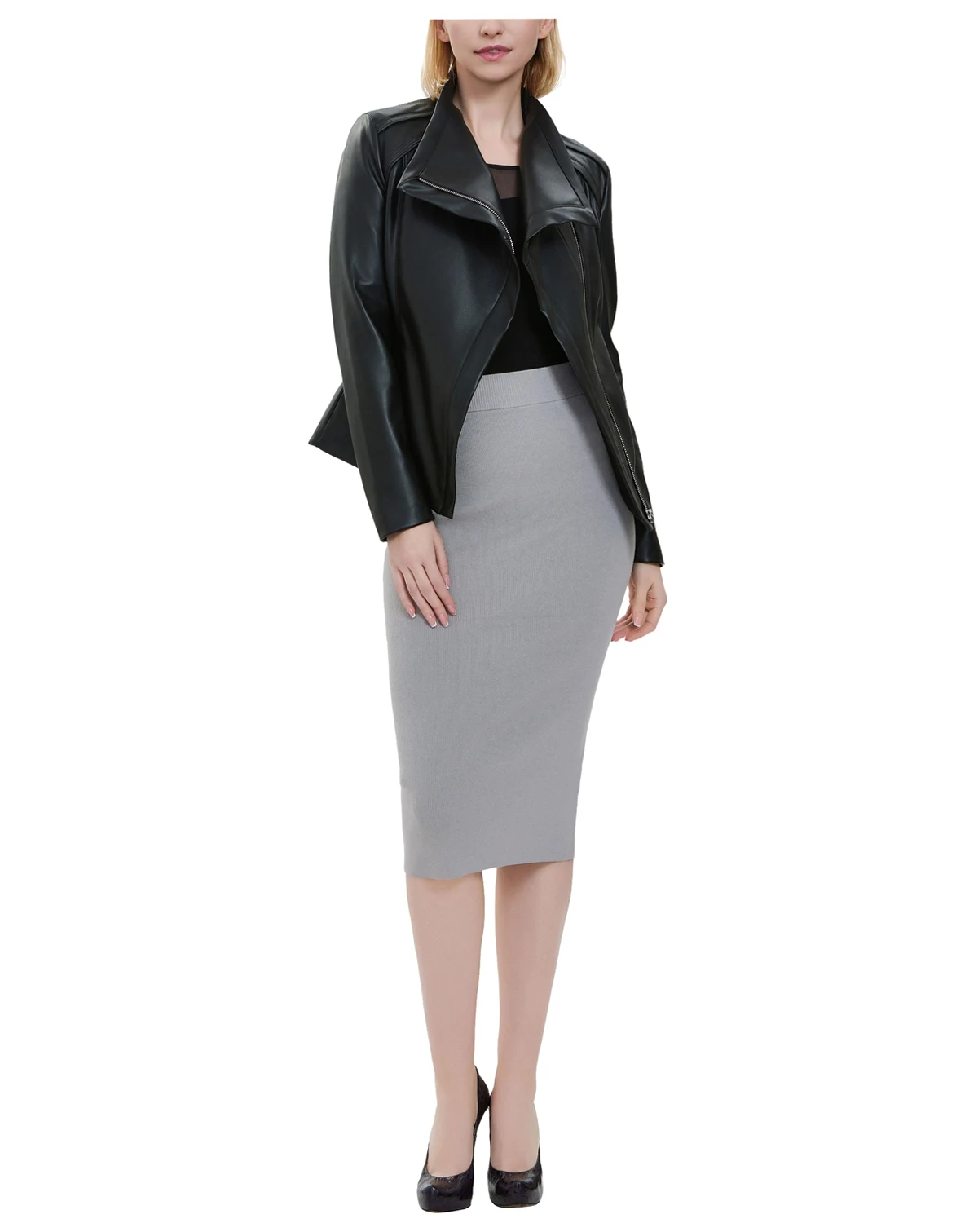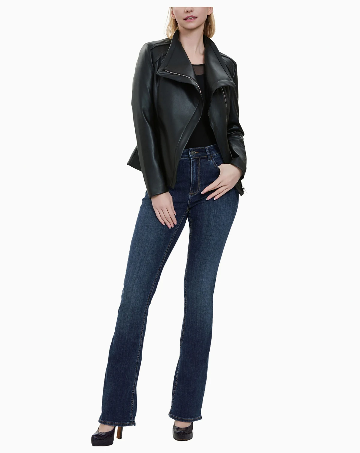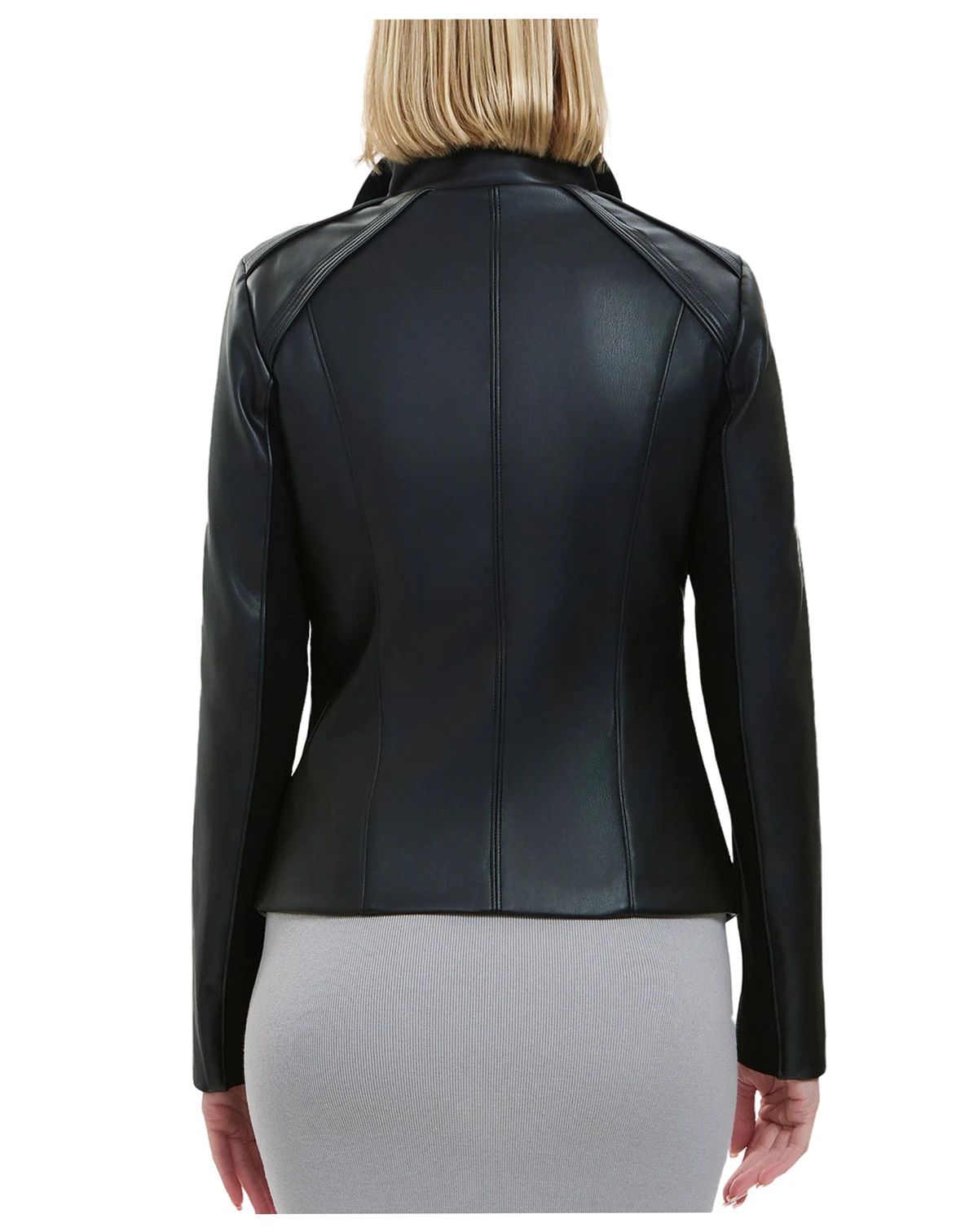 Elevate your wardrobe with this sleek and stylish black faux leather jacket, designed to add a touch of edge to any outfit. Featuring an asymmetrical zip closure and a wide, structured collar, this jacket effortlessly blends sophistication with modern flair. The smooth, supple texture and tailored fit create a flattering silhouette, while the long sleeves and subtle shoulder detailing enhance its chic appeal. Whether paired with jeans for a casual look or layered over a dress for an evening out, this versatile piece is a must-have staple for any fashion-forward wardrobe.