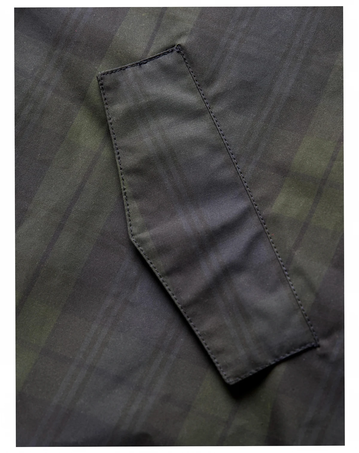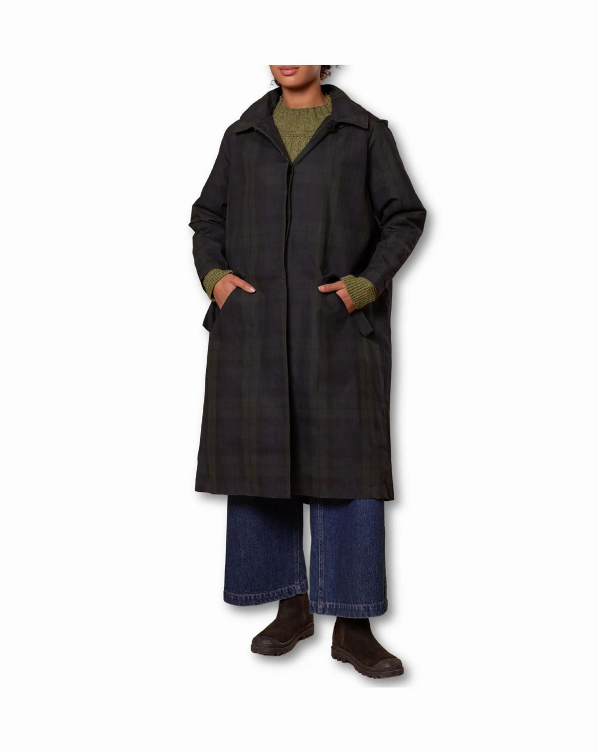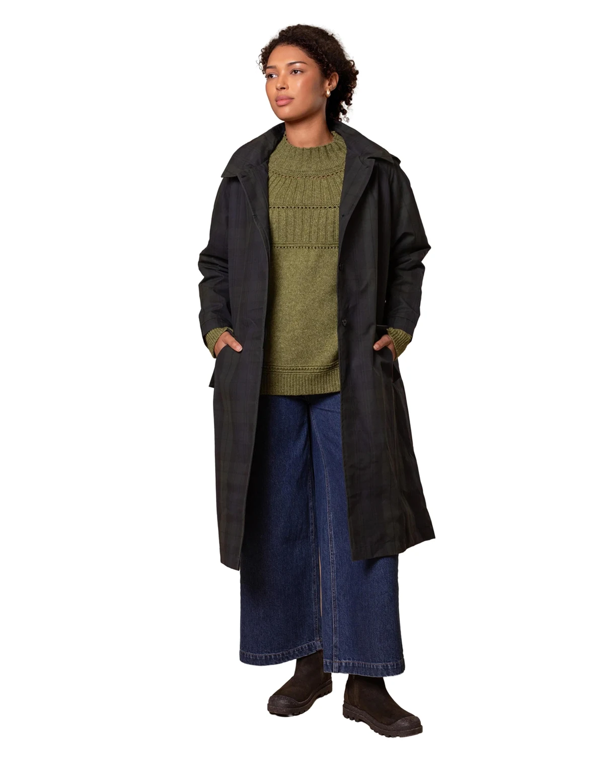This trench coat, made in Britain, features a collared neckline and an oversized, longline trench shape. It also includes a removable hood for versatile styling.
