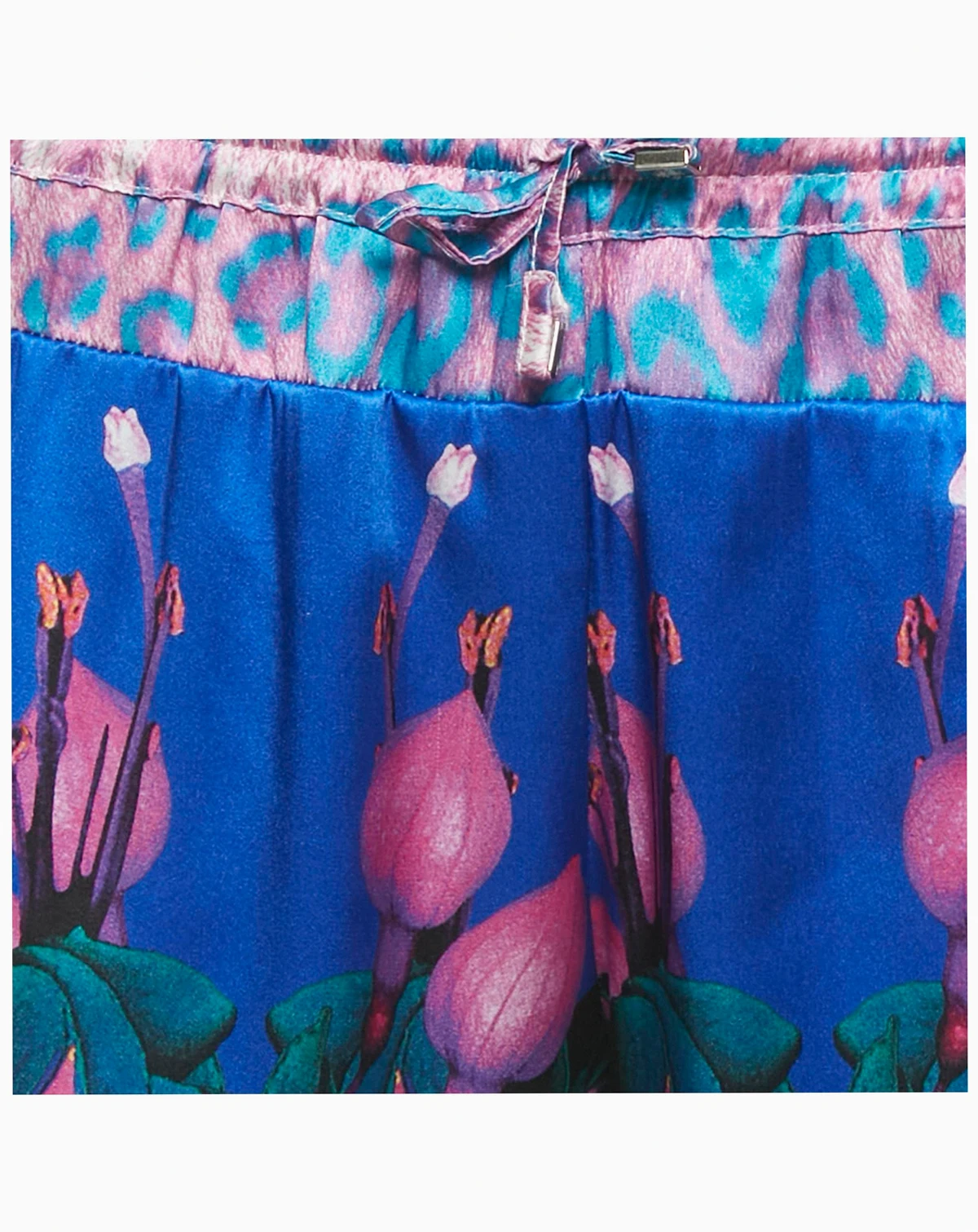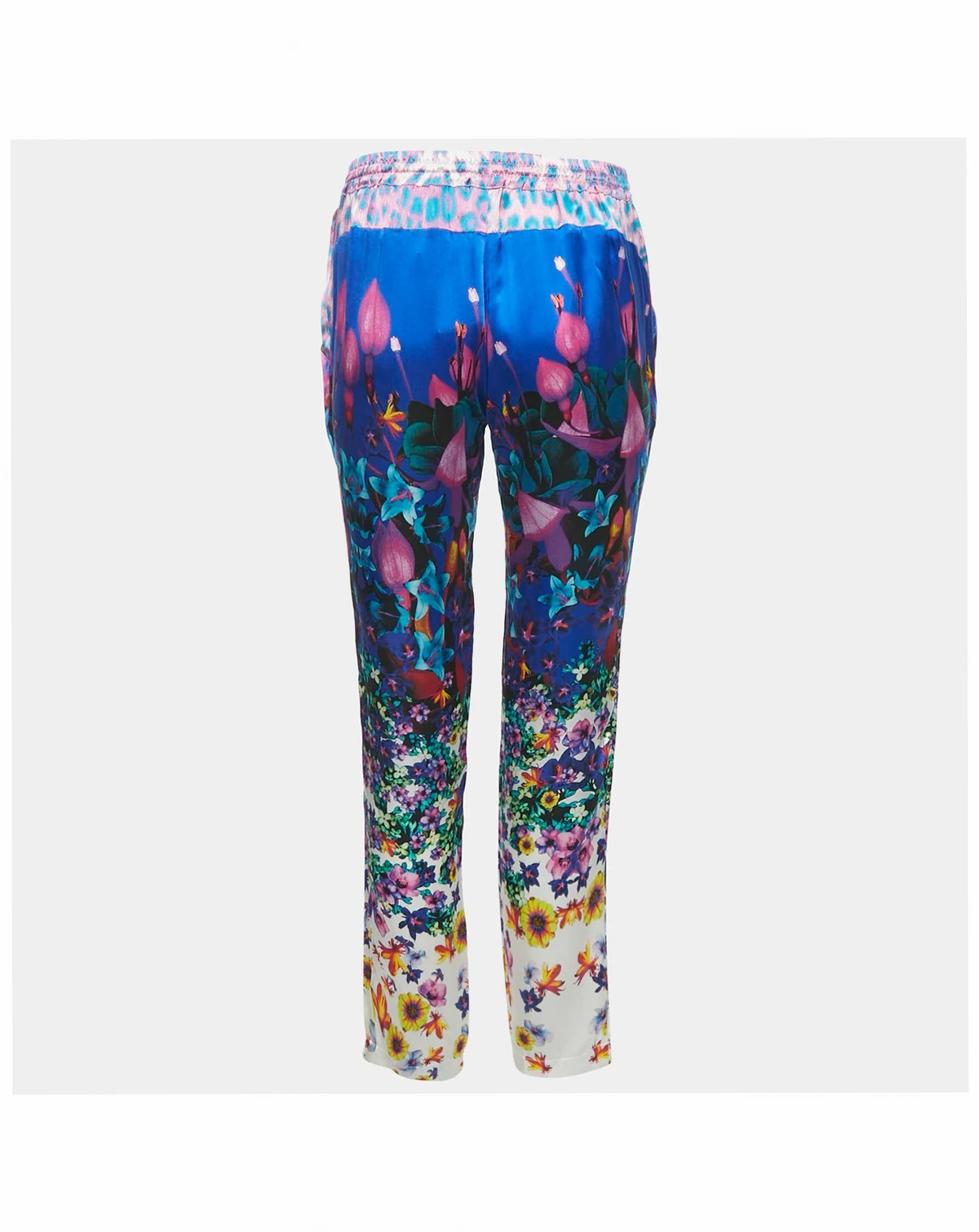 Roberto Cavalli s signature flair for opulence comes alive in these blue floral satin trousers. The fluid drape and vibrant print create a sense of motion embodying the brand s bold femininity. Perfect with a silk blouse or tailored blazer they bring an air of Italian confidence to any occasion.