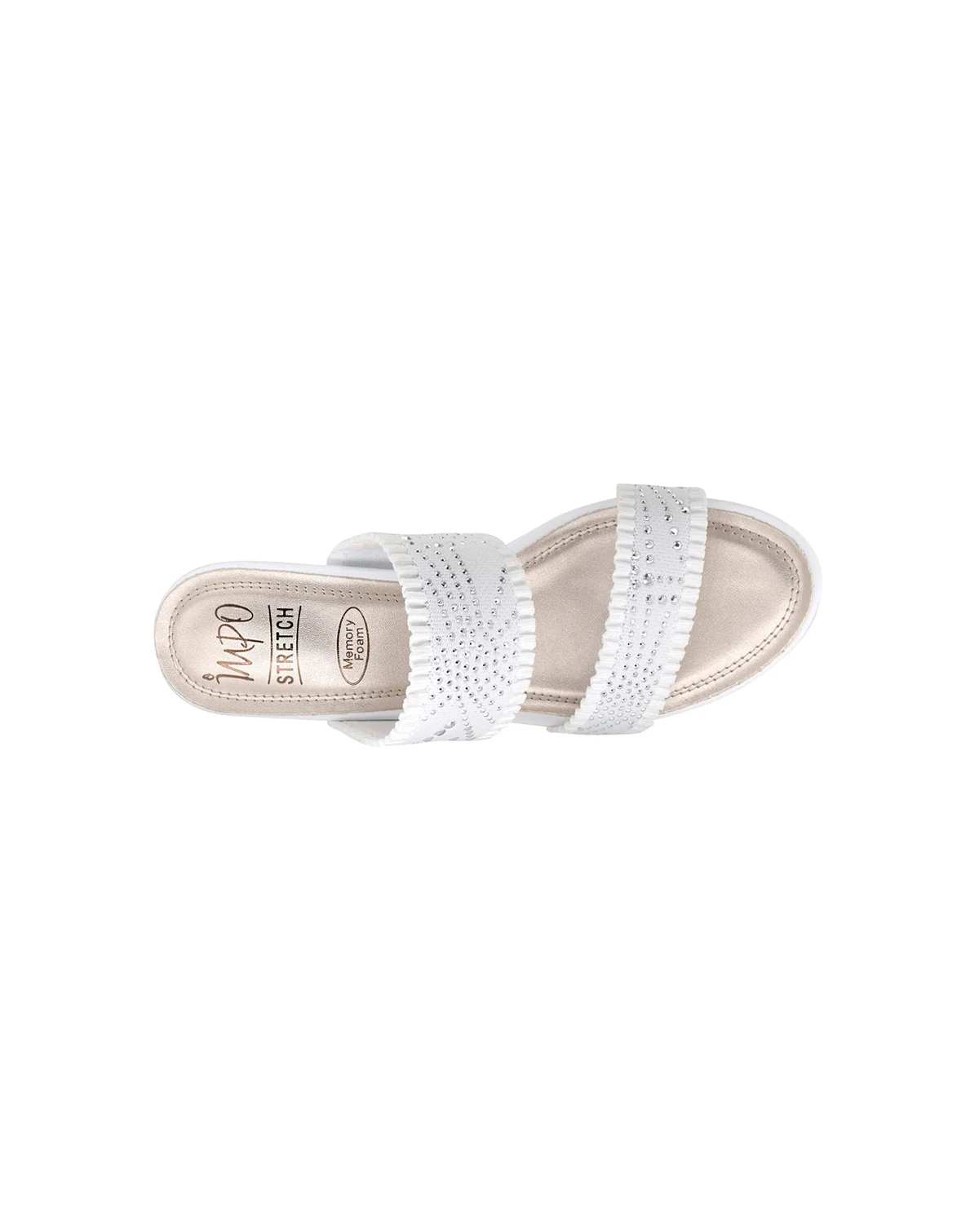 Casual chic meets feminine flair in Verbena. Two-band stretch elastic and sunray design with micro studs. Easy slide-in, round open toe and cushioned memory foam. Walkable wedge in black, white or midnight blue. Effortlessly flatter your feet with comfort and style. 2.75" wedge.