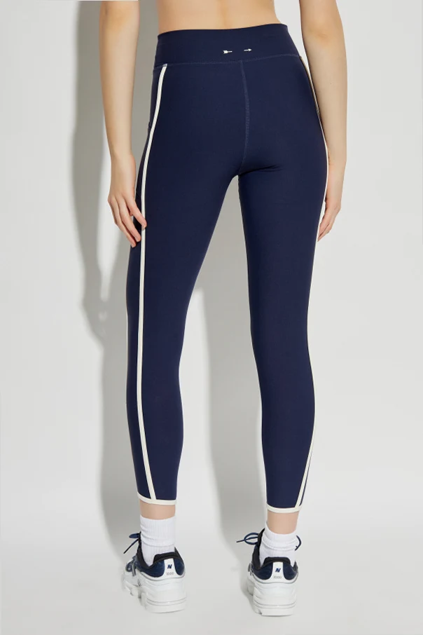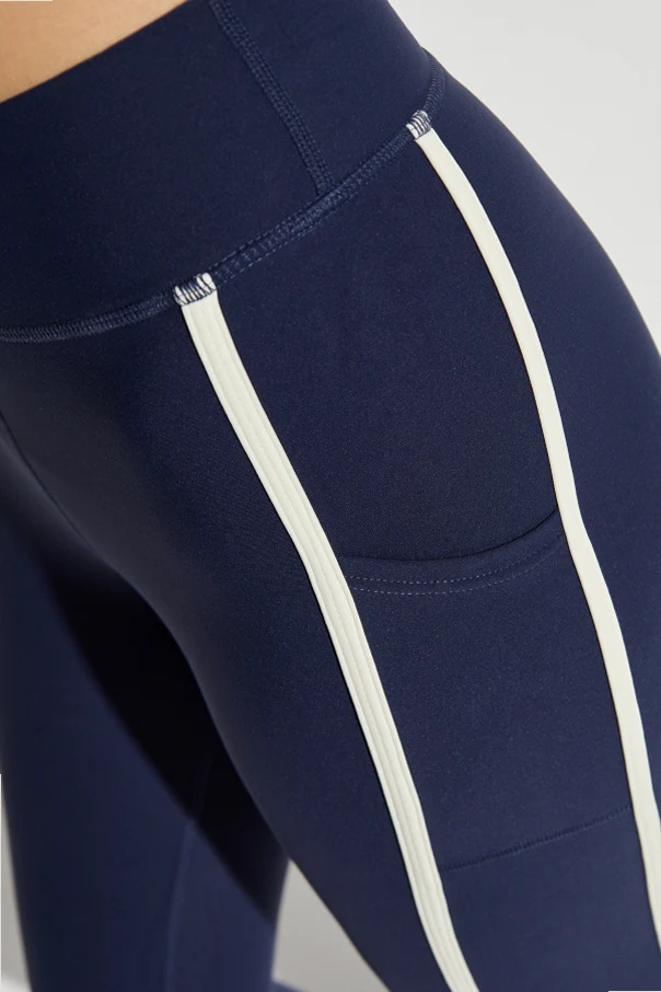 The Samara Leggings by The Upside embody elevated simplicity, crafted for the discerning woman who values both form and function. Designed in a deep navy hue accented by distinctive white side stripes, these leggings employ a luxurious technical fabric that seamlessly contours the silhouette. The high-rise fit and generous, elasticized waistband offer unparalleled comfort and support, making these leggings as flattering as they are practical.