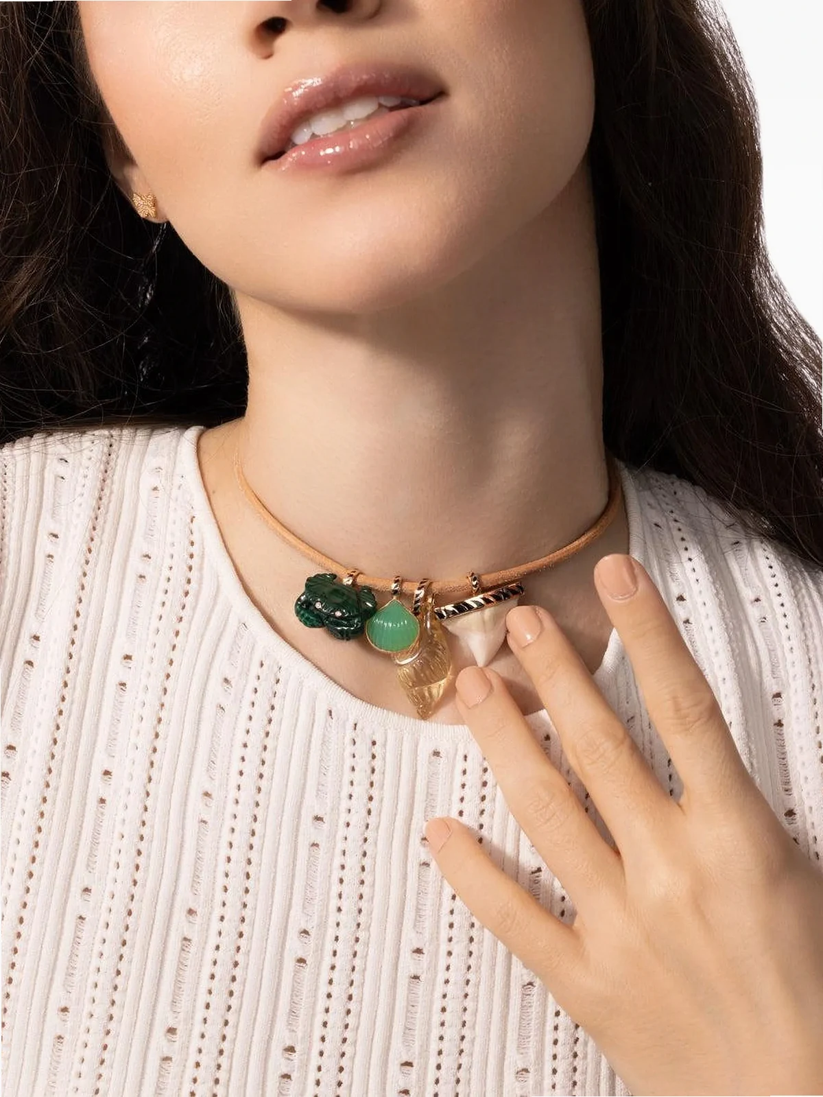 Normal everyday use and external agents may reduce the lustre of gemstones and gold surfaces. To maintain, use specific, non-abrasive products specially meant for cleaning jewellery.