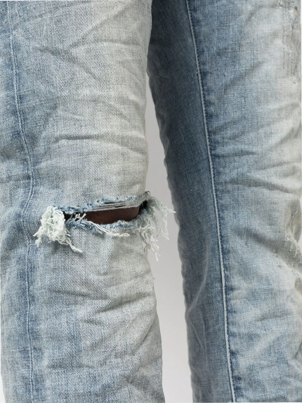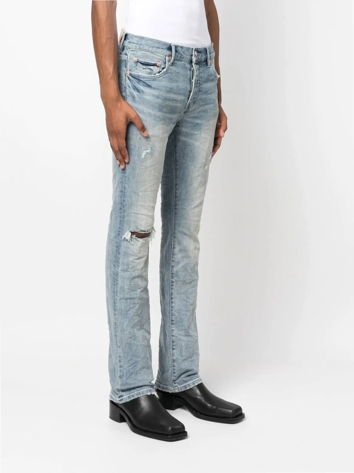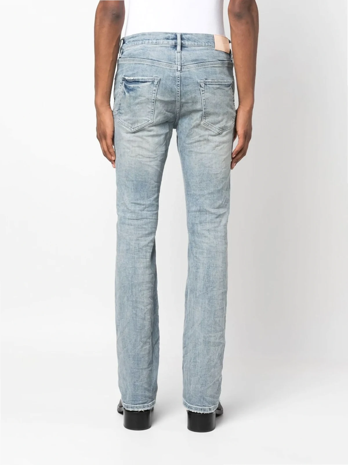 indigo blue cotton blend ripped detailing faded effect bootcut mid-rise classic five pockets belt loops logo patch to the rear