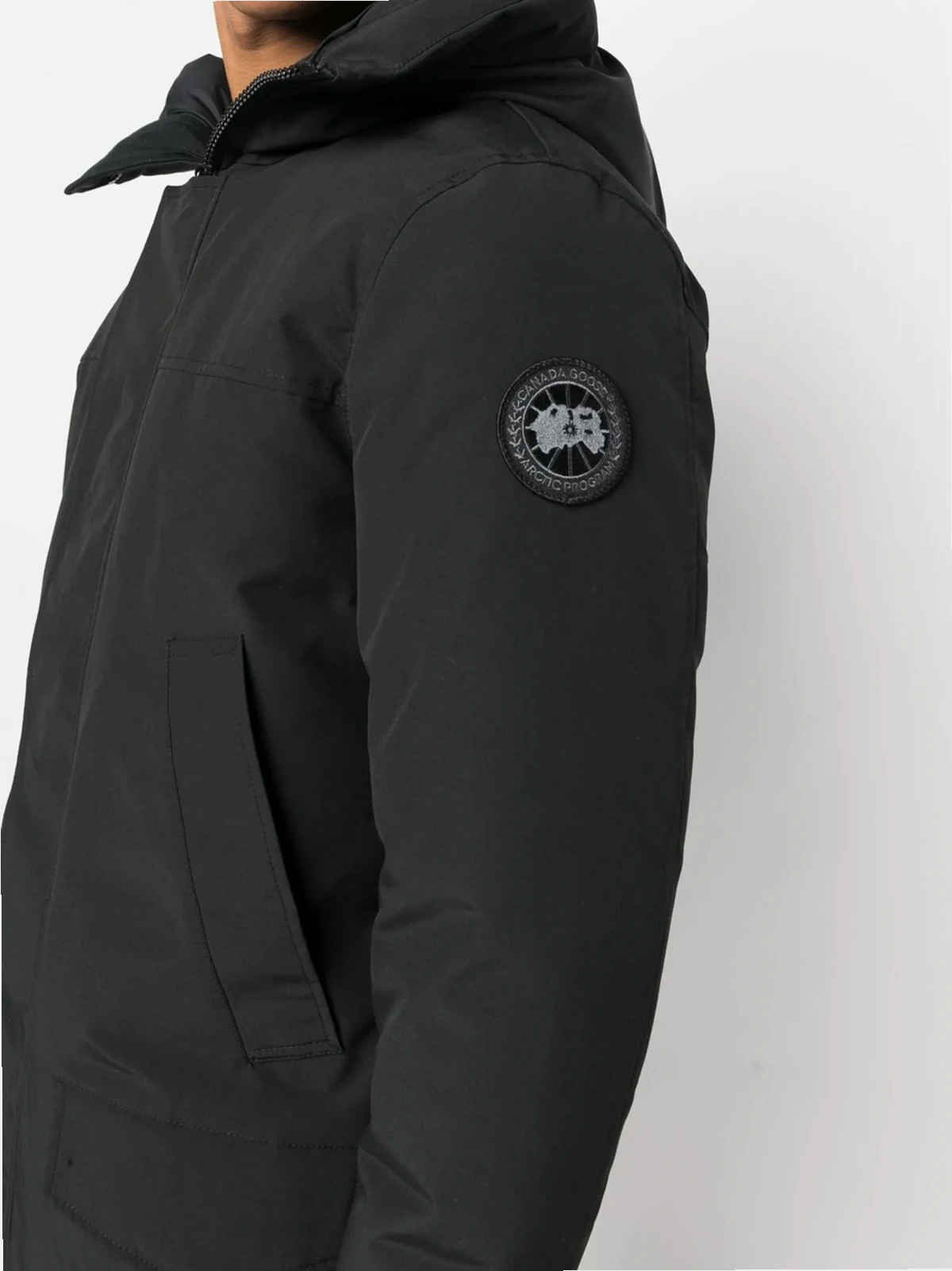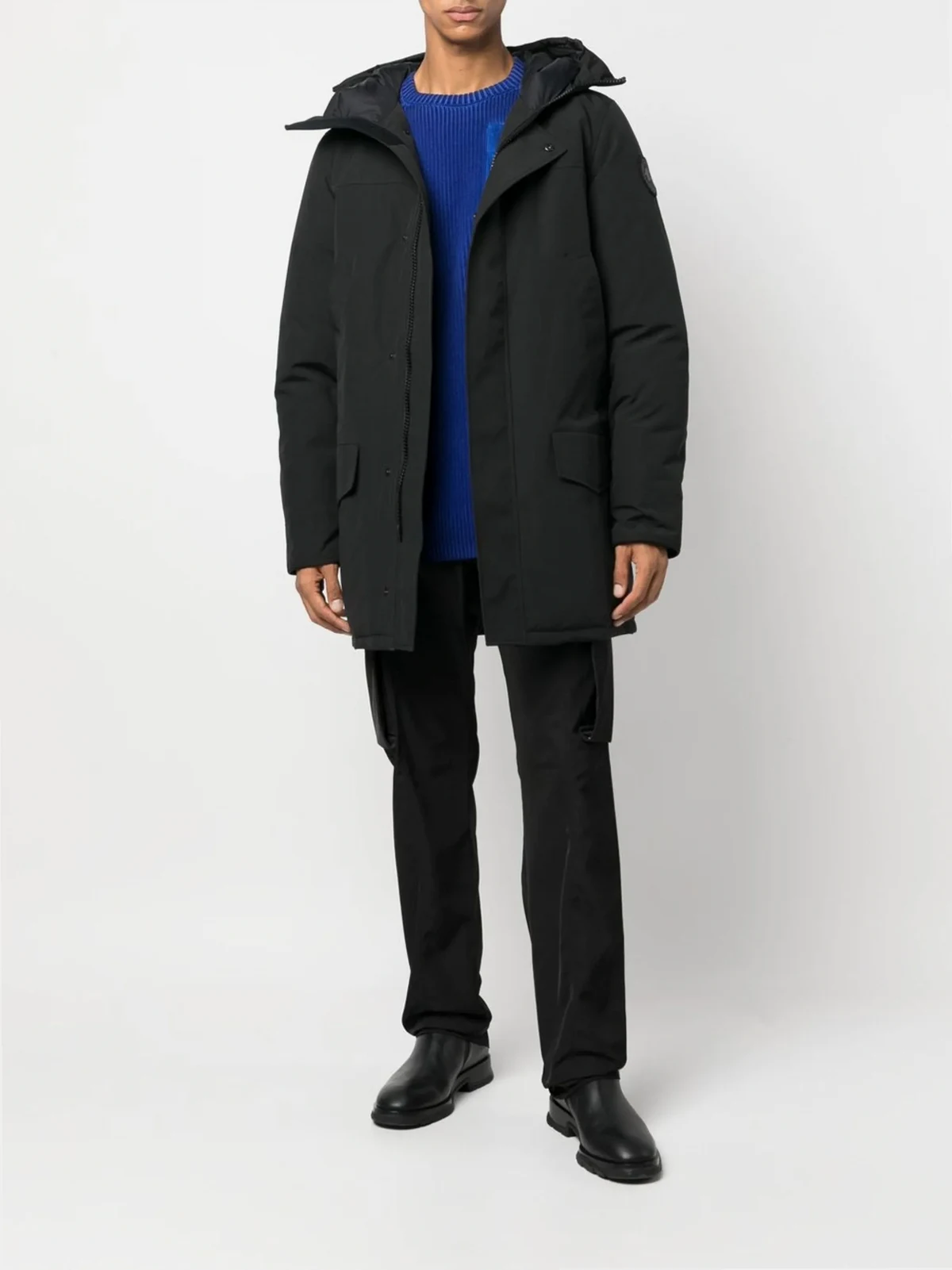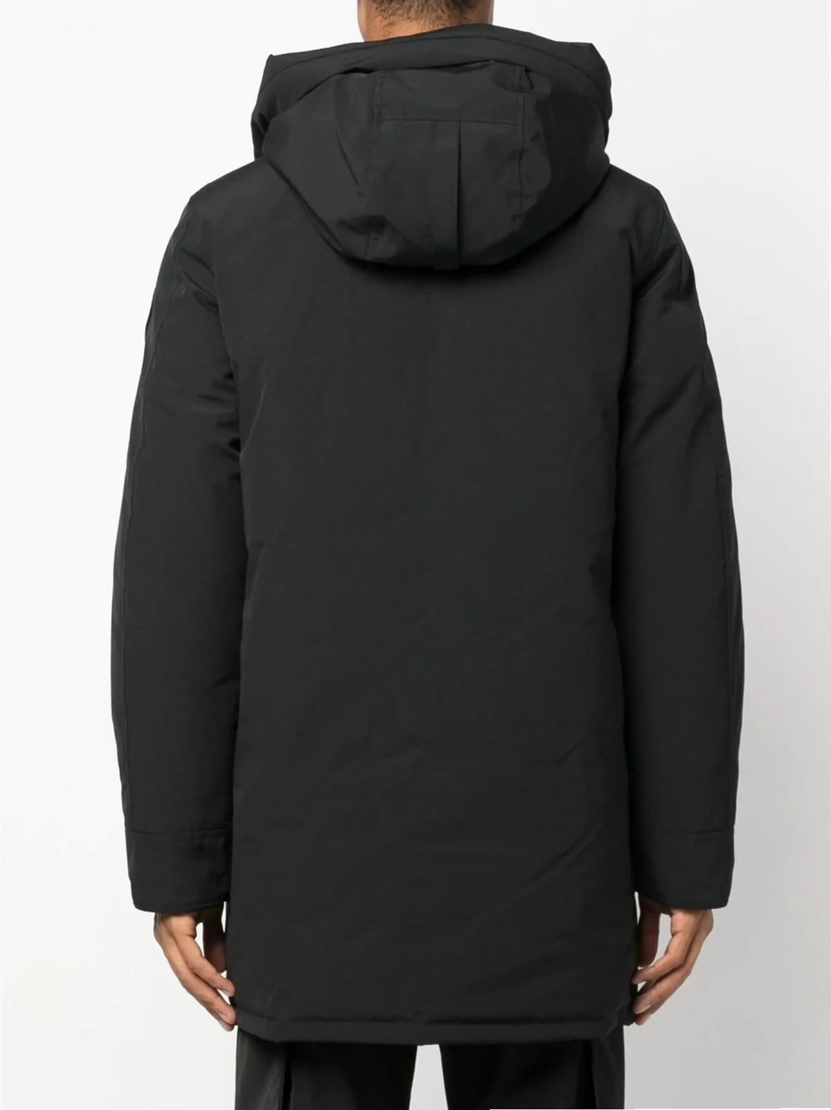 black cotton blend logo patch at the sleeve classic hood concealed front fastening long sleeves two side slit pockets two front flap pockets straight hem mid-length