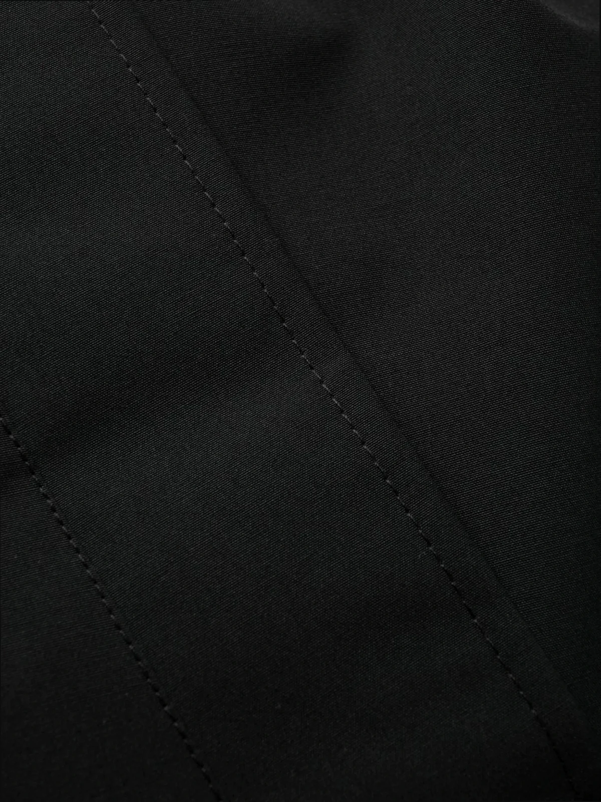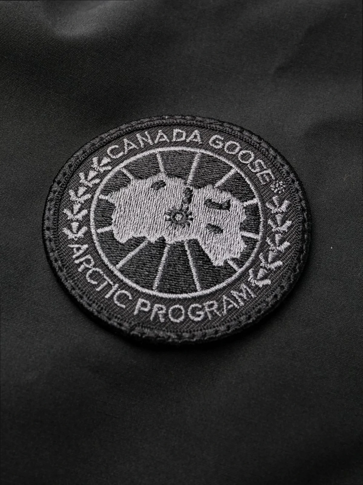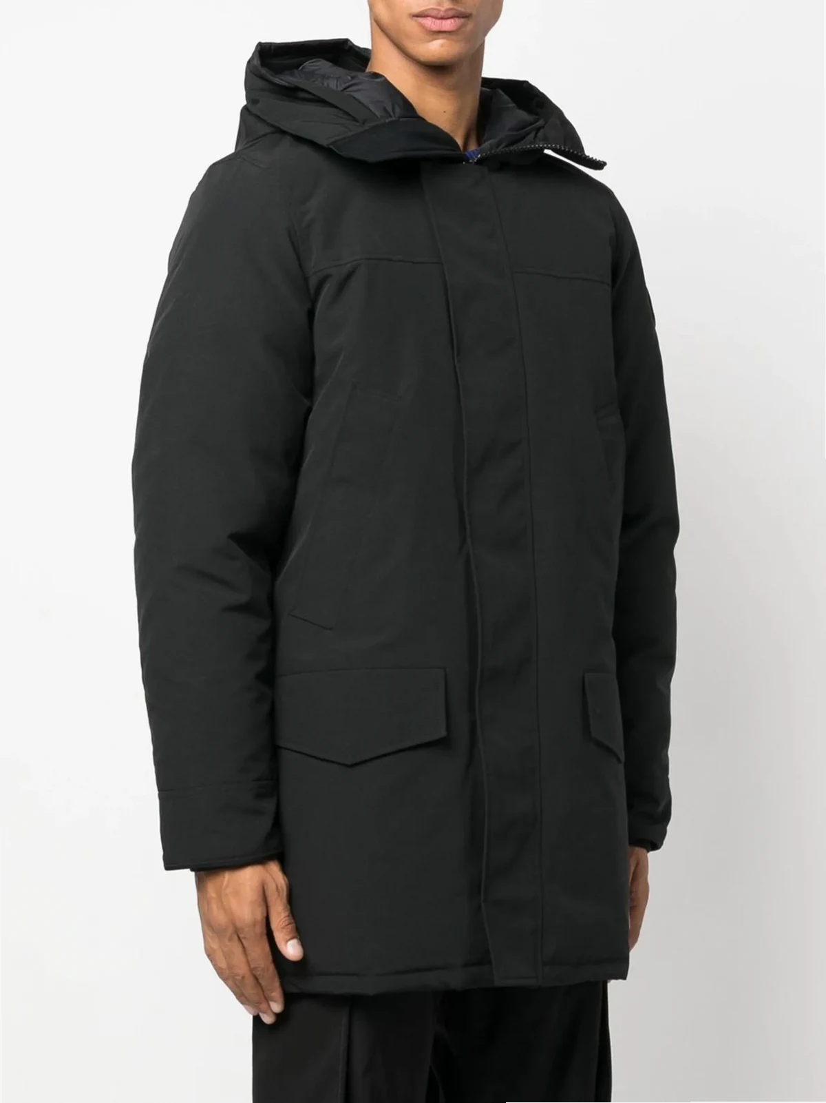 black cotton blend logo patch at the sleeve classic hood concealed front fastening long sleeves two side slit pockets two front flap pockets straight hem mid-length