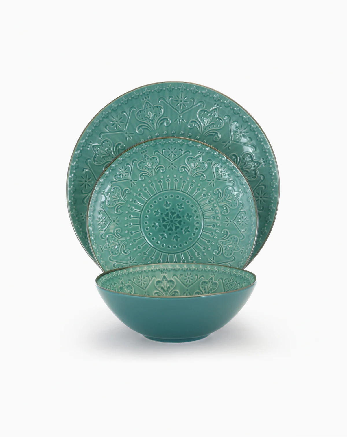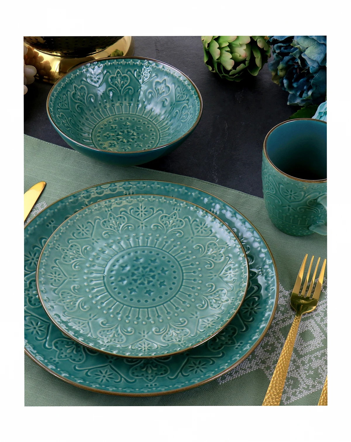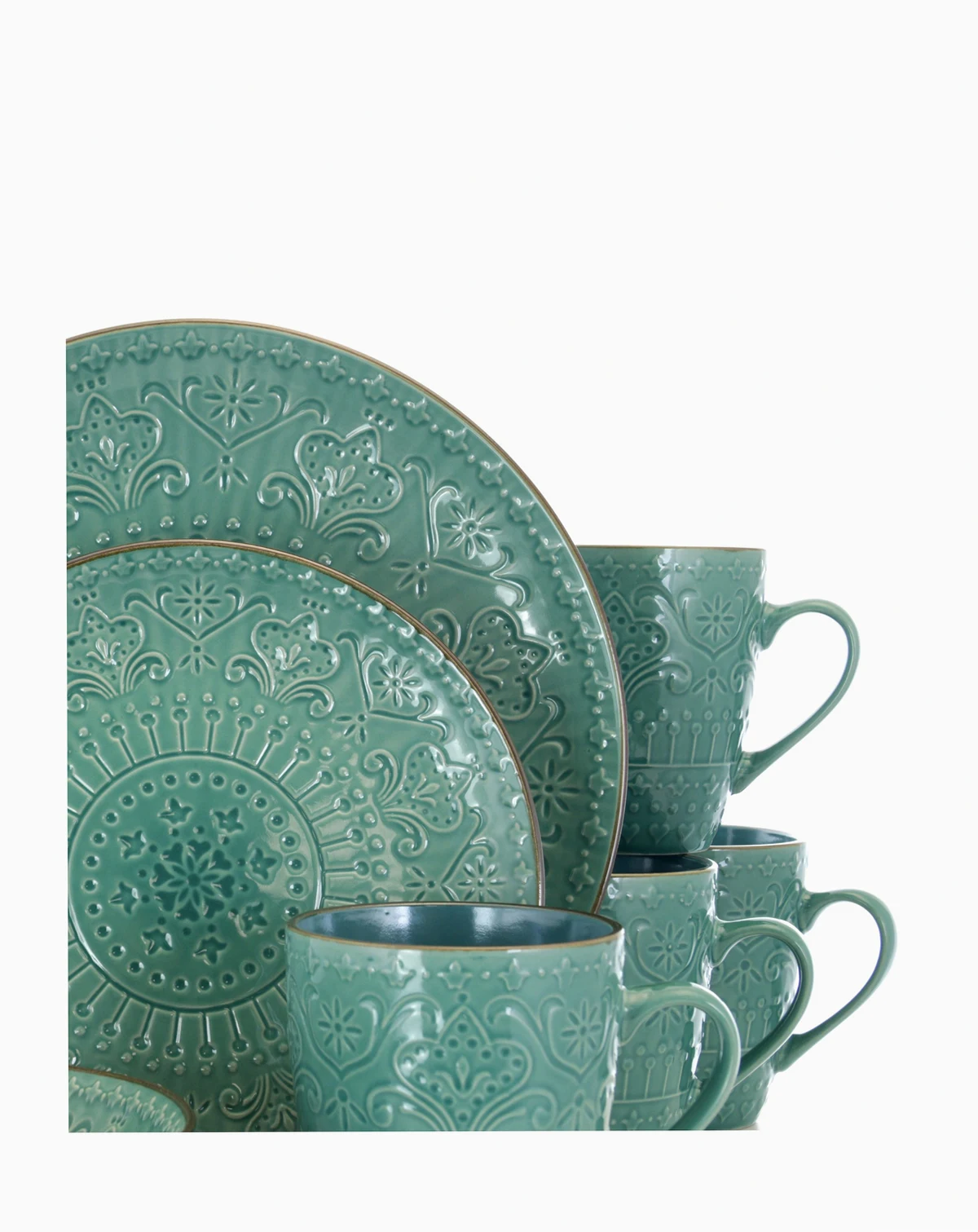 Freshen up your table setting with the textured 16 piece dinnerware set by Elama. With a calming tone of sea green and textured mandala style designed plates, this set is ready to make a statement at your next gathering.